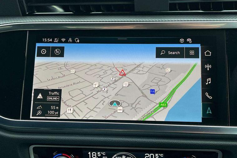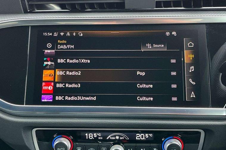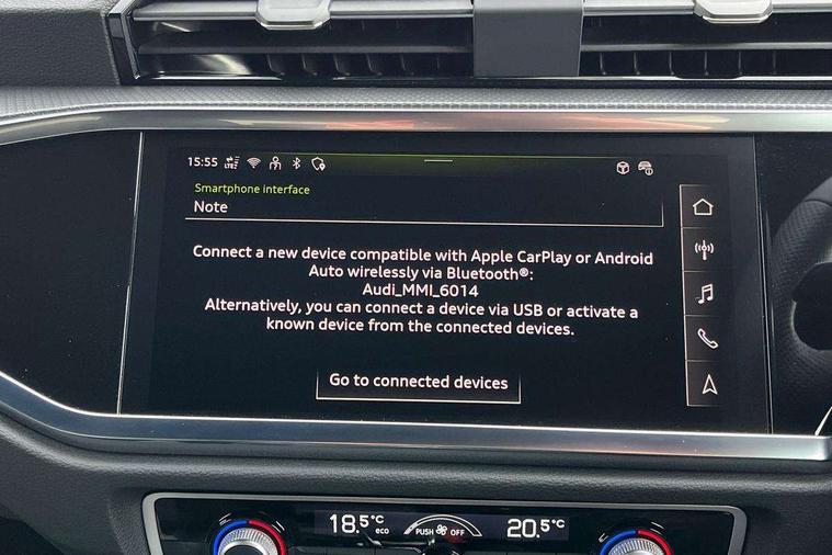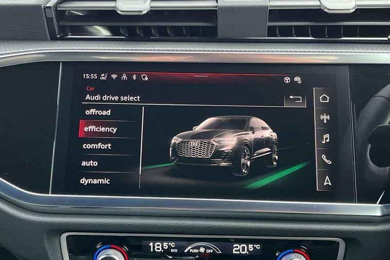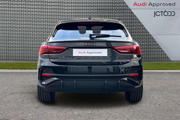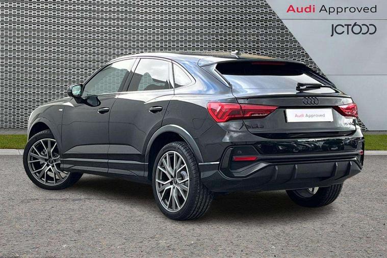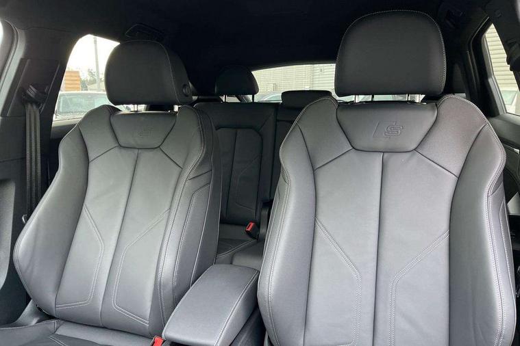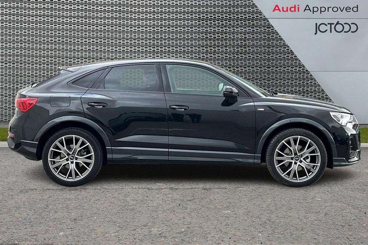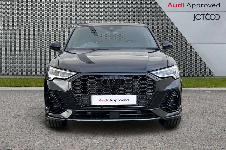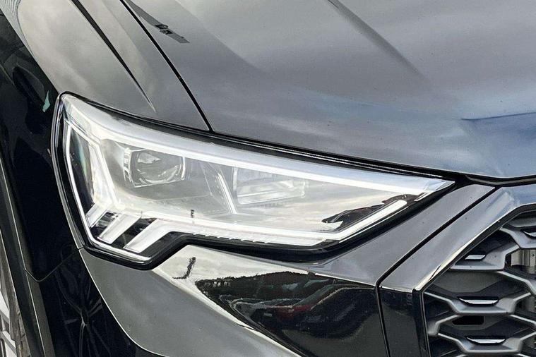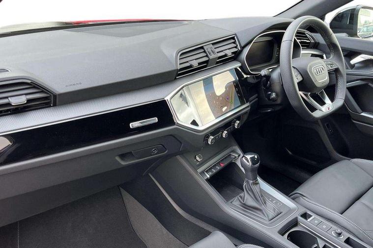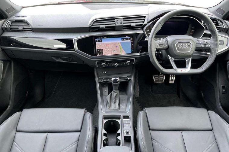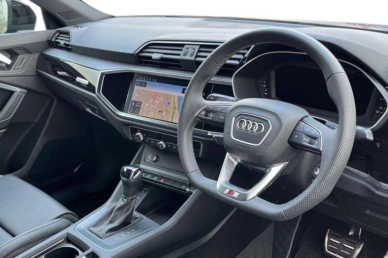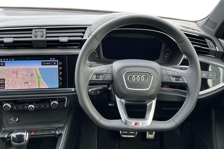 Audi connect safety and service, Audi drive select, Audi lane departure warning, Audi Virtual Cockpit - 10.25" display, Bluetooth interface, Camera based traffic sign recognition, Distraction and Fatigue warning, Legal emergency call, MMI Navigation Plus with high resolution 10.1 inch touchscreen colour display, Power operated tailgate, Progressive steering, Service interval indicator, Smartphone interface includes wireless Apple carplay/Android Auto, Start stop system with recuperation, Voice control system with natural language interaction, Sports suspension, 2 USB-C ports with charge and data functions, 6 passive loudspeakers, DAB digital radio module, Acoustic windscreen, Audi Beam uses LEDs to project the Audi logo onto the ground as you exit your Q3, Auto dimming door mirrors, Auto dimming frameless rear view mirror, Electrically folding, adjustable and heated door mirrors with integrated LED side indicators and kerb view function for passenger side, Front and rear electric windows, Front fog lights, Front underbody protection in manhattan grey paint finish, High gloss black finish B and C pillars, Honeycomb design radiator grille in matt anthracite black, LED Dynamic rear indicators, LED headlights with LED daytime running lights, LED rear lights, LED third brake light, Privacy glass dark tinted rear and rear-side windows (from B-pillar backwards), Rain and light sensors, Rear diffuser grille in grained matt black, Rear diffuser strip in matt anthracite black, Rear side wing doors, Rear underbody protection in matt black, Rear wiper, S line front and rear bumpers and side skirts in contrasting Manhattan grey paint finish, Variable front intermittent wipers, 12V socket in rear centre console, 3 seat bench in 2nd row, 40:20:40 folding with manual adjustment for 60:40 forwards/backwards position and backrest angle, Adjustable rear seat bench/backrest with centre armrest and cupholder, Black carpet mats, Black cloth headlining, Dual zone electronic climate control, Electric lumbar support, Front and rear black floor mats with contrast stitching in rock grey, Front and rear headrests, Front centre armrest, Height and reach adjustable steering wheel, Illuminated door sill trims with S logo, ISOFIX child seat mounting for front passenger with airbag deactivation and outer rear seat including top tether attachment point for outer rear seats, Luggage compartment sill protection in stainless steel, Manual front seats with height adjustment, Perforated leather gearknob, Single front passenger seat, Stainless steel pedals, Twin leather upholstery with front sport seats + S embossing, Black styling pack - Q3, Non smoking pack - Q3, 3x3 point rear seatbelts, 6 airbags - Driver, front passenger, curtain and side windows, Audi pre-sense front with pedestrain and cyclist recognition, Electrically operated child locks on rear doors, Electromechanical parking brake, Electronic stabilisation control including ABS, ASR and EDL, Front seatbelt reminder, Hill descent control, Hill hold assist, Pre sense basic, Seatbelt monitoring, Tyre pressure warning, Warning triangle and first aid kit, Anti theft wheel bolts, Immobiliser, Remote central locking, Thatcham approved category 1 anti theft alarm, Aluminium look interior elements, Detail dashboard around MMI touch colour display in glass look, black with surround in aluminium look, Leatherette door armrest, Piano black inlay,