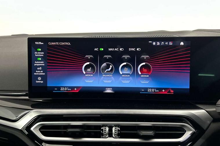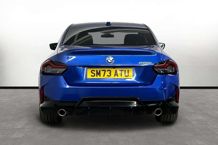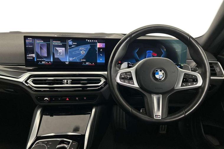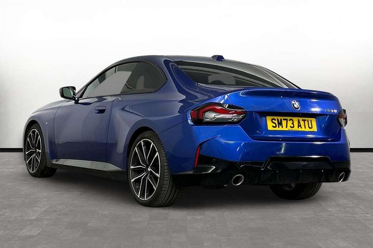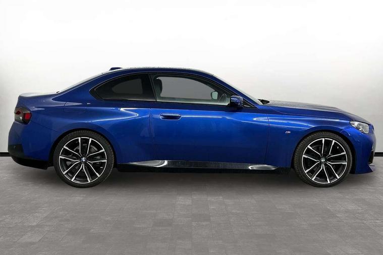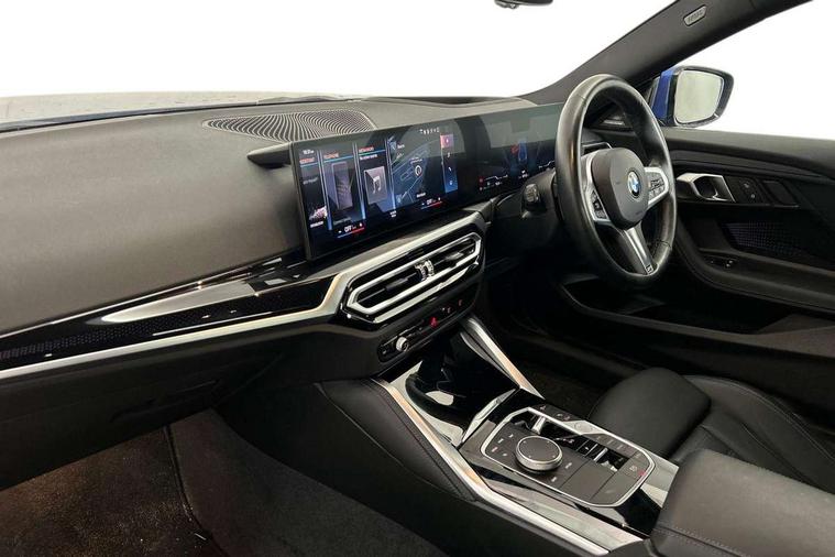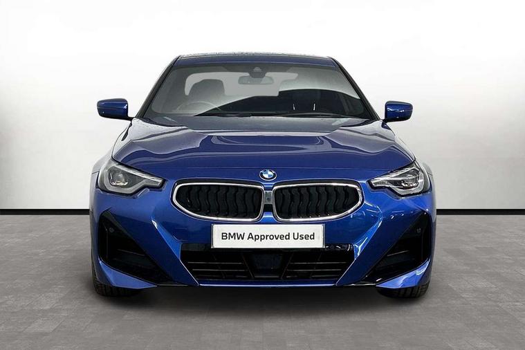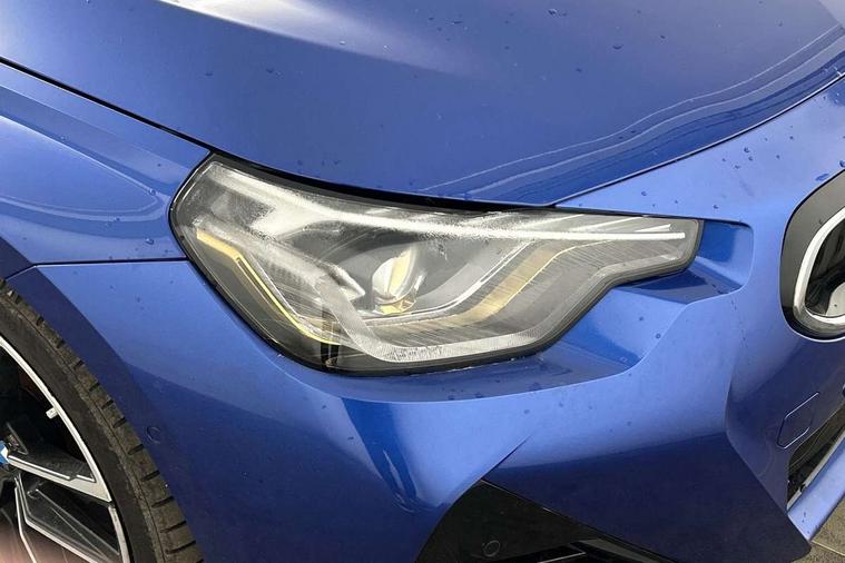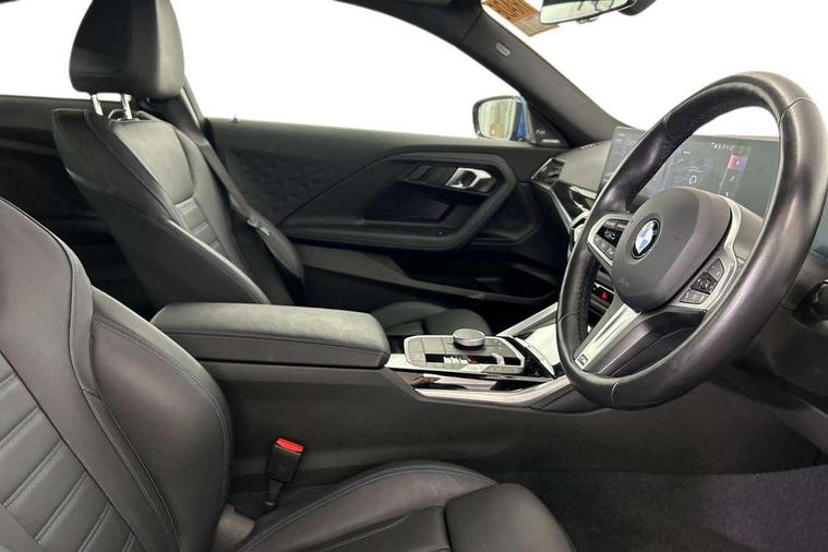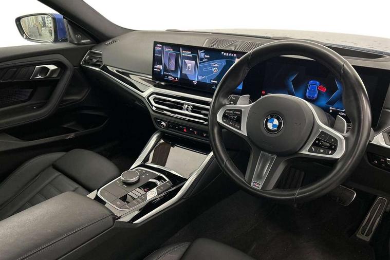 2 USB connections for charging and transferring data, 4G LTE connectivity with hard wired 4G network sim card, Attentiveness assist, Bluetooth with USB, BMW ConnectedDrive online services, BMW Intelligent Personal Assistant, BMW operating system 8 with variable, configurable widgets display information in real time, BMW Teleservices, Check Control warning system for monitoring of lights and door/luggage compartment open warning, Direct selection buttons, Drive off assistant, Eco pro mode, Electric power steering, Front and rear parking sensors, Front/rear Parking distance control, iDrive controller with turn and press function, Integrated owners handbook, Intelligent functions, Live cockpit plus with nav function 12.3" instrument cluster and 14.9" centre display, Oil sensor for level and grade, Optimum shift indicator, Personal Profile, Touch operation on control display, Variable sport steering, Widescreen multi-media display, WiFi interface for wireless connection of mobile terminal devices, Aluminium lightweight construction, Balancer shaft, BMW TwinPower Turbo four-cylinder petrol engine, Double VANOS, Drive performance control with ECO PRO comfort + sport mode, Electronic differential lock, High precision injection, M sport suspension, Petrol Particulate Filter, Sport automatic steptronic transmission with gearshift paddles, manual gearshift time display, launch control, coasting idle ECO PRO/COMFORT modes, Twin scroll turbocharger with Valvetronic, DAB tuner, Acoustic windscreen wipers for reduced driving noise, Adaptive LED Headlights, Automatic windscreen wipers and automatic headlight, Automatically dimming rear view mirror, Body colour door handles flush with door surface, Body colour door mirrors, Body colour front and rear bumpers, Daytime running lights, Electric windows - front and rear, with open/close fingertip control and trap release, Exhaust tailpipes x2 - 90mm in left and right, Fading support, Front and rear bumper system with replaceable deformation elements, Front door sill finishers in black plastic with BMW designation, Front windscreen wipers with integrated washer jets, Green tinted heat protection glazing, High beam assistant, High gloss black sill, bumper trim sides and diffuser insert, High gloss shadowline exterior trim in mirror triangle cover, mirror cover panel, mirror bezel and window border, High level third brake light, Indicators integrated int mirror housing, LED registration plate light, LED technology rear tail lights, brake lights and turn indicators, Lightweight engineering, Model designation on right side of tailgate, One piece kidney grille with hight gloss chrome surround, Rear boot, Rear fog lights, Reversing light in rear light cluster, Shark fin antenna, Single part LED rear lights with smoked glass components, Trailer stabilisation logic, Visible VIN plate, 12V power socket in front centre console with blanking plug, 2 cupholders in front centre console, 2 zone automatic air conditioning, Ambient lighting, Compartment in front of cupholder, Conditioned based service, Driver seat backrest width adjustment, Front and rear side armrests integrated into door trim, Front armrest, Front door pockets, Front head restraints, Front sport seats, Heated front seats, Illuminated glove compartment with separate small compartment, M headliner Anthracite, M sport leather steering wheel, Manually adjustment steering wheel column, Rear seat backrest with manual 40:20:40 split folding, Rear seat centre foldable armrest with integrated cup holder, Single front passenger seat, Storage compartment between rear seats, Storage tray and compartment with cover in centre console, Sun visors with vanity mirrors and insert tab, Through loading system with 40/20/40 split folding 2 rear seat in 2nd row, Two folding rear seat headrests, Velour floor mats, Additional storage compartment pack without USB - 2 Series Coupe, Connected pack professional - 2 Series Coupe, Interior and exterior mirror pack - 2 Series Coupe, M Sport exterior styling aerodynamics pack - 2 Series Coupe, 2 tone horn, Anti lock braking system (ABS) with cornering brake control, Automatic Stability Control (ASC), BMW emergency call, Brake drying, Child seat ISOFIX attachment for the two outer rear seats, Crash sensor activating of airbags, Unlocking doors, hazard warning lights, interior light, safety battery terminal, Deactivation of fuel pump in the event of a crash, Driver and front passenger airbags, Driver and front passenger side airbags, integrated in the door side seat backrest bolsters for all seat variants, Dynamic brake control, Dynamic stability control + (DSC+), Dynamic Traction Control - DTC, Electrically operated hand brake including automatic hold function and automatic release when driving off, Front and rear disc brakes, Head airbags for all 4 outer seats, Manual deactivation of front passenger airbag, Seat belt security check for driver and front passenger, Seatbelt warning, Side impact protection, Three point seat belts on 4 seats including front belt stopper, pyrotechnic belt tensioners and belt force limiters, Tyre pressure sensor, Warning triangle and first aid kit, Alarm system (Thatcham 1) with remote control and electronic engine immobiliser, Central locking switch for all doors, fuel filler cap and luggage compartment, Deadlocking function system to all doors, Drive away locking system on all doors and luggage compartment, Locking wheel bolts, Start/Stop button (illuminated) in centre console with keyless engine start and Auto Start-Stop deactivation button, Two remote control key with integrated key - one button for open and close doors/fuel flap/tailgate and separate button for unlock luggage compartment, BMW mobility tyre sealing system, Electrically powered 12V compressor, Reduced rolling resistance tyres,