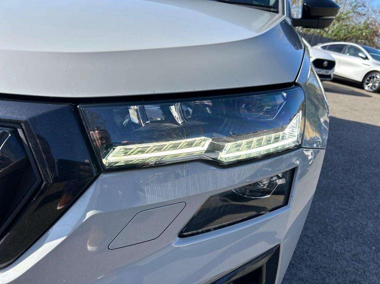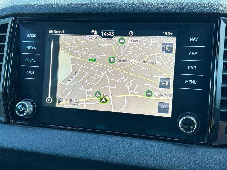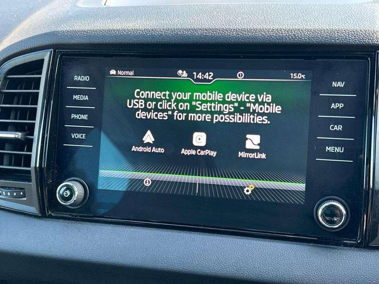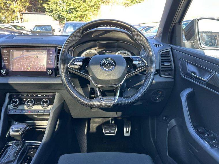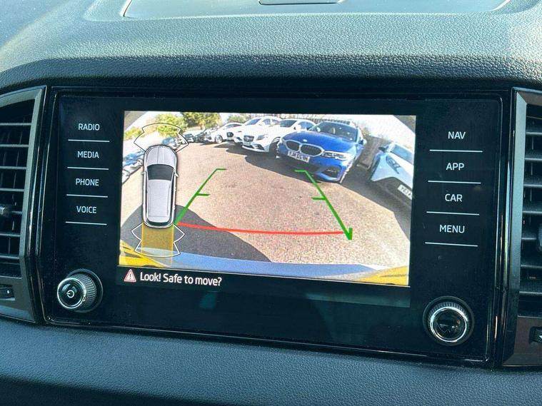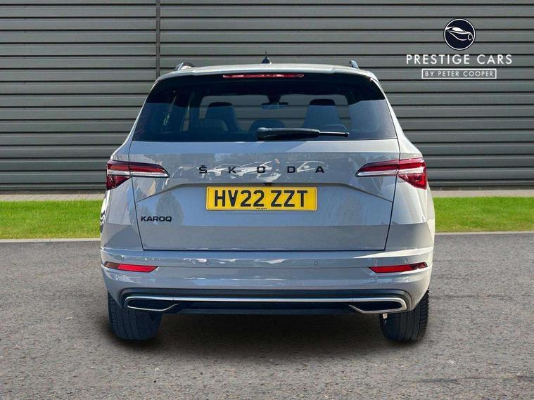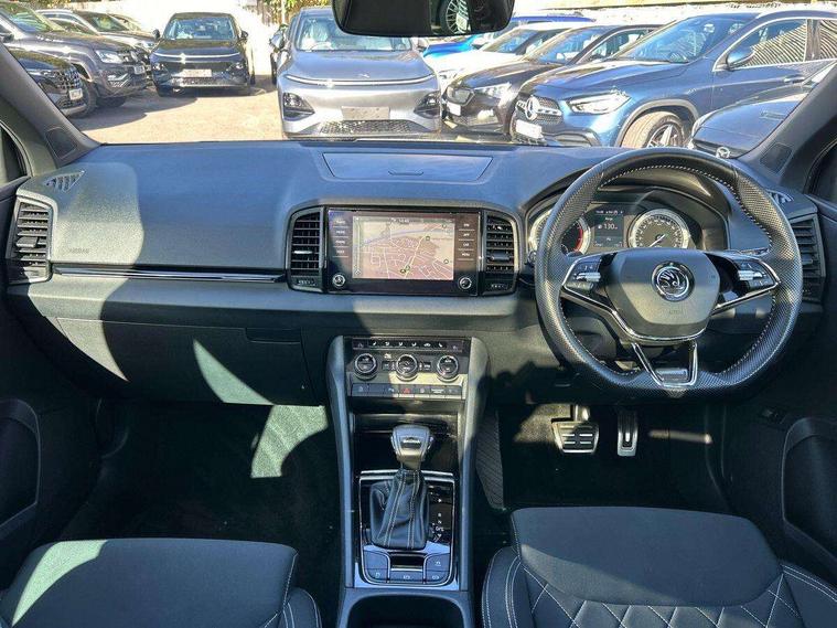 Care connect, Driver fatigue sensor, Emergency services call system, Multifunction colour trip computer, Outside temperature gauge, Service interval indicator, SmartLink wireless for Apple and wired for Android, Start/stop system with regenerative braking, USB C Port x 2 in front centre console, Virtual pedal with electrically operated boot door, 8 Speakers, DAB radio with Bluetooth, USB connection, Acoustic glass, Aero front windscreen wipers with intermittent function, Auto dimming rear view mirror with light and rain sensors, Automatic headlight control system, Black door mirrors, Black electric window control buttons, Black radiator grille, Black roof rails, Body colour door handles, Body coloured bumpers, Electric front and rear windows with child proof lock, Front door steps with SportLine logo, Heated rear windscreen, LED daytime running lights, LED rear lights with high functionality welcome effect and dynamic indicators, Light assistant (coming/leaving home/tunnel light), Panoramic sliding sunroof, Privacy glass, Protective door side sills in body colour, Rear diffuser, Rear side wing doors, Rear spoiler, Rear wiper, Safety reflectors on front doors, Skoda lettering on tailgate in black, Sportline badge on front fender, Sportline decorative inserts with badging, Sports front and rear bumpers, 1.5 litre bottle holders in driver and front passenger door panels, 12V socket in boot, 12v socket in front centre armrest with storage compartment and rear air vents, 2 Folding hooks and nets in boot, 3 rear height adjustable headrests, 3 seat bench in 2nd row, 3 spoke leather sports multifunction steering wheel and silver stitching with gear shift paddles, 4 foldable roof handles with rear coat hooks, Black floor carpet, Black roof headlining, Chrome inner door handles, Double sided boot floor, Foldable hooks in the boot, Front head restraints, Height adjustable front three point seats belts with tensioners, Height/reach adjust steering wheel, Ice scraper, Illuminated and cooled glovebox, Illuminated luggage compartment, Isofix child seat preparation outer rear, Manual lumbar support for front seats, Pen holder, Pollen filter, Rear reading lights, Rear seats fixed folding and divided 60:40, Retractable parcel shelf attachable to tailgate, Rubbish bin door, Safety vest holder, Single front passenger seat, Solid rear boot cover, Storage box in upper central dashboard closed, Sunvisors with illuminated vanity mirrors, Textile floor mats, Titan black interior ceiling, Umbrella under passenger seat, Welcome animation with sportline logo, Light Pack - Karoq, Parking pack - Karoq, Airbags - Front side, head, knee and curtain, Automatic door unlocking in case of crash, Automatic fuel cut off in case of crash, Child locks on rear doors, Driver airbag, Electronic parking brake with auto hold function, Emergency rear braking signal, ESC including ABS, MSR, ASR, EDS, HBA, DSR, RBS, MKB and traction control, Front assist radar scanning of the space in front of the car with automatic braking, Hill hold control, Passenger airbag with switch-off function, Pedestrian monitor, Seatbelt reminder signalisation and pretensioner for all seats, Three point seatbelts rear, Two tone horn, Tyre pressure display, Tyre pressure monitor, Alarm with interior monitoring, back up horn and tilt sensor with safe function, Electronic engine immobiliser, Keyless entry and start/stop system with SAFE system, Remote central locking with 2 remote folding keys, Black air vent surround, Black centre console, Satin black dashboard, Satin black door trim, 18" Procyon alloy wheels in black, Anti-theft wheel bolts protection, Matt black aero hub caps, Storage on wheel cover,