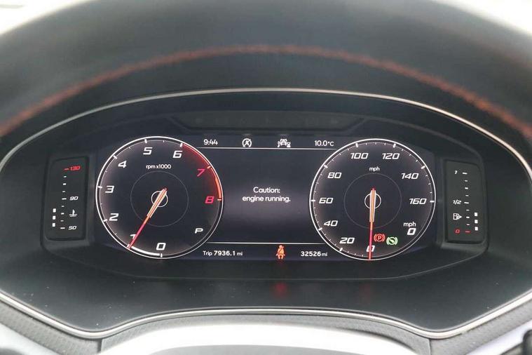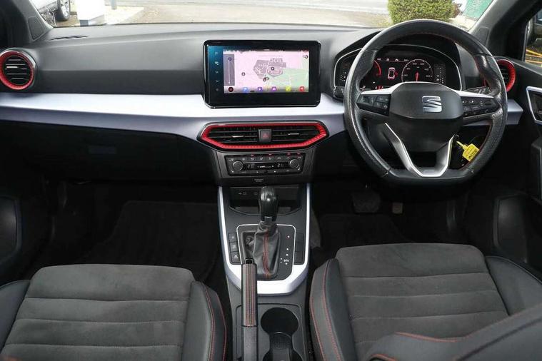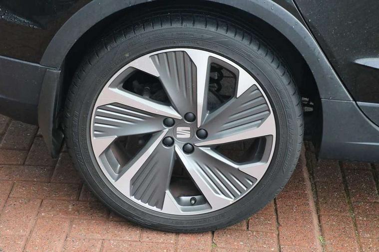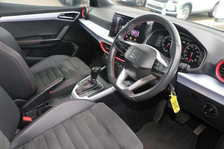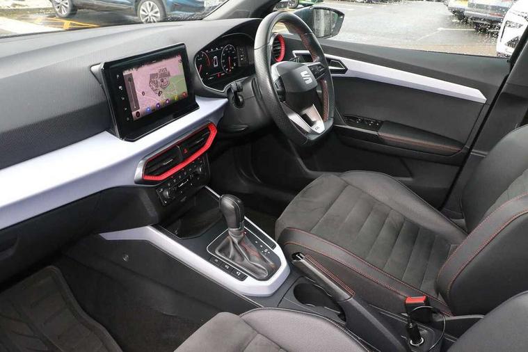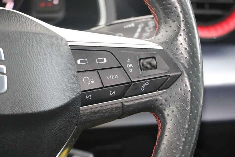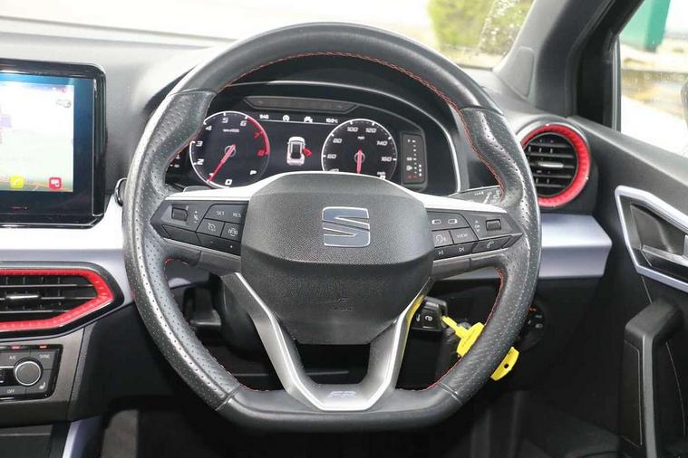 Titan black dashboard, Connectivity pack plus - Arona, Interior chrome pack - Arona, 18" Performance Cosmo grey matt alloy wheels, Alarm with back-up horn, Electronic engine immobiliser, Locking wheel bolts, Remote central locking + deadlocks, Tow away protection, Bluetooth interface for hands free and audio streaming, DAB digital radio and AM/FM radio, Steering wheel mounted audio controls, 3 point seatbelts on all rear seats, ABS, Active front headrests, Child locks on rear doors, Driver and front passenger airbags with front passenger airbag de activation, front side and curtain airbags, Electronic stability control, Emergency Brake Assist (EBA) and front assist, Front and rear seatbelt reminder, Hill hold control, Multi-Collision braking, Tiredness recognition system, Traction control, Tyre pressure monitoring system, Anti theft roof antenna, Auto dimming interior rear view mirror, Automatic activation of hazard warning lights, Body coloured bumpers, Body coloured door handle inserts, Chrome roof rails and window surrounds, Chrome window trim, Dark tinted rear windows, Electric front/rear windows, Electrically adjustable, heated and folding door mirrors, FULL LED automatic headlights with dynamic headlight range control, coming and leaving home, LED daytime running lights, LED rear tail lights and licence plate lights, Protective side mouldings, Rain sensing wipers, Rear side wing doors, Rear spoiler, Rear window wash/wipe, Roof colour door mirrors, Third brake light, Twin exhaust pipe styling hidden exhaust pipe, Visible VIN plate, Windshield wiper with intermittent control and potentiometer, 2 cupholders, 3 seat bench in 2nd row, 60/40 split folding rear seat, Aircare filter, Black interior roof, Daring red Illuminated coloured air vent, Double boot floor, Driver sunvisor with covered mirror + card holder, Dual zone climate control, Front courtesy light with front and rear reading lights, Front seat back storage pockets, Front sport seats, Heated front seats, Height adjustable front seats, Height/reach adjustable steering column, Illuminated boot, Interior ambient lighting, Interior light in footwell, central console and door panel, ISOFIX points in outer rear seats with top tether anchorage points, Microsuede cloth upholstery, Passenger sunvisor with vanity mirror, Perforated flat bottomed leather steering wheel/gear knob/handbrake with red stitching and FR logo, Single front passenger seat, Steering wheel mounted gearshift paddles, Two front and three rear height adjustable headrests, Digital cockpit, E-call, Electric speed sensitive power steering, Full Link Smartphone Integration with Mirror Link, Apple Car Play, Google Android Auto with USB cable for Apple and Android compatibility, Lane keeping system, Rear parking sensor, Seat connect with safety, service, remote and online, SEAT Drive profile - Four different models normal-sport-eco-individual, steering response, throttle response and gear shifts mode,