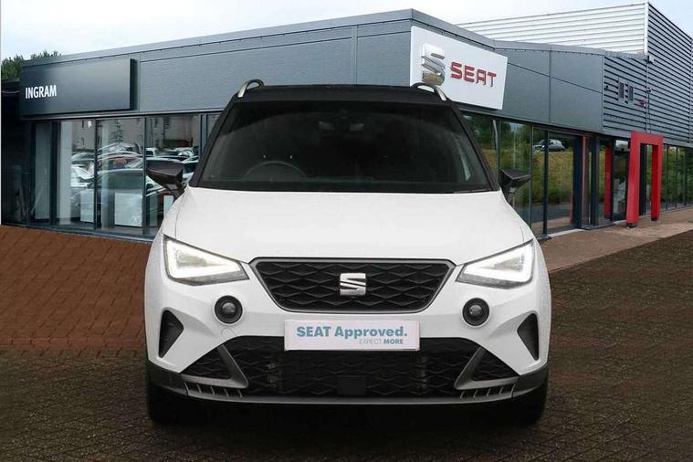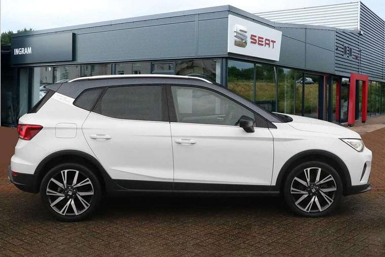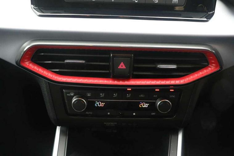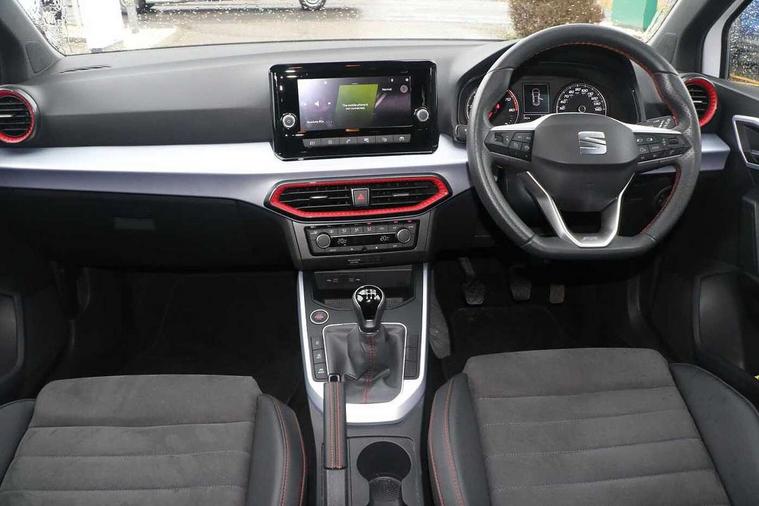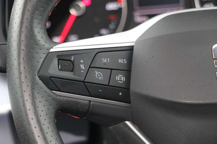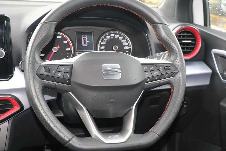 'Lights On' Reminder warning buzzer, Analogue cockpit with physical dials, Digital clock, E-call, Electric speed sensitive power steering, Full Link Smartphone Integration with Mirror Link, Apple Car Play, Google Android Auto with USB Type C cable for Apple and Android compatibility, Lane keeping system, Low fuel warning light, Outside temperature display, Rear parking sensor, RPM counter, Seat connect with safety, service and remote, SEAT Drive profile - Four different models normal-sport-eco-individual, steering response, throttle response, Trip computer, Wireless phone charger, Bluetooth interface for hands free and audio streaming, DAB digital radio and AM/FM radio, Media system with 8.25" colour touchscreen with USB port (type c), Steering wheel mounted audio controls, Anti theft roof antenna, Automatic activation of hazard warning lights, Body coloured bumpers, Body coloured door handle inserts, Chrome roof rails and window surrounds, Dark tinted rear windows, Dimming rear view mirror, Electric front/rear windows, Electrically adjustable and heated door mirrors, Front fog lights with cornering function and rear fog light, FULL LED automatic headlights with dynamic headlight range control, coming and leaving home, LED daytime running lights, LED rear tail lights and licence plate lights, Protective side mouldings, Rear side wing doors, Rear spoiler, Rear window wash/wipe, Roof colour door mirrors, Third brake light, Twin exhaust pipe styling hidden exhaust pipe, Visible VIN plate, Windshield wiper with intermittent control and potentiometer, 2 cupholders, 3 seat bench in 2nd row, 60/40 split folding rear seat, Aircare filter, Black interior roof, Double boot floor, Driver sunvisor with covered mirror + card holder, Dual zone climate control, Front comfort seats, Front courtesy light with 2x front and 2x rear reading lights, Gear shift indicator, Height adjustable front seats, Height/reach adjustable steering column, Illuminated boot, Instrument lighting with brightness control, Interior ambient lighting, Interior light in footwell, central console and door panel, ISOFIX points in outer rear seats with top tether anchorage points, Microsuede cloth upholstery, Passenger sunvisor with vanity mirror, Perforated flat bottomed leather steering wheel/gear knob/handbrake with red stitching and FR logo, Single front passenger seat, Two front and three rear height adjustable headrests, Interior chrome pack - Arona, 3 point seatbelts on all rear seats, ABS, Active front headrests, Child locks on rear doors, Driver and front passenger airbags with front passenger airbag de activation, front side and curtain airbags, Electronic stability control, Emergency Brake Assist (EBA) and front assist, Front and rear seatbelt reminder, Hill hold control, Multi-Collision braking, Tiredness recognition system, Traction control, Tyre pressure monitoring system, Alarm with back-up horn, Electronic engine immobiliser, KESSY Keyless entry and go, Locking wheel bolts, Remote central locking + deadlocks, Tow away protection, Titan black dashboard,