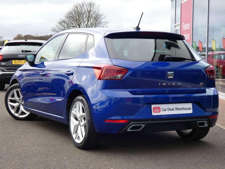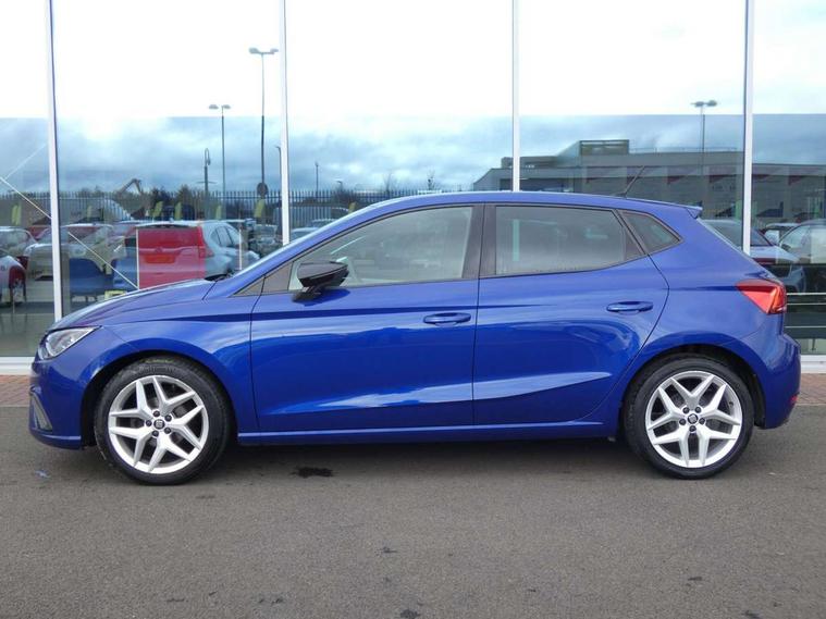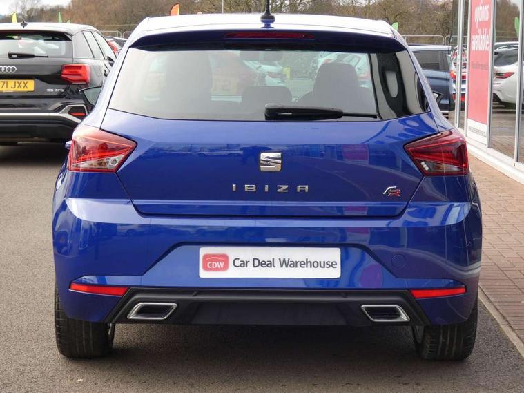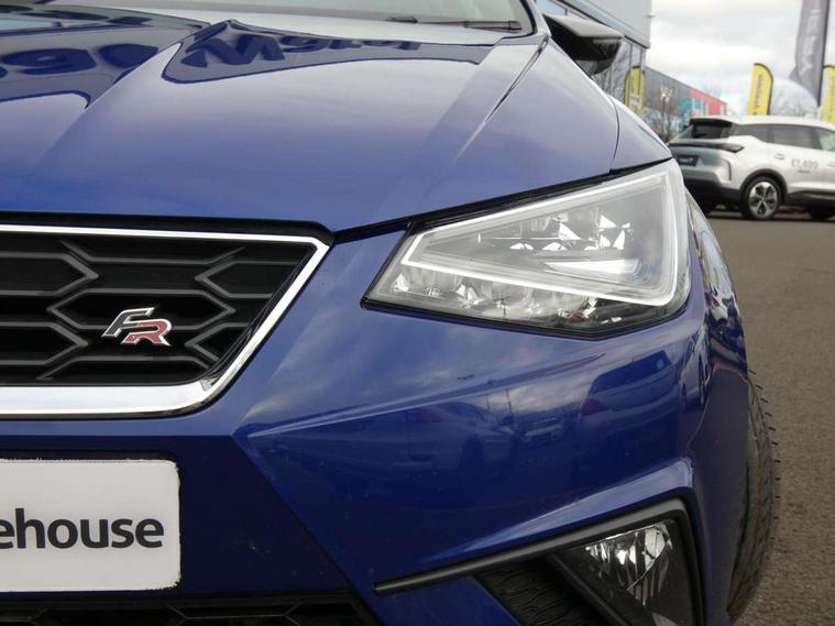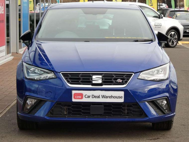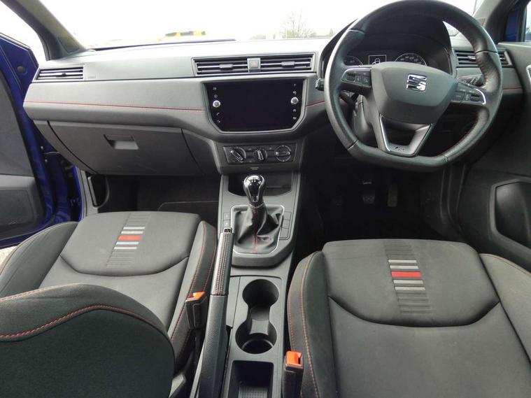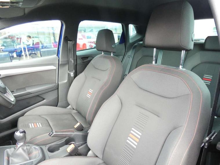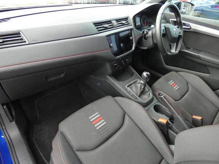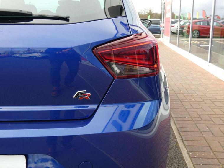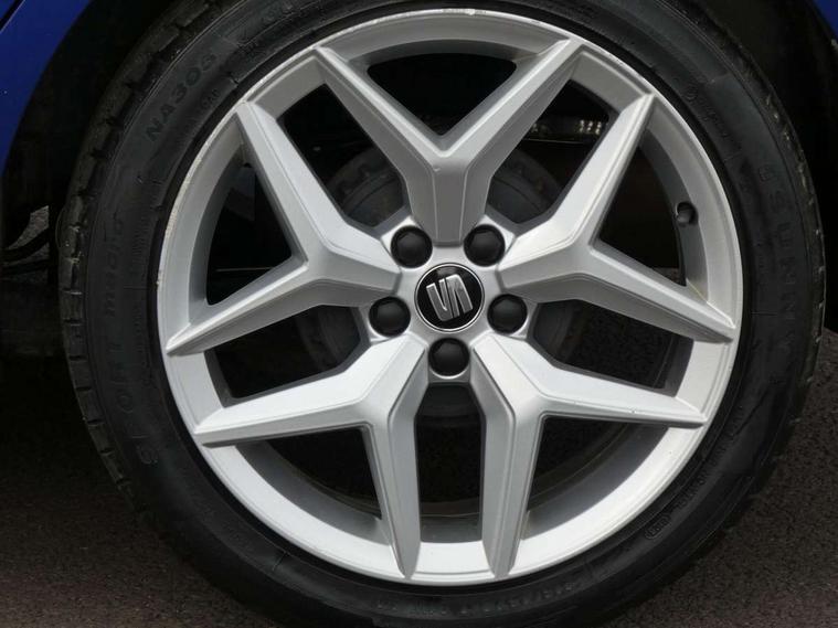 'Lights On' Reminder warning buzzer, Bluetooth Handsfree Phone Connection, Cruise control, Digital clock, Full Link Smartphone Integration with Mirror Link, Apple Car Play, Google Android Auto, Low fuel warning light, Outside temperature gauge, Power Steering, Satellite navigation system with 3D mapping, 8" touch screen, voice control and additional USB port, SEAT Drive profile, SEAT logo boot release, Trip computer, Sports suspension, 6 speakers, Auxiliary input socket, CD player, Digital Audio Broadcast (DAB) Tuner, Radio/MP3 player, SD card slot, SEAT USB media cable, Steering wheel mounted controls, USB port, Anti theft roof antenna, Auto dimming rear view mirror, Automatic headlights, Automatic rain sensing wipers, Body colour bumpers, Body colour door handles, Brilliant black door mirrors, Chrome front grille frame, Chrome grille, Coming/leaving home lighting function, Cornering front fog lights, Dark tinted rear windows, Electric folding door mirrors, Electric front windows, Electric headlight adjustment, Electrically adjustable and heated door mirrors, Exclusive FR rear bumper, Full LED headlights, LED daytime running lights, LED tail lights, Rear fog lights, Twin exhaust pipes, 3 rear headrests, 60/40 split folding rear seat, Air conditioning, Door and steering wheel ice metal decorative inserts, Driver's sunvisor with ticket holder/vanity mirror, Dust/pollen filter, Flat bottomed perforated leather steering wheel with red stitching and FR logo, Front courtesy lights, Front cupholders x 2, Front reading lights, Gear shift indicator, Glovebox, Height adjustable driver's seat, Height adjustable front/rear head restraints, Height adjustable passenger seat, Height/reach adjust steering wheel, Illuminated boot, Instrument lighting with brightness control, Leather handbrake, Multi-colour ambient interior lighting, Nora cloth upholstery, Passenger sunvisor, Rear top tether child seat ISOFIX attachment, Sports seats, Full LED headlight pack - Ibiza, 3 point seatbelts on all 3 rear seats, ABS, Active front headrests, Child locks on rear doors, Curtain airbags, Driver/Front Passenger airbags, ESP+EBA, Front assist (AEB), Front passenger airbag deactivation, Front side airbags, Hill hold control, Multi-Collision braking, Seatbelt warning, Tiredness recognition system, Tyre pressure monitoring system, Electronic engine immobiliser, Locking wheel bolts, Remote central locking + deadlocks, Volumetric alarm with back up horn, Leather dashboard, 17" Dynamic alloy wheels,