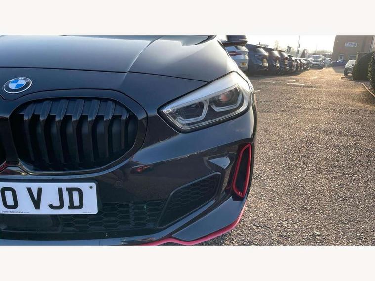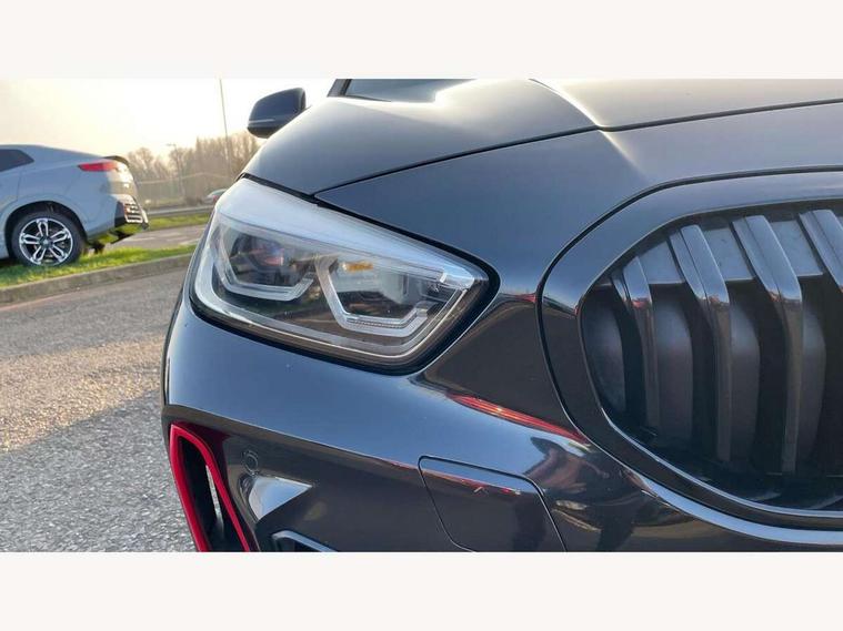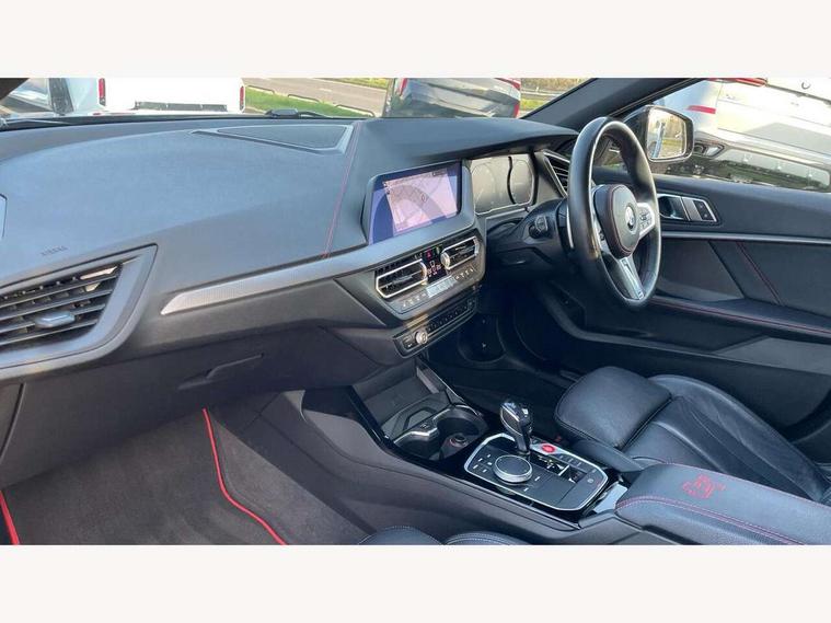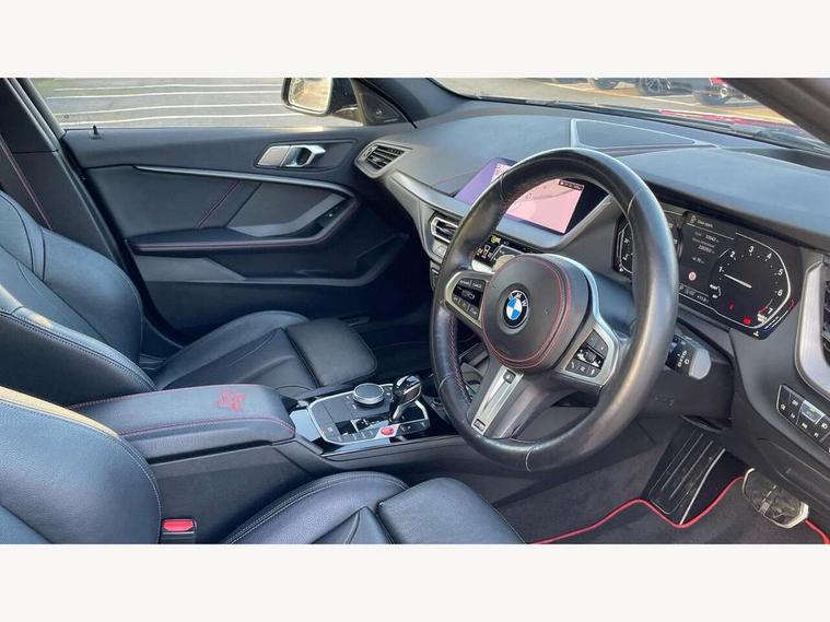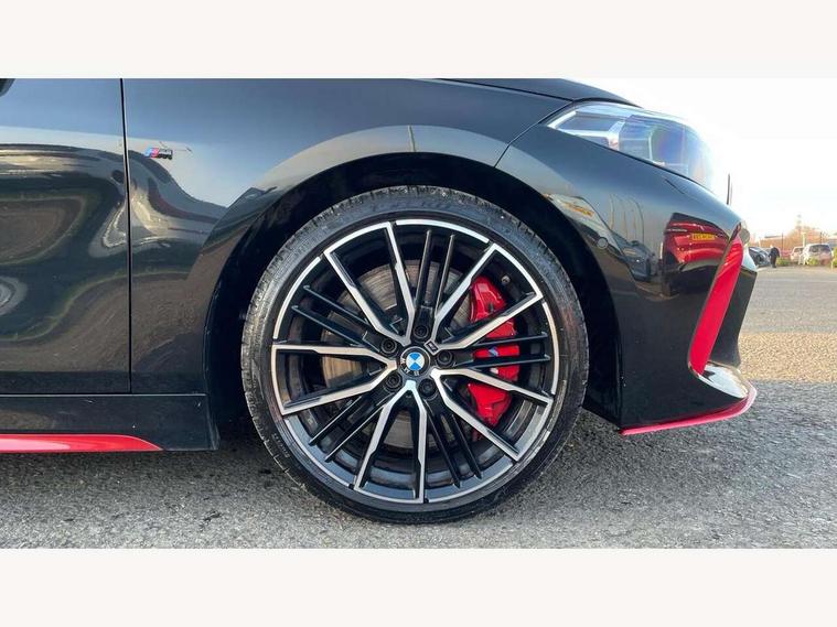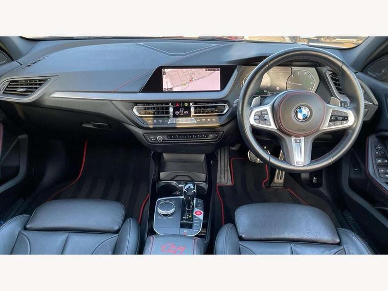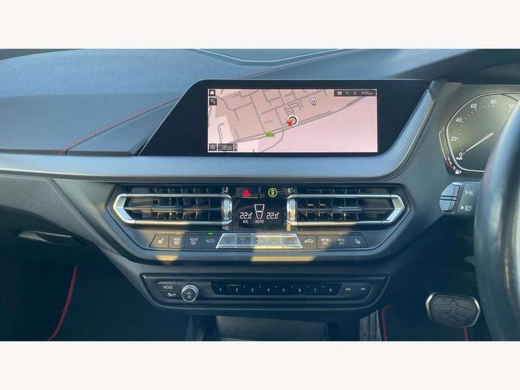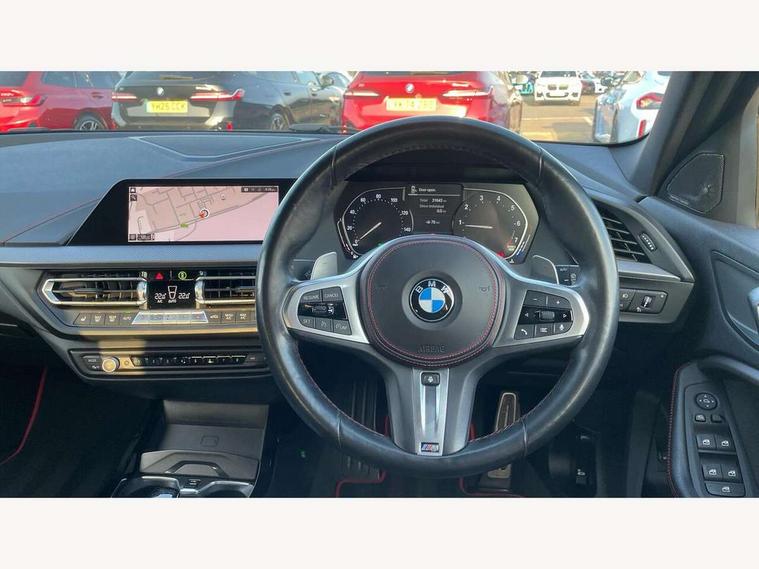 Active guard plus, Attentiveness assist, BMW Online services, BMW Teleservices, Check Control warning system for monitoring of lights and door/luggage compartment open warning, Connected eDrive Services, Eco pro mode, Electric power steering with Servotronic steering optimised at all speed ranges, Integrated owners handbook, Oil sensor for level and grade, On board computer, Optimum shift indicator, Personal Profile, Pull away assistant, Speed limiter, Aluminium lightweight construction, Anti roll bar front and rear, Balancer shaft, Double VANOS, Drive Performance Control, Eight speed sport automatic transmission with electronic selector lever, Electronic differential lock, High precision injection, M sports suspension + self levelling, Petrol Particulate Filter, VALVETRONIC engine management, Bluetooth audio streaming, DAB Digital radio, Air inlets in front left and right with highlight clasp in red, Auto dimming rear view mirror, Automatic headlight beam throw control, Black chrome tailpipe finishers, BMW individual lights shadow line, Body colour door handles, Body colour mirror caps, Chrome 'M' logo side designation, Chrome kidney grille frame with Satin Aluminium struts, Direction indicator side lights in exterior mirrors, Electric folding and anti dazzle exterior mirrors, Fading support, Follow me home headlights, Front and rear electric windows with open and close fingertip control, anti trap facility and comfort closing, Front door sill finishers in black plastic with BMW designation, Green tinted heat protection glazing, Heated, electrically adjustable exterior mirror aspheric on driver side, convex on passenger side, High gloss shadowline window frame, Recess cover mirror frames and B/C pillar embelisher trim, High level third brake light, LED daytime running lights, LED eyebrow turn indicators, Lightweight engineering, Matt black air guide grilles, Model designation on right side of tailgate, Nearside reverse light in rear light cluster, Preparation for high beam assistant, Rain sensor including auto headlights activation, Rear fog lights, Rear window wiper, Shark fin antenna, Visible VIN plate, Welcome lighting, Windscreen wipers with integrated washing jets, 12V power socket in centre console, 3 rear seat head restraints, Anthracite headlining, Centre armrest in black/red highlight including embroidered 'ti' designation in red, Child seat ISOFIX attachment for two outer rear seats and front passenger seat with anchorage points, Conditioned based service, Driver and front passenger seat heating, Floor mats with red binding, Folding rear clothes hook, Folding rear seats, Four grab handles integrated in roof lining, Front and rear door pockets, Front and rear side armrest integrated into door trim, Front armrest foldable with integrated storage compartment, Front sports seats with electric side bolster adjustment, Glove compartment, Height adjustable front head restraints, Instrument panel top section , door armrests and door panels in black/red highlight, Manual adjust steering wheel, Multi-function controls for steering wheel, Rear seat backrest with manual 60:40 split folding with 3 top tether clips integrated on rear of seat panels, Storage compartment in centre console, Sun visors with vanity mirrors and insert tab, Three spoke M sport design multi function leather steering wheel in unique red stitching, Two zone automatic air conditioning, Connected pack professional - 1 Series, Extended Lighting pack - 1 Series, Extended storage pack - 1 Series, Interior lights pack - 1 Series, Luggage compartment pack - 1 Series, M Sport exterior styling aerodynamics pack - 1 Series, 2 tone horn, 3 point seatbelts on all seats, front pyrotechnic belt tensioners, stopper and belt force limiters, rear coded belt buckles, Airbags - Front driver and passenger, front and rear head, front side, curtain head protection, Anti lock braking system (ABS) with brake assist, BMW emergency call, Brake drying, Braking readiness, Crash sensor activating central locking release, hazard warning lights, fuel cut off, interior lighting + activation of safety battery terminal clamp, Driver and front passenger seat belt security check, Dynamic stability control + (DSC+), Dynamic Traction Control - DTC, Electrically operated hand brake, Front and rear disc brakes, Front passenger manual airbag deactivation, M Sport braking system with red calipers, M sport seatbelt, Rear child proof door locks, Seatbelt warning, Side impact protection, Tyre pressure monitoring system, Warning triangle and first aid kit, Automatic drive away locking facility, Central locking switch for all doors, fuel filler cap and luggage compartment, Deadlocking function system to all doors, Locking wheel bolts, Remote control with integrated key with High-gloss Black inlay and M designation and 1 button for open/ close lock, window, open luggage compartment, Start/stop button with comfort go keyless engine start and auto start stop deactivation button, Thatcham Cat.1 alarm and immobiliser, Reduced rolling resistance tyres,