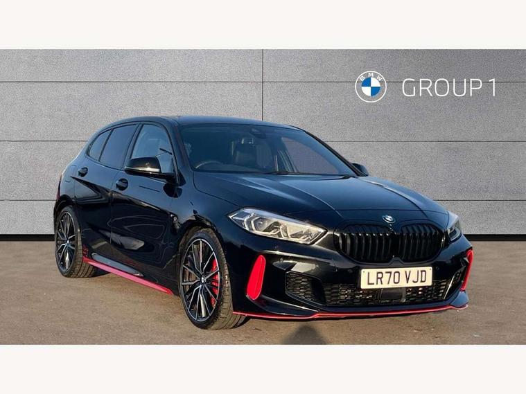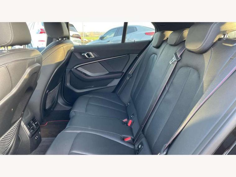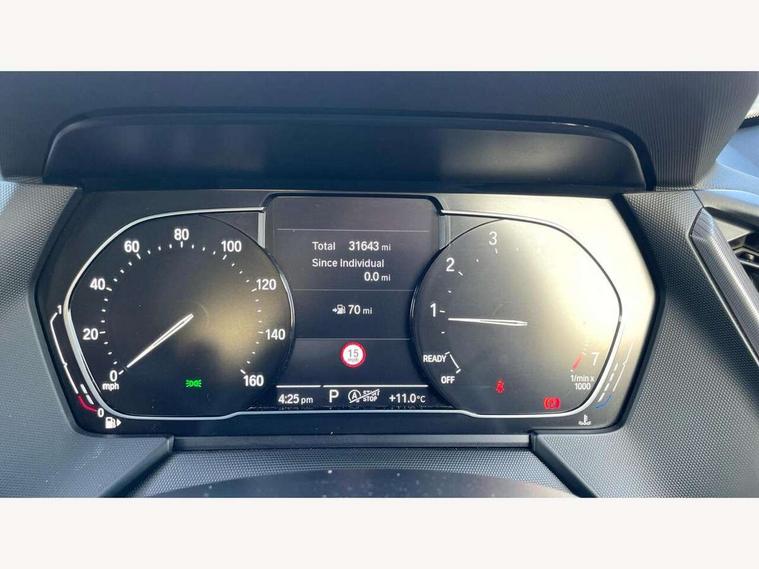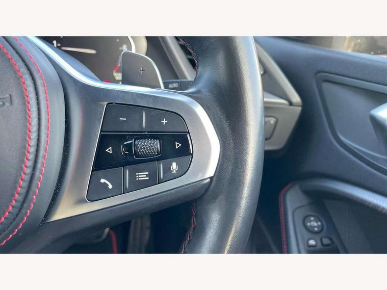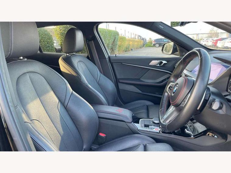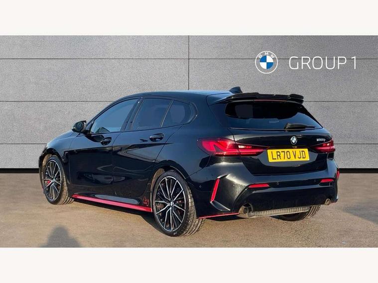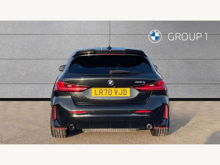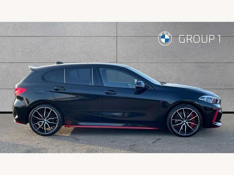 Active guard plus, Attentiveness assist, BMW Online services, BMW Teleservices, Check Control warning system for monitoring of lights and door/luggage compartment open warning, Connected eDrive Services, Eco pro mode, Electric power steering with Servotronic steering optimised at all speed ranges, Integrated owners handbook, Oil sensor for level and grade, On board computer, Optimum shift indicator, Personal Profile, Pull away assistant, Speed limiter, Aluminium lightweight construction, Anti roll bar front and rear, Balancer shaft, Double VANOS, Drive Performance Control, Eight speed sport automatic transmission with electronic selector lever, Electronic differential lock, High precision injection, M sports suspension + self levelling, Petrol Particulate Filter, VALVETRONIC engine management, Bluetooth audio streaming, DAB Digital radio, Air inlets in front left and right with highlight clasp in red, Auto dimming rear view mirror, Automatic headlight beam throw control, Black chrome tailpipe finishers, BMW individual lights shadow line, Body colour door handles, Body colour mirror caps, Chrome 'M' logo side designation, Chrome kidney grille frame with Satin Aluminium struts, Direction indicator side lights in exterior mirrors, Electric folding and anti dazzle exterior mirrors, Fading support, Follow me home headlights, Front and rear electric windows with open and close fingertip control, anti trap facility and comfort closing, Front door sill finishers in black plastic with BMW designation, Green tinted heat protection glazing, Heated, electrically adjustable exterior mirror aspheric on driver side, convex on passenger side, High gloss shadowline window frame, Recess cover mirror frames and B/C pillar embelisher trim, High level third brake light, LED daytime running lights, LED eyebrow turn indicators, Lightweight engineering, Matt black air guide grilles, Model designation on right side of tailgate, Nearside reverse light in rear light cluster, Preparation for high beam assistant, Rain sensor including auto headlights activation, Rear fog lights, Rear window wiper, Shark fin antenna, Visible VIN plate, Welcome lighting, Windscreen wipers with integrated washing jets, 12V power socket in centre console, 3 rear seat head restraints, Anthracite headlining, Centre armrest in black/red highlight including embroidered 'ti' designation in red, Child seat ISOFIX attachment for two outer rear seats and front passenger seat with anchorage points, Conditioned based service, Driver and front passenger seat heating, Floor mats with red binding, Folding rear clothes hook, Folding rear seats, Four grab handles integrated in roof lining, Front and rear door pockets, Front and rear side armrest integrated into door trim, Front armrest foldable with integrated storage compartment, Front sports seats with electric side bolster adjustment, Glove compartment, Height adjustable front head restraints, Instrument panel top section , door armrests and door panels in black/red highlight, Manual adjust steering wheel, Multi-function controls for steering wheel, Rear seat backrest with manual 60:40 split folding with 3 top tether clips integrated on rear of seat panels, Storage compartment in centre console, Sun visors with vanity mirrors and insert tab, Three spoke M sport design multi function leather steering wheel in unique red stitching, Two zone automatic air conditioning, Connected pack professional - 1 Series, Extended Lighting pack - 1 Series, Extended storage pack - 1 Series, Interior lights pack - 1 Series, Luggage compartment pack - 1 Series, M Sport exterior styling aerodynamics pack - 1 Series, 2 tone horn, 3 point seatbelts on all seats, front pyrotechnic belt tensioners, stopper and belt force limiters, rear coded belt buckles, Airbags - Front driver and passenger, front and rear head, front side, curtain head protection, Anti lock braking system (ABS) with brake assist, BMW emergency call, Brake drying, Braking readiness, Crash sensor activating central locking release, hazard warning lights, fuel cut off, interior lighting + activation of safety battery terminal clamp, Driver and front passenger seat belt security check, Dynamic stability control + (DSC+), Dynamic Traction Control - DTC, Electrically operated hand brake, Front and rear disc brakes, Front passenger manual airbag deactivation, M Sport braking system with red calipers, M sport seatbelt, Rear child proof door locks, Seatbelt warning, Side impact protection, Tyre pressure monitoring system, Warning triangle and first aid kit, Automatic drive away locking facility, Central locking switch for all doors, fuel filler cap and luggage compartment, Deadlocking function system to all doors, Locking wheel bolts, Remote control with integrated key with High-gloss Black inlay and M designation and 1 button for open/ close lock, window, open luggage compartment, Start/stop button with comfort go keyless engine start and auto start stop deactivation button, Thatcham Cat.1 alarm and immobiliser, Reduced rolling resistance tyres,