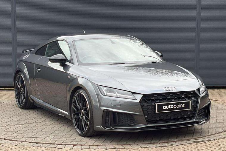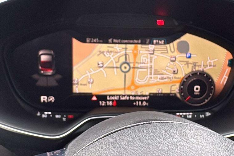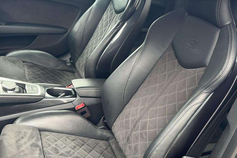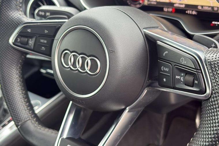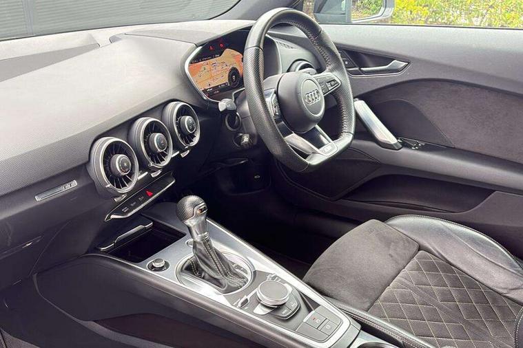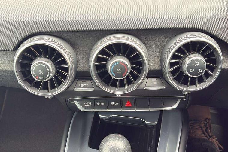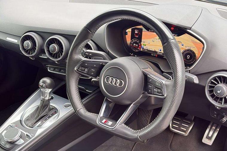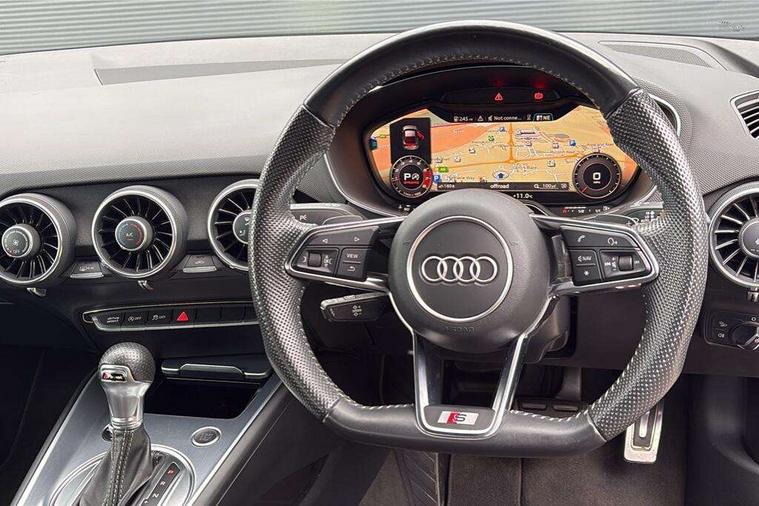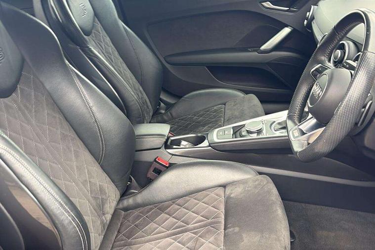 Audi drive select with 4 Pre configured modes, Audi virtual cockpit - 12.3" high-resolution LCD display with fully customisable instrument cluster, Cruise control + speed limiter, MMI touch panel, Mobile phone preparation with bluetooth interface, Progressive power assisted steering, Service interval indicator, Start/Stop system with energy recuperation, TP memo, S line sports suspension, AM/FM radio, Audi music interface, Bluetooth audio streaming, DAB Digital radio, MMI Radio with CD player and SD/XC card slot, Auto dimming rear view mirror, Auto headlight range control, Black chrome tailpipe, Black door mirrors, Dark privacy glass from B-pillar backwards, Dynamic rear indicators, Electric folding door mirrors, Electric front windows, Front fog lights, Green tinted heat insulating glass, Headlight wash system, LED daytime running lights, LED headlights with LED rear lights + dynamic rear indicators, Light and rain sensors, Sunband for windscreen, 12V socket, 3 spoke flat bottomed high multi-function leather sport steering wheel with gearshift paddles, 4 way electric lumbar support for driver and front passenger, Air conditioning, Black headlining, Extended aluminium look with stainless steel pedals, Front centre armrest, Front super sports seats, Heated front seats, Height adjustable driver's seat, Height adjustable front head restraints, Height/reach adjust steering wheel, ISOFIX child seat mounting for front passenger seat with airbag deactivation, Perforated leather gearknob, Rear head restraints, Rear top tether child seat ISOFIX attachment, Split folding rear seat, Top tether anchor plate for isofix child seat, Black styling pack - TT, Non smoking pack - TT/TT RS, 3 point front seat belts, ABS, ASR traction control, Brake energy regeneration, Curtain airbags, Driver and front passenger airbag with front passenger airbag deactivation, EDL traction control, Electromechanical parking brake, ESP, First aid kit, Front side airbags, Head airbags, Hill hold assist, Seatbelt warning, Tyre pressure warning, Warning triangle, Anti theft alarm, Anti theft wheel bolts, Immobiliser, Keyless Go, Remote central locking, Matt brushed aluminium inlays, Tool kit, Tyre repair kit,