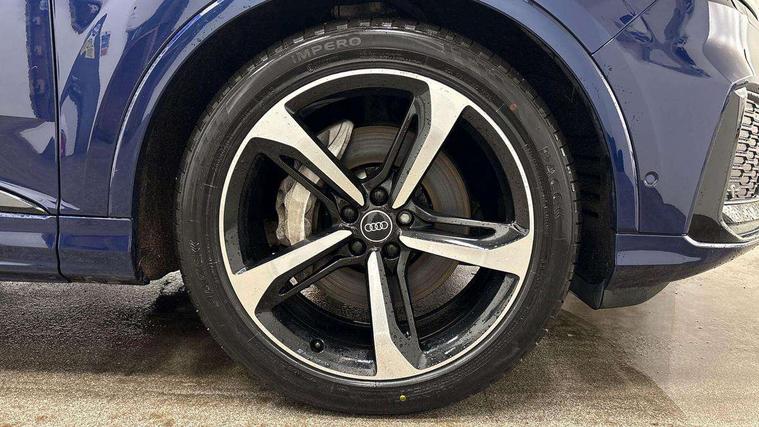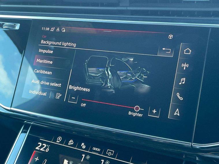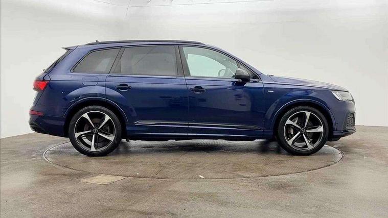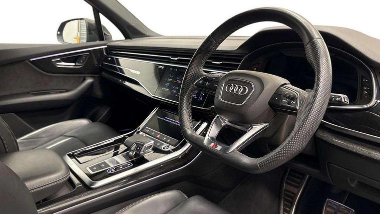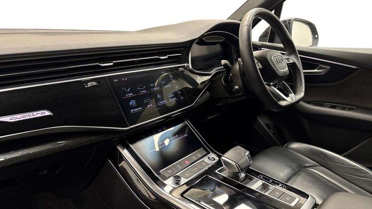 Audi connect safety and service (e-call), Audi connect with Amazon Alexa Integration, Audi drive select (Auto, Comfort, Dynamic, Efficiency, Individual, Off-road and All road), Bluetooth interface, Camera based traffic sign recognition, Electromechanical steering, MMI navigation plus with MMI touch screens includes 10.1" and 8.6" screens with haptic feedback, Natural voice recognition, Parking system plus with 360 degree display (front, rear and side sensors) - acoustic and visual park assist system, Power operated tailgate, Rear view camera, Smartphone interface includes wireless Apple carplay/Android Auto, Start/stop system, 48V Mild hybrid technology, Adaptive air sports suspension, Quattro all wheel drive with self locking centre differential, Audi music interface - front 2 USB-C ports with charger and data functions, Audi sound system with 6 channel amplifier, 180 watt amplifying capacity and 10 loudspeakers including subwoofer, DAB digital radio module, 3rd brake light, Audi matrix LED headlights with dynamic front and rear indicators, Auto dimming frameless rear view mirror, Black roof rails, Bumpers in contrast paint scandium grey finish includes door trim and wheel arch trim strips, inlays in door strip contain quattro embossing, Electrically adj heated/folding + automatically dimming exterior mirrors with memory + automatic kerb side function for passenger side exterior mirror, Heat insulating glass in windshield, Integrated LED indications in door mirrors, LED daytime running lights, LED rear tail lights, Privacy glass - dark tinted rear and rear side windows from B-pillar backwards, Rear side wing doors, Rear wiper, 2 seat bench in 3rd row, 3 seat bench in 2nd row, 4 zone deluxe automatic climate control, 7 seat layout with ISOFIX points for the front passenger seat and rear passenger seat, Black cloth headlining, Comfort front centre armrest, Electric adjustable front seat with 4 way lumbar support, driver memory functionality, Folding rear seats, Front head restraints, Front/rear floor mats, Heated front seats, Illuminated door sill trims with S logo, LED interior ambient lighting, Luggage compartment cover, Luggage compartment sill protection in stainless steel, Rear head restraints, Single front passenger seat, Stainless steel pedals, Sunvisors with illuminated vanity mirrors, Titanium black styling pack - Q7/SQ7, 3 point seatbelts on all rear seats, Audi pre sense front, Child locks on rear doors, Driver and front passenger, front side and curtain airbags, Electromechanical parking brake, Electronic Stabilisation Control (ESC) including ABS, ASR and EDL, Extended pedestrian protection measures, Hill hold assist, Seatbelt monitoring, Tyre pressure loss indicator, Warning triangle and first aid kit, Anti theft alarm, Anti-theft wheel bolts and wheel loosening detection, Keyless Go, Remote central locking, Polished oak trim with grey finish inlay, Tool kit, Tyre repair kit,