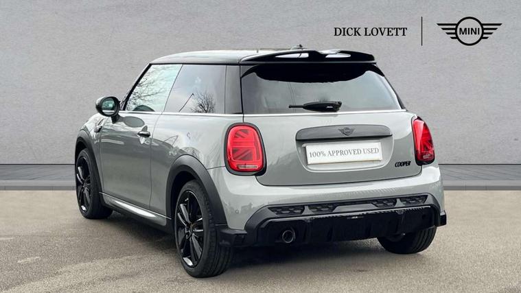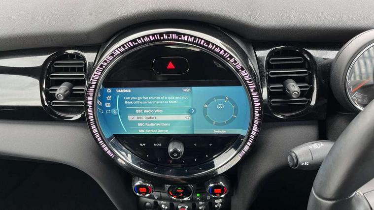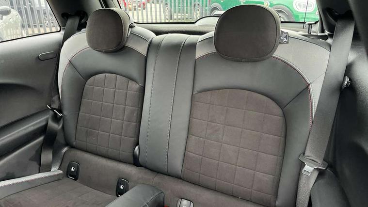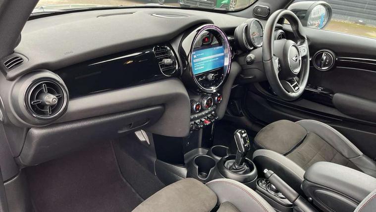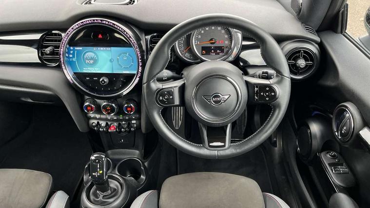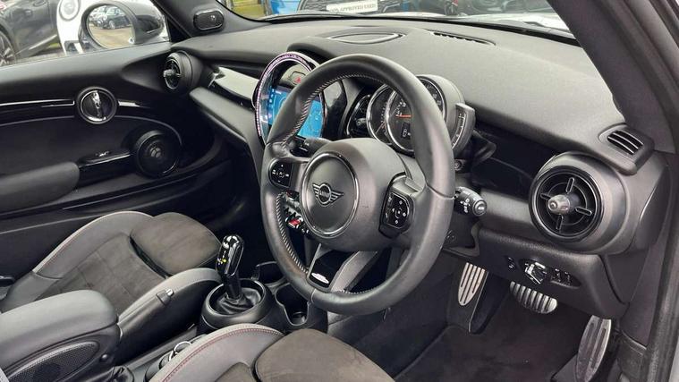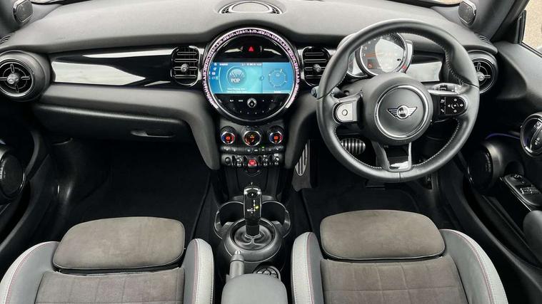 Automatic start/stop function with brake energy recuperation, Compatible mobile phone bluetooth with audio streaming, Cruise control with brake assist, Electro-mechanical speed dependant steering assistance, Flexible car sharing preparation, Instrument cluster, MINI Driving Modes - centre toggle switch to control driving setting (sport, mid and green), Mini E-call, MINI TeleServices, On board computer, Rear park distance control, Service interval indicator, Adaptive suspension, Double Vanos system, Fully variable valve control, High precision injection, Performance Control, Steptronic transmission with double clutch, 4 speakers in front door trims and underneath front seats, 8.8" touchscreen with LED ring, FM tuner and DAB digital radio, Automatic headlight activation switch, Body colour fuel filler cap, Chrome border high gloss black slats radiator grille, Dynamic brake lights, Electric front windows, Exhaust tailpipe on left with chrome finisher, Heated rear window, Heated windscreen washer jets, JCW Aerodynamic kit - Front and rear bumpers with sporty JCW styling and part-painted side sills with MINI John Cooper Works door sill finishers, John Cooper Works rear spoiler, LED headlight with closed ring and daytime driving lights, Metal door sill strips with MINI imprint, Model logo Cooper on right of tailgate, Rain sensor window wipers, Rear fog lights, Rear LED lights with union jack design, Rear window wiper, Side scuttle panel with integrated indicator, Sun/heat protection glass, White indicator lenses, 12V Accessory socket in centre console, 4 lashing eyes in luggage compartment, 60/40 split folding rear seat, Anthracite headliner including grab handles and clothes hooks, Carbon black colour line - Knee roll and door armrest, Chrome interior highlights, Cupholders, Front and rear isofix with front passenger airbag deactivation, Glove compartment, Height and length steering column adjustment, Interior lighting with 12 different colours across the dashboard, underneath door bezel with illuminated laser-engraved design on central display, JCW Sport seats with integrated headrests, adjustable thigh support and John Cooper Works logo, Leatherette gearshift lever and handbrake gaiters, LED reading lights, vanity mirror lights, front foot well light and spotlight on front seats, Manual air conditioning, Mechanical seat adjustment - forward/back & backrest for front seats and driver seat height adjust, Multifunction steering wheel, Passenger seat height adjuster, Storage compartments in doors, Sunvisors with vanity mirrors, Tool kit, Velour floor mats, Walknappa leather steering wheel with grey seam and John Cooper Works badge on Piano Black lower steering wheel spoke, Piano black exterior pack - Mini Hatchback Cooper, 3 point seatbelts on all four seats, 6 Airbags - front, side, head and seat belt tensioners, Anti-lock braking system (ABS), DSC - Dynamic Stability Control, Front and rear disc brakes, Single tone fanfare horn, Tyre pressure monitoring system, Alarm system with tilt sensor, monitoring doors, bonnet interior and tailgate, Electronic vehicle immobiliser, Start/stop toggle with keyless go, Piano black interior trim,