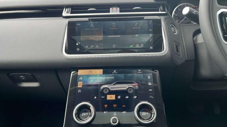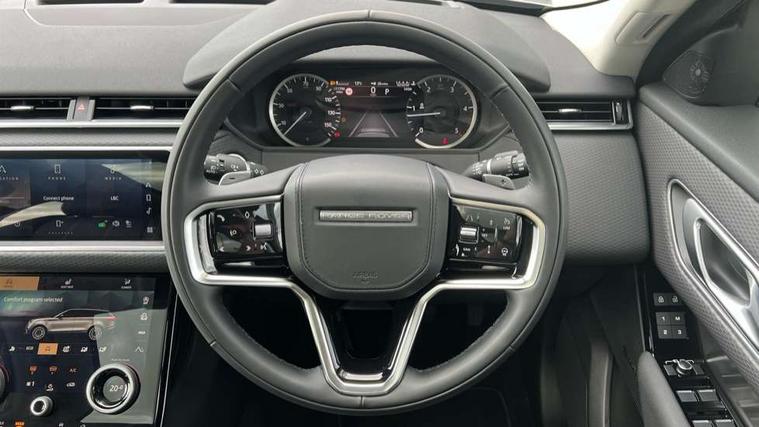 10" deployable touchscreen, Android Auto, Apple car play, Bluetooth connectivity, Brake pad wear indicator warning light, Driver condition monitor, eCall emergency call system, InControl remote, Land Rover InControl apps, Lane keep assist, Pivi pro with connected navigation, Push button start, Service indicator, Speed proportional electronic power assisted steering (EPAS), Traffic sign recognition with adaptive speed limiter, Trip computer, Voice control system, 8 speed automatic transmission, All terrain progress control, Open differential with torque vectoring by braking, Single speed transfer box, Digital Audio Broadcast radio-DAB, Steering wheel mounted controls, Acoustic laminated windscreen, Auto dimming interior rear view mirror, Automatic headlamp levelling, Automatic headlights, Body coloured bumpers, Boot protection plate, Electric heated/power fold door mirrors with approach lights and auto dimming driver side, Electric windows with one touch open/close and anti trap, Flush deployable exterior door handles, Follow me home headlights, Heated rear window with timer, Heated washer jets, Heated windscreen, LED 3rd brake light, Metal front tread plates, Metal load space scuff plates, No badge - Removes engine badge, Rain sensor windscreen wipers, Rear animated directional indicators, Rear fog lights, Rear side wing doors, Rear wash/wipe, Tailgate/boot lid spoiler, Trailer stability assist, Velar badge, 3 seat bench in 2nd row, Ambient lighting, Driver/passenger sunvisors with illuminated vanity mirrors, Isofix system on outer rear seats, Loadspace cover, Overhead lighting console, Overhead stowage for sunglasses, Passive front headrests, Rear air vents, Rear centre headrest, Satin chrome gearshift paddles, Single front passenger seat, Standard interior, Twin front cupholders, Twin sliding front centre armrest, Online pack with data plan - Velar, 355mm front brakes and 325mm rear brakes, 3x3 point rear seatbelts, Anti-lock braking system (ABS), Cornering brake control, Curtain airbags, Customer configurable autolock, Door side intrusion beams, Driver airbag, DSC - Dynamic Stability Control, Electronic brake force distribution, Electronic parking brake, Electronic traction control, Emergency brake assist, Emergency braking, Front and rear seatbelt reminder, Hill descent control, Hill launch assist, Low traction launch, Passenger airbag, Power operated child locks, Rear airbags, Roll stability control, Side airbags, Tyre pressure monitoring system, Unpainted brake calipers, Global lock and unlock switch on driver door, Immobiliser, Intrusion sensor, Keyless entry, Lock only switch on front passenger door, Locking wheel nuts, Perimetric alarm, Remote central locking, Standard IP end caps,