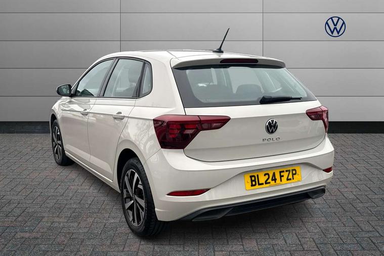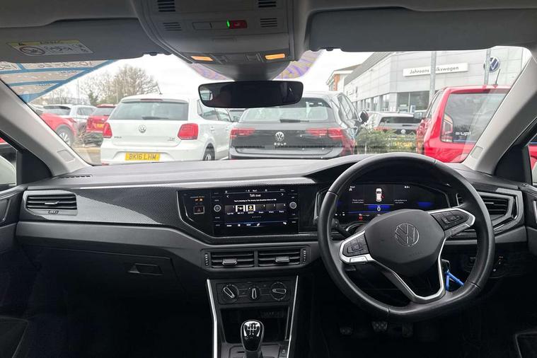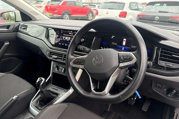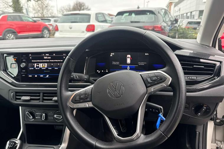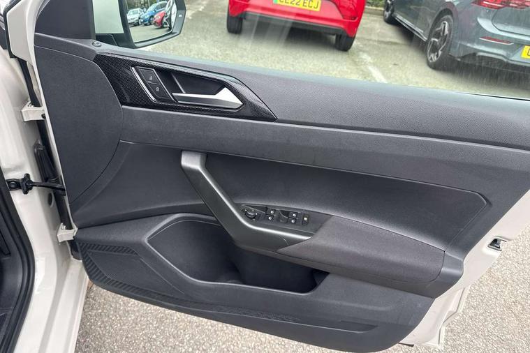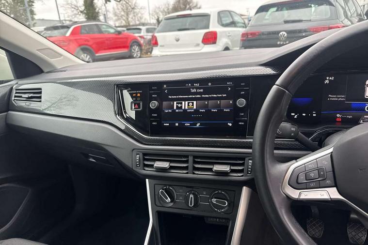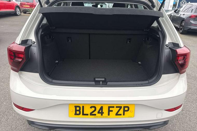 Adaptive cruise control without follow-to-stop and speed limiter, Advanced driver attention and drowsiness monitor, Bluetooth mobile phone interface, Dynamic road sign display, Emergency call service, Power assisted speed sensitive steering, Preparation for navigation system with media and internet package, Preparation for We connect and We connect plus, Speedo and rev counter, electronic odometer, trip, service interval display and exterior temperature gauge, Standard rear axle, Travel Assist - Lane keeping system and traffic jam assist, Travel assist including emergency assist, Trip computer, Warning signal and warning light for front and rear seatbelts not fastened, Washer fluid level indicator, Wireless app connect, Front wheel drive, Rear shock absorpion, Start-stop system with battery regeneration (recuperation - energy recovery during braking), DAB Digital radio, Diversity antenna for FM reception, Front and rear 6 speakers, Automatic dimming interior rear view mirror, Automatic headlight control with LED separate daytime running lights with coming/leaving home function, Body colour bumpers with chrome inserts, Body colour door handles, Body colour door mirrors, Electric front windows, Engine badge deletion, Headlight range adjustment, Heat insulating and laminated safety glass windshield, Heat insulating darkened glass in side and rear windows, Heat insulating glass windscreen, LED Headlights, LED rear combination lamps, Power folding adjustable/heated exterior mirrors and front passenger exterior mirror lowering function, Rain sensor, Rear electric windows, Rear fog light, Rear side wing doors, Rear windscreen washer and wiper with interval delay, Third brake light, 12V power socket in centre console, 2 front and 2 rear reading lights with switch off delay and dimmer, 2 USB-C ports in the front, 2 USB-C charging sockets on the center console in the rear, 3 rear head restraints, 60/40 split folding rear seat and rear seat bench not split, Ceramique roof lining, Chrome plated radiator grille inserts, air vent surrounds and light switch surrounds, Door and side trim panel, Driver and front passenger seat height adjustment, Driver/passenger sunvisors with illuminated vanity mirrors, Front centre armrest, Front seat backrest storage pockets, Front standard seats, Handbrake lever handle in leather, Hartley/Thomas cloth upholstery, Headliner in recycled material, Isofix child seat preparation easy-fit (for two outer rear seats, and front passenger seat) compatible with I-size, Leather trimmed gear knob, Luggage compartment cover, Luggage compartment lighting, Removable luggage compartment floor, Single front passenger seat, Standard climatic zones, Standard pedal cluster, Three spoke leather wrapped multifunction steering wheel, Light and vision pack - Polo, 3 point height adj front seatbelts + pretensioners, 3x3 point rear seatbelts, ABS, Driver and front passenger airbag with front passenger airbag deactivation, Drivers and front passengers safety optimised head restraints, ESC (Electronic stability control) + EDL (Electronic Differntial lock) and ASR (Traction control), Extended and predictive pedestrian/ cyclist protection, Front assist with autonomous emergency braking (for Adaptive Cruise Control ACC up to 130 mph), Front curtain and side airbags with center airbag, Front disc brakes, Hill hold control, Manual child lock in rear doors, Rear drum brakes, Single tone horn, Tyre pressure loss indicator, Alarm with interior protection, Anti-theft alarm system with interior monitoring, backup horn, and towing protection, Anti-theft wheel bolts, Electronic engine immobiliser, Lava stone black gloss/matt decorative inserts in dash and front door panels, Low rolling resistance tyres,