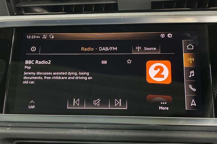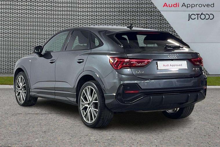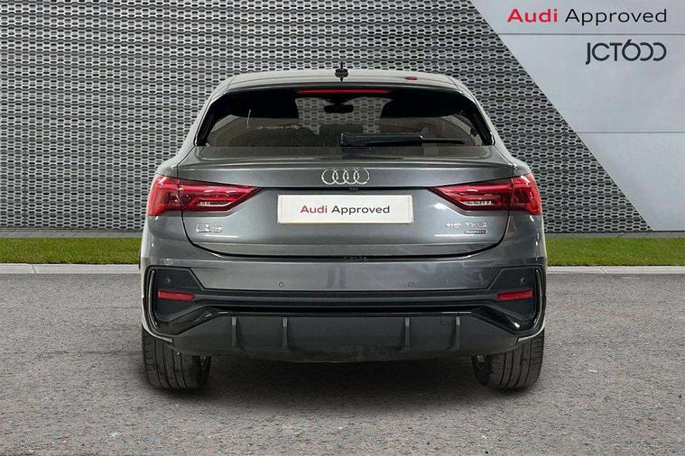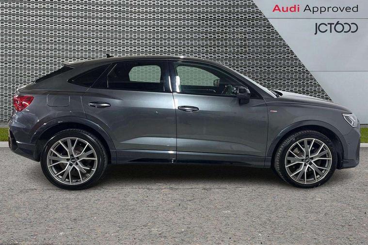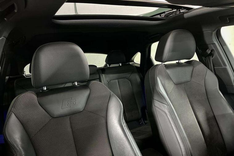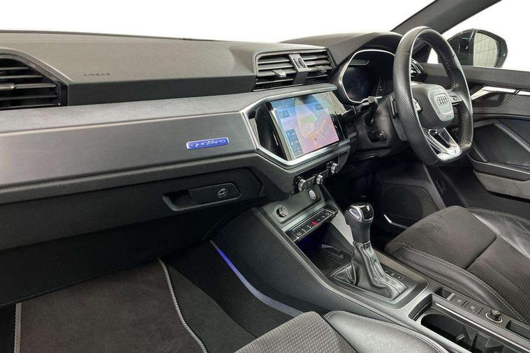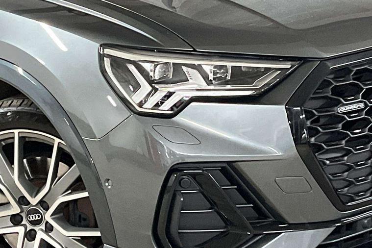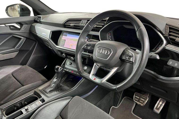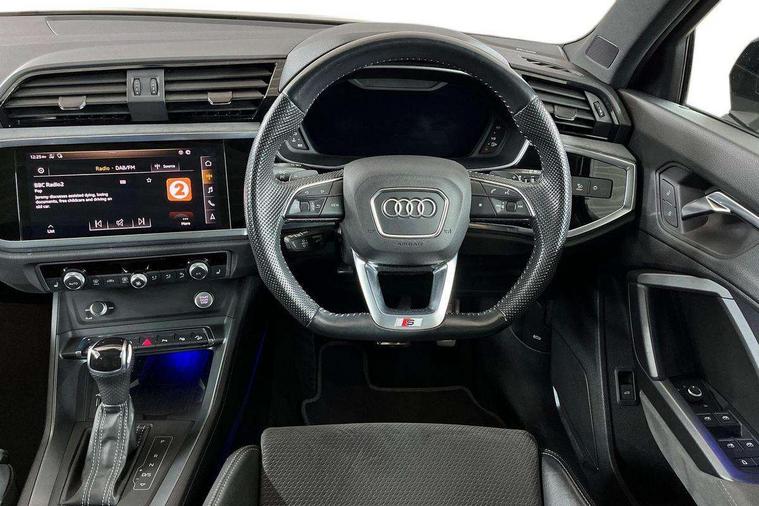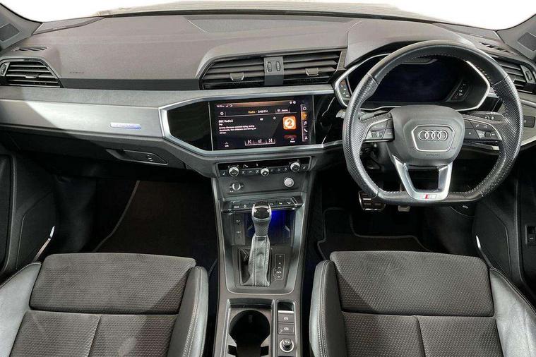 360 degree parking camera, Audi connect safety and service (e-call), Audi drive select, Audi lane departure warning, Audi phone box with wireless charging, Audi side assist, Audi virtual cockpit plus, Bluetooth interface, Camera based traffic sign recognition, MMI Navigation Plus with high resolution 10.1 inch touchscreen colour display, Power operated tailgate, Progressive steering, Rear cross traffic alert, Service interval indicator, Smartphone interface includes wireless Apple carplay/Android Auto, Start stop system with recuperation, Voice control system with natural language interaction, Adaptive suspension with damping control, 1 x USB type C and 1 USB type A charging points, Bang + Olufsen 3D sound system, DAB digital radio module, Acoustic windscreen, Audi Beam uses LEDs to project Vorsprung logo, Auto dimming door mirrors, Auto dimming frameless rear view mirror, Bumpers and underbody protection in contrasting manhattan grey paint finish, Diffuser grille in grained matt black, Diffuser trim in selenite silver, Electrically folding, adjustable and heated door mirrors with integrated LED side indicators and kerb view function for passenger side, Front and rear electric windows, Front fog lights, Front side air inlets in selenite silver, Headlight washers, High gloss black finish B and C pillars, LED daytime running lights, Matrix LED headlights with LED rear lights and dynamic front and rear indicator, Panoramic opening glass sunroof, Privacy glass dark tinted rear and rear-side windows (from B-pillar backwards), Rain and light sensors, Rear underbody protection in matt black, 12V socket in rear centre console, 3 spoke flat bottomed high multi-function leather sport steering wheel with gearshift paddles, 4 way electric lumbar support for driver and front passenger, 40:20:40 folding with manual adjustment for 60:40 forwards/backwards position and backrest angle, Adjustable rear seat bench/backrest with centre armrest and cupholder, Black cloth headlining, Dual zone electronic climate control, Electrically adjustable front seats, Front and rear black floor mats with contrast stitching, Front and rear headrests, Front and rear roof module including reading lights, Front centre armrest, Glove compartment lighting, Heated front seats, Height and reach adjustable steering wheel, Illuminated door sill trims with S logo, ISOFIX child seat mounting for front passenger with airbag deactivation and outer rear seat including top tether attachment point for outer rear seats, Luggage compartment light, Perforated leather gearknob, Stainless steel luggage compartment sill finisher, Stainless steel pedals, Black styling pack - Q3, Driver Assistance Pack - Q3, Multi coloured extended ambient interior lighting pack - Q3, Non smoking pack - Q3, 3x3 point rear seatbelts, 6 airbags - Driver, front passenger, curtain and side windows, Audi pre-sense front with pedestrain and cyclist recognition, Electrically operated child locks on rear doors, Electromechanical parking brake, Electronic stabilisation control including ABS, ASR and EDL, Hill descent control, Hill hold assist, Pre sense basic, Seatbelt monitoring, Tyre pressure warning, Warning triangle and first aid kit, Advanced key, Anti theft alarm, Anti theft wheel bolts, Remote central locking, Black dashboard, Detail dashboard around MMI touch colour display in glass look, black with surround in aluminium look, Leatherette door armrest,