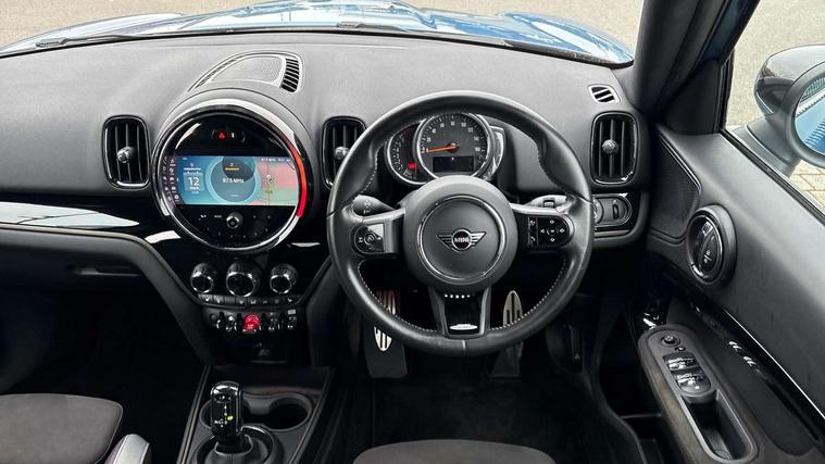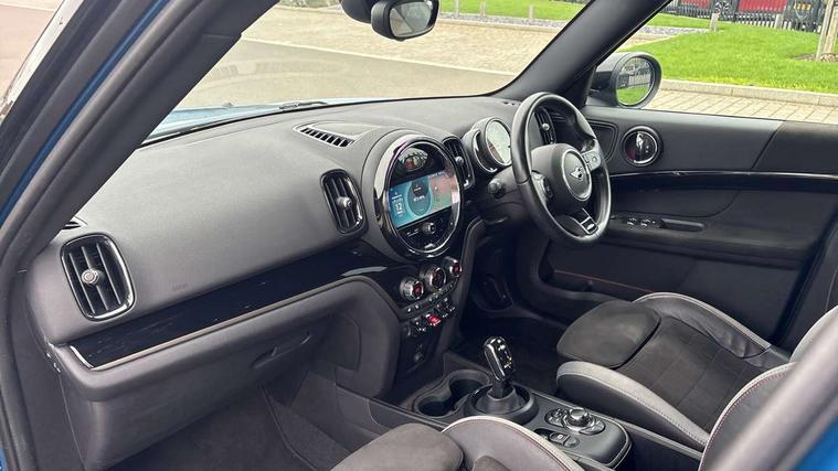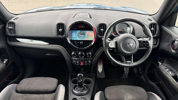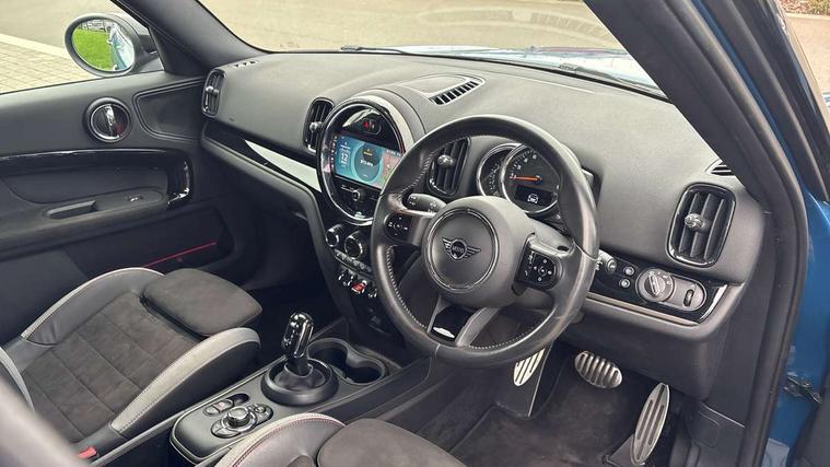 Active Guard incl speed limiting and lane departure functions with auto steering, and front collision warning with brake intervention, Automatic start/stop function with brake energy recuperation, Compatible mobile phone bluetooth with audio streaming, Cruise control with brake assist, Electro-mechanical speed dependant steering assistance, Instrument cluster, MINI Driving Modes - centre toggle switch to control driving setting (sport, mid and green), Mini E-call, On board computer, Rear parking distance control, 51 Litre fuel tank, Double Vanos system, Fully variable valve control, High precision injection, Performance Control, Steptronic transmission with double clutch, FM tuner and DAB digital radio, 3rd brake light, Body colour fuel filler cap, Day time driving lights, Door sill strips, Dynamic brake lights, Electric windows, Heated rear window, Heated windscreen washer jets, John Cooper Works - aerodynamic kit (front and rear apron, spoiler), front and rear sport bumpers and part-painted side sills with door sill finishers, John Cooper Works Logo, LED fog lights, LED Headlights, Model logo, Model logo on Tailgate, Rain sensor with auto headlights, Rear fog lights, Rear side wing doors, Rear window wiper, Side scuttle panel with integrated indicator, Split rear doors, Sun/heat protection glass, White indicator lenses, 12V socket in centre console, 3 seat bench in 2nd row, 360L luggage compartment capacity, 4 lashing eyes in luggage compartment, 40:20:40 split folding rear seats, Anthracite headlining with grab handles and clothes hooks, Chrome interior highlights, Colour line - Carbon black, Cupholders, English handbook, Floor mats, Front headrests, Glove compartment, Height and length steering column adjustment, Interior lighting with 12 basic colours selectable via toggle switch in roof, Isofix rear child seat preparation, LED reading lights, vanity mirror lights, front foot well light and spotlight on front seats, Manual air conditioning, Mini John Cooper Works leather gearshift lever and handbrake gaiters, Multifunction steering wheel, Nappa leather steering wheel with MINI Yours logo, Rear headrests, Single front passenger seat, Stainless steel pedals and foot rest, Storage compartments in doors, Sunvisors with vanity mirrors, Tool kit, Excitement pack - Countryman, Navigation pack - Countryman, Piano black exterior pack - Countryman, 2 tone horn, 3 point seatbelts on all seats, 6 Airbags - front, side, head and seat belt tensioners, Anti-lock braking system (ABS), DSC - Dynamic Stability Control, Electronic handbrake, Front and rear disc brakes, Hill start assist, Manual rear child locks, Tyre pressure monitoring system, Alarm system with tilt sensor, monitoring doors, bonnet interior and tailgate, Auto drive away locking, Deadlocking function, Electronic vehicle immobiliser, Locking wheel bolts, Start/stop toggle with keyless go, Piano black JCW interior trim,
