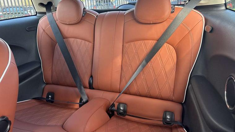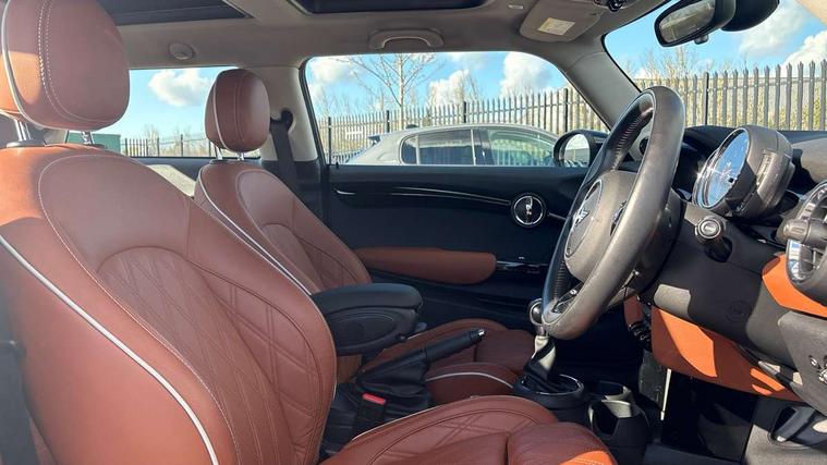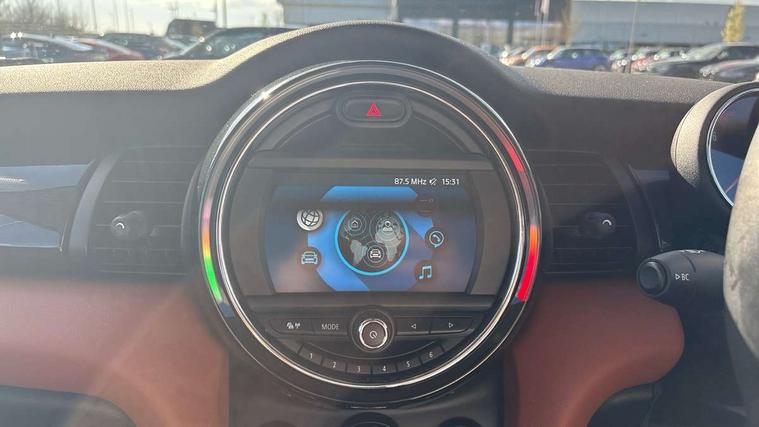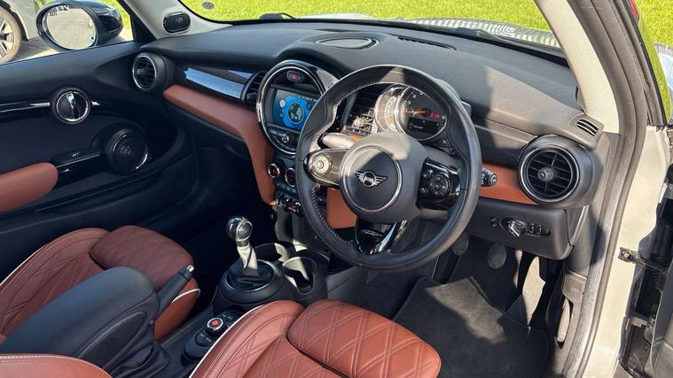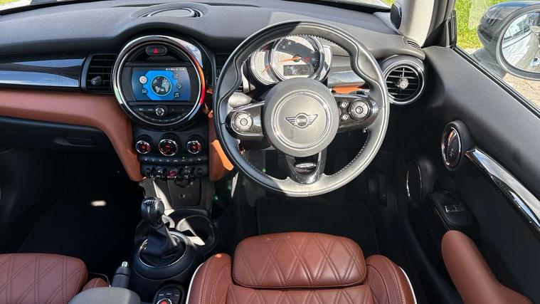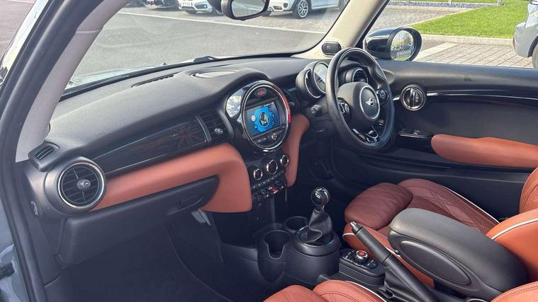 Automatic start/stop function with brake energy recuperation, Compatible mobile phone bluetooth with audio streaming, Electro-mechanical speed dependant steering assistance, Instrument cluster, Mini E-call, MINI TeleServices, On board computer, Service interval indicator, 6 Speed manual transmission including gear change indicator display, Double Vanos system, Fully variable valve control, High precision injection, 6.5" touchscreen with LED ring, FM tuner and DAB digital radio, Automatic headlight activation switch, Body colour fuel filler cap, Chrome border high gloss black slats radiator grille, Chrome line exterior, Dynamic brake lights, Electric front+rear windows, Heated rear window, Heated windscreen washer jets, LED headlight with closed ring and daytime driving lights, Left exhaust tailpipe with chrome finisher, Metal door sill strips with MINI imprint, Model logo Cooper on right of tailgate, Radiator grille bars, tailgate handle, lower front grille grating, rear central fog light in chrome, Rain sensor window wipers, Rear fog lights, Rear LED lights with union jack design, Rear window wiper, Side scuttle panel with integrated indicator, Sun/heat protection glass, White indicator lenses, 12V Accessory socket in centre console, 4 lashing eyes in luggage compartment, 60/40 split folding rear seat, Air vents, gear lever base, speakers in doors, door handles in chrome, Chrome interior highlights, Cupholders, Front and rear head restraints, Front and rear isofix with front passenger airbag deactivation, Glove compartment, Height and length steering column adjustment, Interior lighting with 12 basic colours selectable via toggle switch in roof, Knee roll and door armrests, Leather gearshift lever and handbrake gaiters, LED reading lights, vanity mirror lights, front foot well light and spotlight on front seats, Manual air conditioning, Mechanical seat adjustment, driver seat height adjust, forward/back and front seats backrest, Mini logo projection on floor from drivers exterior mirror, MINI Yours leather steering wheel with silver contrasting stitching with MINI Yours badge, Multifunction steering wheel, Storage compartments in doors, Sunvisors with vanity mirrors, Tool kit, 3 point seatbelts on all four seats, 6 Airbags - front, side, head and seat belt tensioners, Anti-lock braking system (ABS), DSC - Dynamic Stability Control, Front and rear disc brakes, Hill start assist, Single tone fanfare horn, Tyre pressure monitoring system, Alarm system with tilt sensor, monitoring doors, bonnet interior and tailgate, Electronic vehicle immobiliser, Start/stop toggle with keyless go, Chrome line interior,