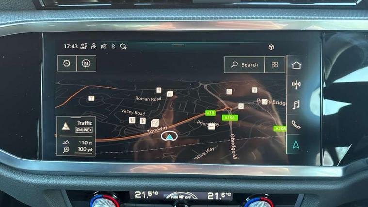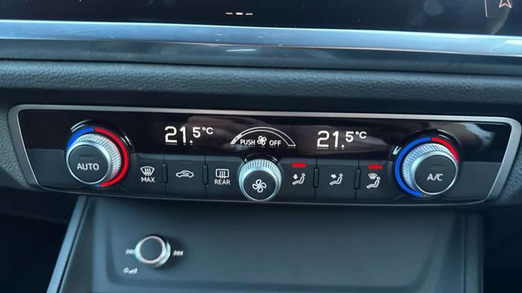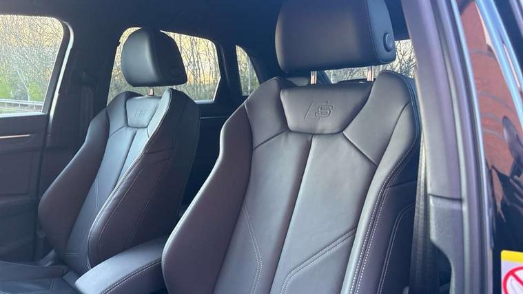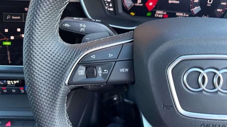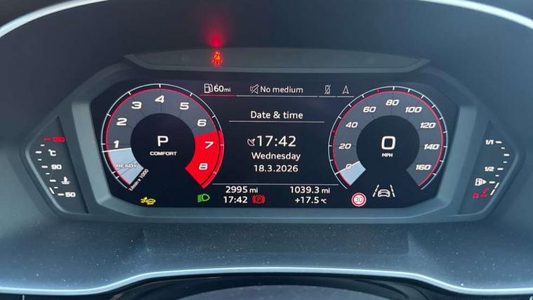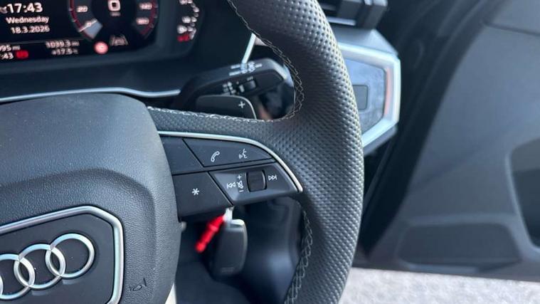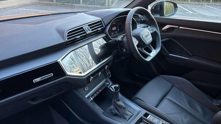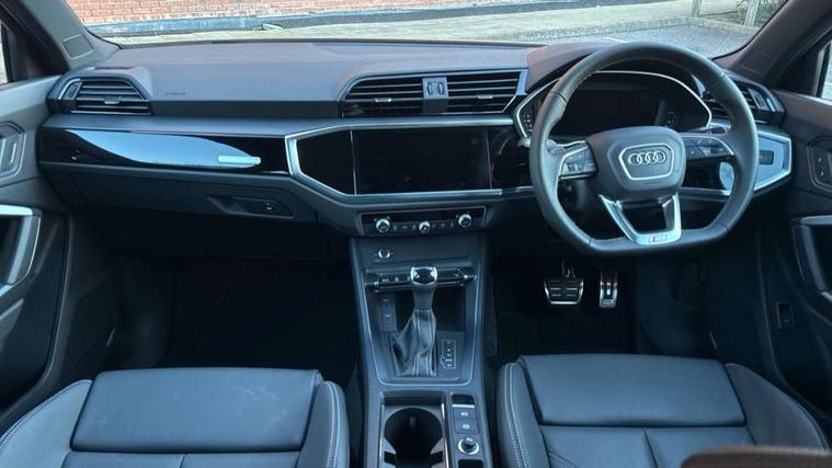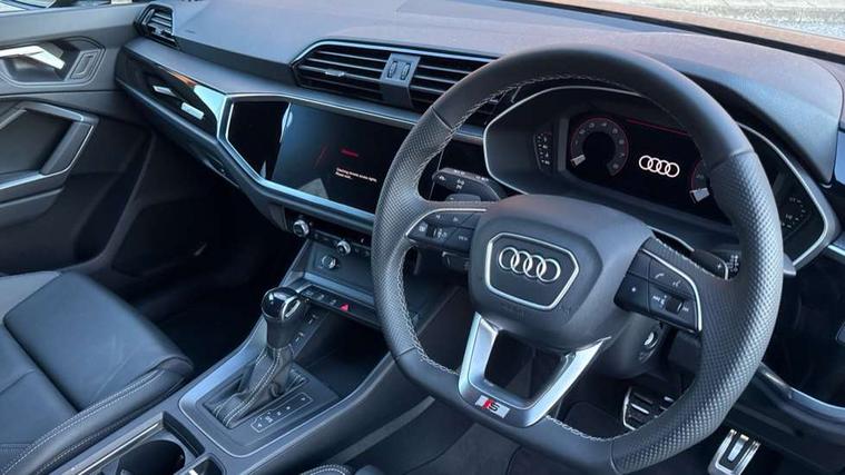 Amazon alexa Integration, Audi connect safety and service, Audi drive select, Audi lane departure warning, Audi Virtual Cockpit - 10.25" display, Bluetooth interface, Camera based traffic sign recognition, Distraction and Fatigue warning, Legal emergency call, MMI Navigation Plus with high resolution 10.1 inch touchscreen colour display, Power operated tailgate, Progressive steering, Service interval indicator, Smartphone interface includes wireless Apple carplay/Android Auto, Start stop system with recuperation, Voice control system with natural language interaction, Sports suspension, 2 USB-C ports with charge and data functions, 6 passive loudspeakers, DAB digital radio module, Acoustic windscreen, Anthracite black radiator grille, Audi Beam uses LEDs to project the Audi logo onto the ground as you exit your Q3, Auto dimming door mirrors, Auto dimming frameless rear view mirror, Black roof rails, Electrically folding, adjustable and heated door mirrors with integrated LED side indicators and kerb view function for passenger side, Front and rear electric windows, Front fog lights, Grille vertical bars in aluminium silver/Matt, High gloss black finish B and C pillars, LED Dynamic rear indicators, LED headlights with LED daytime running lights, LED rear lights, LED third brake light, Privacy glass dark tinted rear and rear-side windows (from B-pillar backwards), Rain and light sensors, Rear diffuser grille in grained matt black, Rear diffuser strip in matt anthracite black, Rear side wing doors, Rear wiper, S line bumpers in contrasting Manhattan grey, Variable front intermittent wipers, 12V socket in rear centre console, 3 seat bench in 2nd row, 40:20:40 folding with manual adjustment for 60:40 forwards/backwards position and backrest angle, Adjustable rear seat bench/backrest with centre armrest and cupholder, Black carpet mats, Black cloth headlining, Dual zone electronic climate control, Electric lumbar support, Front and rear black floor mats with contrast stitching in rock grey, Front and rear headrests, Front centre armrest, Height and reach adjustable steering wheel, Illuminated door sill trims with S logo, ISOFIX child seat mounting for front passenger with airbag deactivation and outer rear seat including top tether attachment point for outer rear seats, Luggage compartment sill protection in stainless steel, Manual front seats with height adjustment, Perforated leather gearknob, Single front passenger seat, Stainless steel pedals, Twin leather upholstery with front sport seats + S embossing, Black styling pack - Q3, Non smoking pack - Q3, 3x3 point rear seatbelts, 6 airbags - Driver, front passenger, curtain and side windows, Audi pre-sense front with pedestrain and cyclist recognition, Electrically operated child locks on rear doors, Electromechanical parking brake, Electronic stabilisation control including ABS, ASR and EDL, Front seatbelt reminder, Hill descent control, Hill hold assist, Pre sense basic, Seatbelt monitoring, Tyre pressure warning, Warning triangle and first aid kit, Anti theft wheel bolts, Immobiliser, Remote central locking, Thatcham approved category 1 anti theft alarm, Aluminium look interior elements, Detail dashboard around MMI touch colour display in glass look, black with surround in aluminium look, Leatherette door armrest, Piano black inlay,
