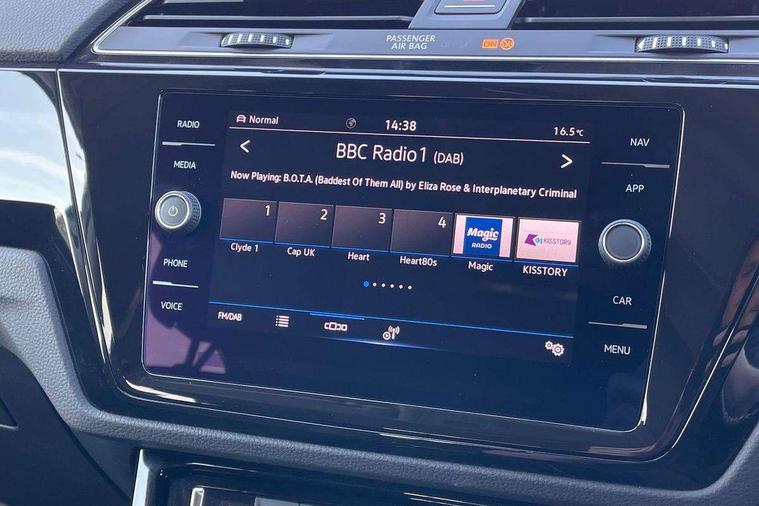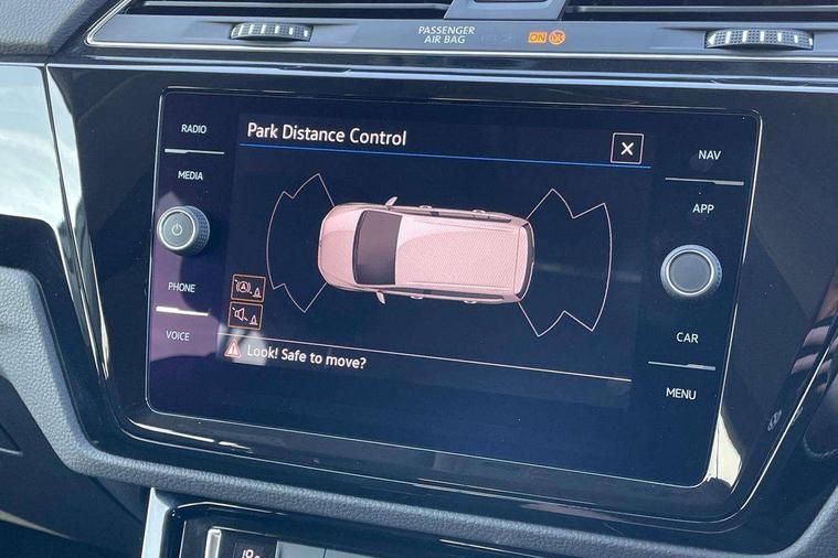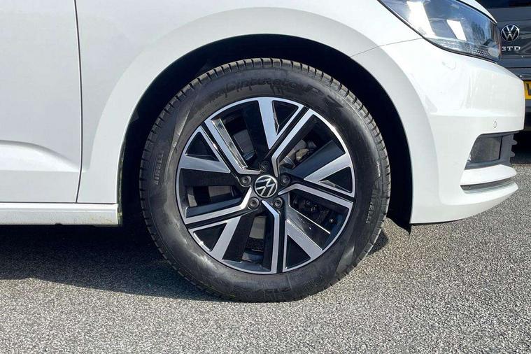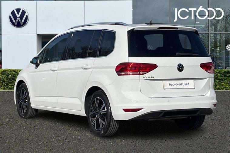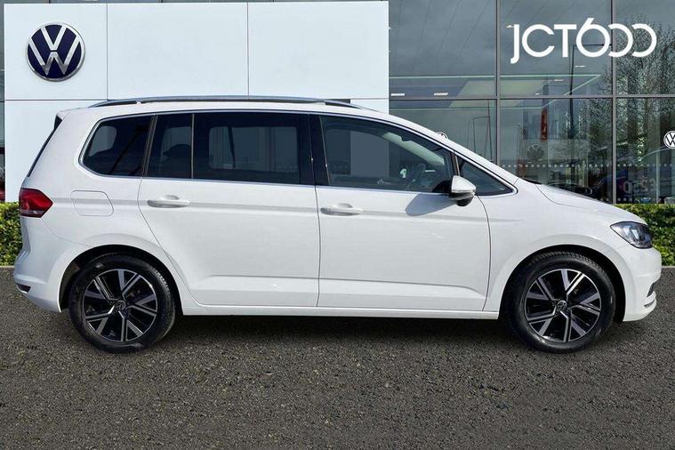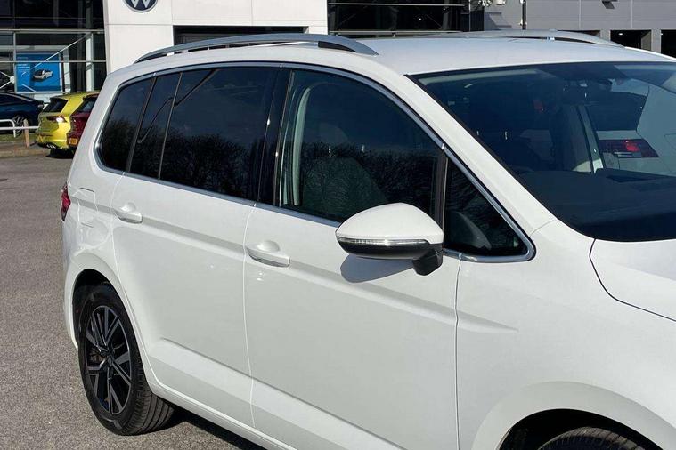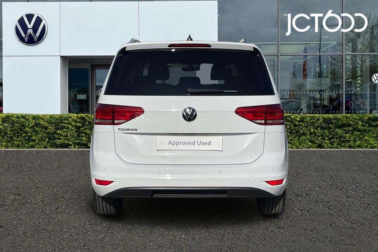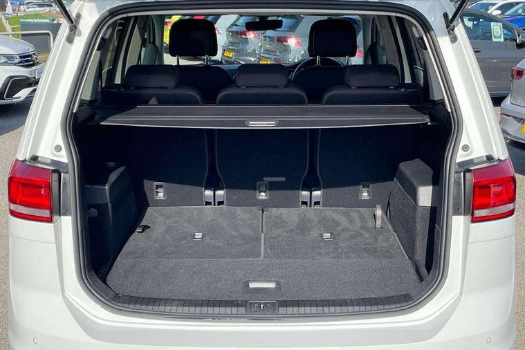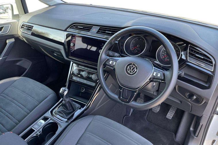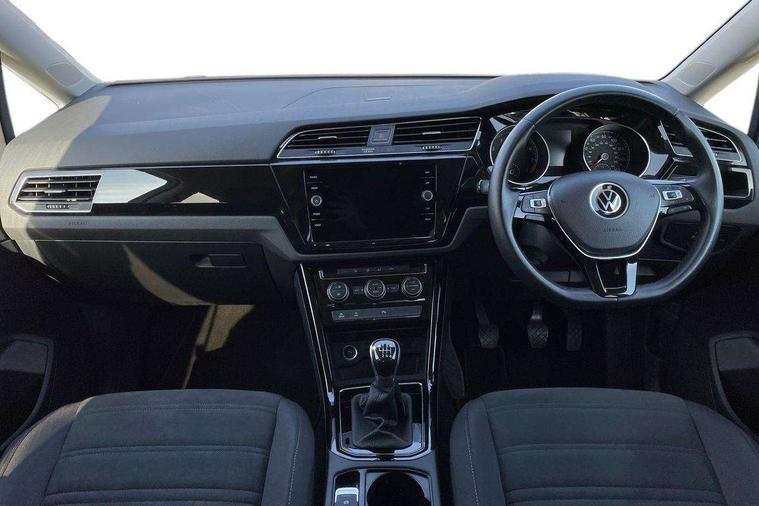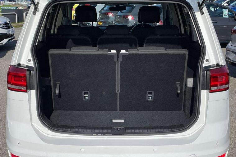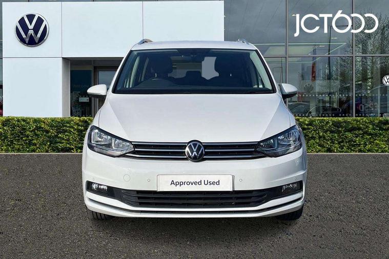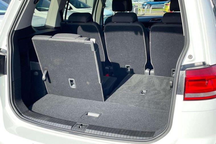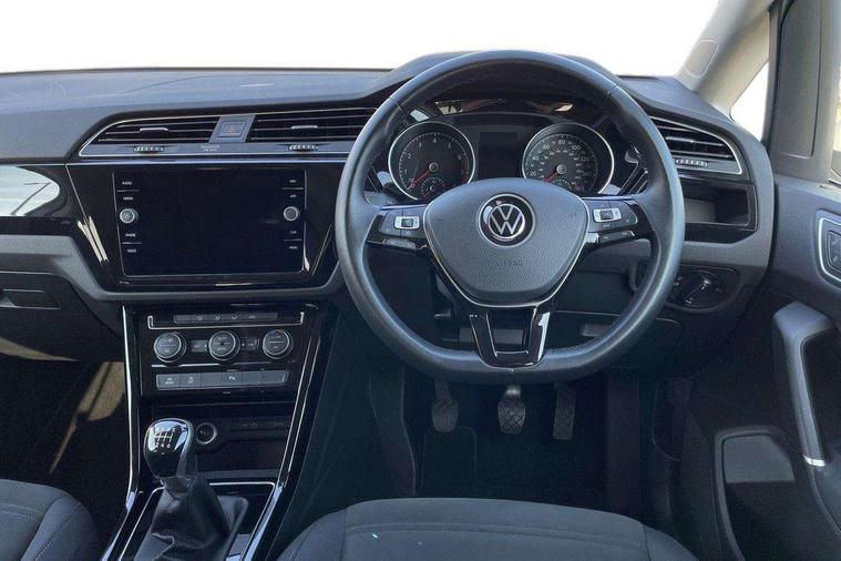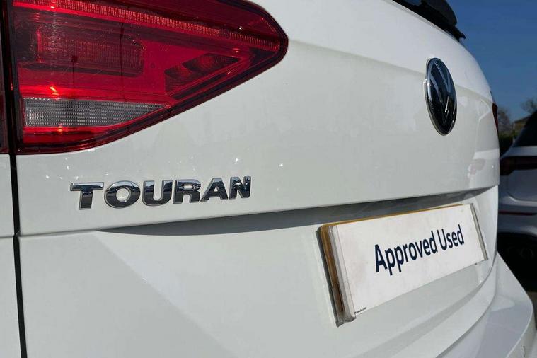 Adaptive cruise control, Audible lights on warning, Bluetooth telephone connectivity, Car information display, Driver alert system, Driver electronic voice amplification function, Electronic odometer, External temperature gauge, Flat tyre indicator, Mobile pairing with SMS function, Multifunction colour display, Rev counter with fuel gauge, Speed limiter, Speed sensitive power steering, Stop/start system, Think blue trainer driver tips and journey analysis, Trip and service interval display, Petrol Particulate Filter, XDS electronic differential lock, 4x20 watt output, Audio Connectivity System, DAB Digital radio, MP3/WMA compatability, SD card slot, Title and cover art display, USB connection, Aerial integrated into side window, Body colour bumpers, Body colour door handles, Body colour door mirrors with integral indicators, Chrome fog light surround, Chrome lower front bumper insert, Chrome trimmed front air intake surrounds, Chrome trimmed radiator grille louvre inserts, Chrome trimmed side windows, Dusk sensor + auto driving lights, Electric folding door mirrors with reverse activated kerb-view adjustment on passenger's door mirror, Front and rear electric windows, Front fog lights with static cornering function, Fully galvanised body, Gloss black finish B pillar, Green tinted heat insulating glass, High level third brake light, Rear tinted glass from B-pillar backwards approx 65% tinted, Rear wash/wipe with intermittent wipe setting, Silver roof rails, Tailgate wiper- reverse gear activation, Twin chrome exhaust tailpipes, Volkswagen roundel, Windscreen wipers intermittent wipe, 12V power point for Row 2, 12V socket in luggage compartment, 2 individual fold flat 3rd row seats, 2 three point seatbelts in 3rd row, 2nd row centre armrest, 2nd row centre seat converts into table, 3 single slide/fold/removable 2nd row seats, 3 spoke steering wheel, 3 Zone electronic climate control with automatic air recirculation, 3x3 point seatbelts on 2nd row with height adjust on outer seats, 4 boot load lashing points, 4 way adjustable front head restraints, 5 headrests, Ambient lighting in door trim and foot well, Driver and front passenger under seat drawer, Dust/pollen filters, Foldable front passenger seat backrest, Front + rear carpet mats, Front and rear reading lights, Front centre armrest with storage compartment, Front cupholders x 2, Front seat storage pockets, Front seatback folding tables, Height adjustable driver's seat, Height/reach adjust steering wheel, Illuminated glovebox, Illuminated vanity mirrors, Instrument lighting white adjustable panel illumination with red night time illumination, Interior light with delay, Isofix on 2nd row outer seats, Isofix on 3rd row seats, Large storage compartment in roof console, Leatherette on rear of front seats, Low tunnel 2nd row seat, Media box in dashboard on passenger side, Multi storage in passenger/luggage areas, Multi-function centre console with storage facilities, Retractable luggage cover, Split folding rear seat backrests, Storage bins on all doors, Convenience Pack - Touran, Mirror pack - Touran, 3 point height adjustable front seatbelts, Auto hold function, Automatic post collision braking system, Door open warning reflectors, Driver/Front Passenger airbags, Drivers knee airbag, EDL + ASR, Electronic parking brake, Energy recovery system, ESC with ABS, First aid kit, Front and rear (row 2) curtain airbags, Front assist including city emergency braking, Front seat side impact airbags, Front/rear disc brakes, Hill hold control, Hydraulic Brake Assist (HBA), Loose wheel warning function, Manual passenger airbag deactivation function, Pre crash preventive occupant protection, Seatbelt warning lamp and buzzer, Traction control, Two tone horn, Warning triangle, Alarm with remote central locking and interior protection, Electronic engine immobiliser, Chrome plated instrument surrounds, Piano black decorative inserts, Tyre mobility system,