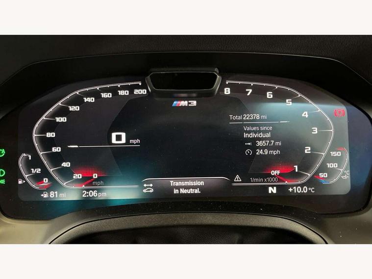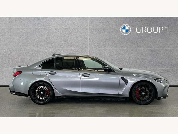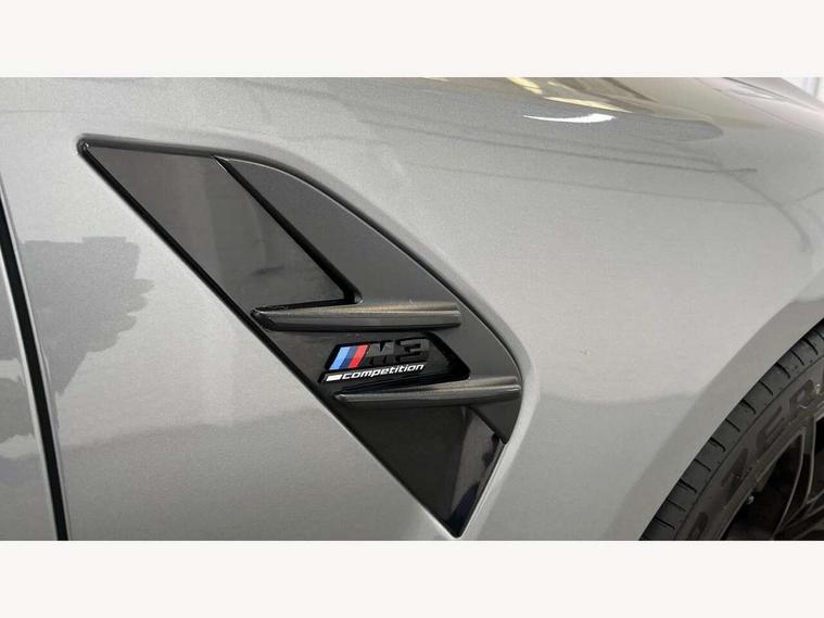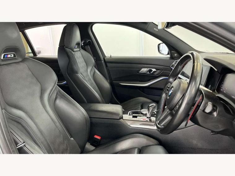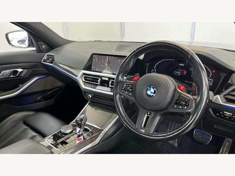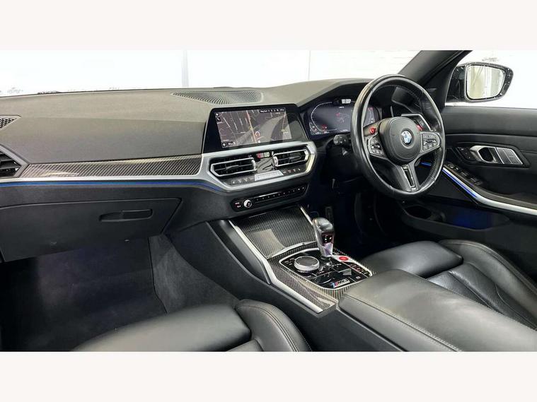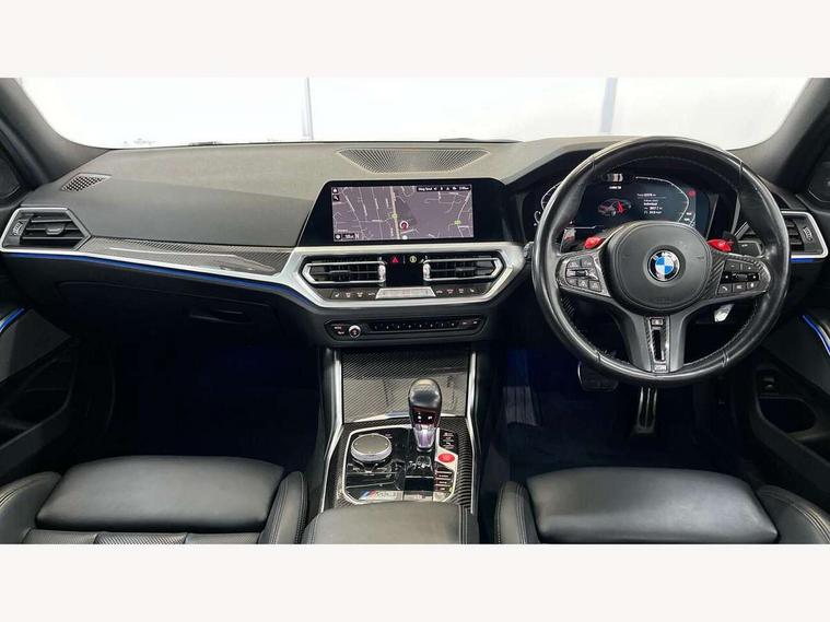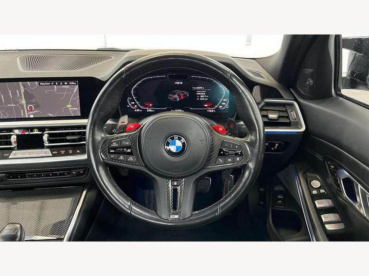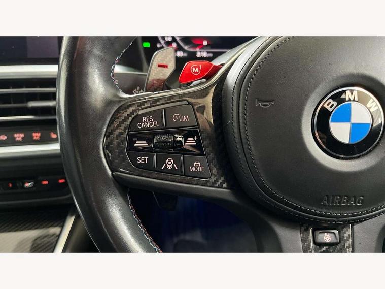 Active guard plus, Automatic start/stop system, Bluetooth functionality with Apple CarPlay/Android Auto, BMW iDrive controller on centre console, BMW legal emergency call, BMW Live Cockpit Professional sat nav system with 12.3" instrument display and high resolution control display, BMW Online services, BMW Teleservices, Brake pad wear indicator warning light, Condition based service, Connected drive services, Door/boot open warning light, Driving experience switch, Electric Power Steering (EPS) with Servotronic, Instrument cluster with extended contents, Lights on warning, M drive buttons, Oil sensor for level and grade, warning by check control system, Oil temperature gauge, On board computer, On board diagnostics, Optimum shift indicator, Outside temperature display, Pull away assistant, Run flat indicator, Service interval indicator, Speed limiter, Widescreen display, Adaptive M Sport suspension, Double joint spring strut front axle, Electronic differential lock control (EDLC), M Drive Professional including track mode, laptimer, traction control & Drift analyser, M Sport differential, M steptronic sport transmission with drivelogic, Safety battery terminal clamp, 8 programmable favourite buttons, Auxiliary point for auxiliary devices, BMW professional radio/CD/MP3, DAB Digital radio, Harman/Kardon loudspeaker system, 3rd brake light, Acoustic glazing, Auto dimming driver's door mirror, Auto dimming rear view mirror, Automatic headlights + automatic windscreen wipers, Black chrome exhaust tailpipes, Black model designation badges, BMW emblem on engine compartment lid and tailgate, BMW high gloss shadow line with extended contents, BMW Individual shadowline lights, Body colour bumpers, Body colour door handles, Carbon fibre reinforced plastic (CFRP) roof, Day time running light, Door mirror integrated indicators, Door sill finishers with aluminium inserts, Dynamic brake lights, Electric adjustable heated door mirrors, Electric folding door mirrors, Electric front and rear windows with one touch/convenient open/close function, Follow me home headlights, Front and rear apron plastic in body colour, Front and rear bumper system, Headlight beam throw control, Heat protection, sun protection glazing, Heated rear window with automatic switch off, High beam assistant, High gloss black frameless kidney grille with M badge, LED number plate light, LED tail lights with 3D L-shaped LED light design, M designation, Mirror glass aspheric on driver's side, convex on passenger side, Rear boot, Rear fog lights, Rear reflectors, Rear right M3 competition inscription, Rear side wing doors, Reversing light, Shark fin roof aerial, Strakes in front side panel, black matt/black high-gloss, with model badge, Visible VIN plate, Welcome lighting, Windscreen wipers with integrated washing jets, 2 cupholders in front centre console, 2 x 12 V Power sockets (luggage compartment and front centre console), 2 x USB Type C ports for charging and data transmission in front centre console, 2 x USB Type C ports for charging in rear centre console, 3 folding rear headrests, 3 seat bench in 2nd row, Ambient lighting, Anthracite headlining, Battery in luggage compartment, Carbon fibre centre console incl. cover for cupholders, Carbon fibre decorative steering wheel finishers, Carbon fibre shift paddles, Carbon fibre strip in instrument panel on front passenger side, Centre console armrest with storage compartment, Compartment in front of cupholder, Driver/passenger sunvisors with illuminated vanity mirrors + covers, Electric front seats + driver memory, English handbook, Floor mats in velour, Footwell lighting, Front and rear door exit lights, Front door storage bins with bottle holder, Front interior light, Front isofix attachment + airbag deactivation, Front seat backrest width adjustment, Front seats lumbar support, Front/rear door armrests, Gearshift lever with embossed M badge, Heated front seats, Height adjustable front headrests, Interior mirror lighting, Isofix on 2nd row outer seats, Lockable/illuminated glovebox, Luggage compartment lighting, Manual 40:20:40 split folding rear seat with two tilt positions for backrest, Rake/reach adjustable steering wheel, Single front passenger seat, Storage compartment in rear doors, Storage tray and compartment with cover in centre console, Three zone automatic air conditioning, Through loading system, Toolkit located in luggage compartment, Wireless charging tray, Additional storage compartment pack - M3, Connected package professional - M3, High gloss shadowline exterior trim pack - M3, 3 point seatbelts on all seats, ABS/EBD, Automatic Stability Control (ASC), Brake energy regeneration, Brake fade compensation, Compound structure brake discs, Cornering brake control (CBC), Crash sensor, Driver/Front Passenger airbags, Dry braking, Dynamic brake control, Dynamic Stability Control with M Dynamic mode, Dynamic Traction Control - DTC, Electromechanical parking brake, Front and rear head airbags, Front seat side impact airbags, Front seatbelt pretensioners + load limiters, Hill start assist, M Sport seat belts, Rear child proof door locks, Seatbelt warning, Side impact protection, Two tone horn, Tyre pressure sensor, Warning triangle and first aid kit, Digital key, Electronic immobiliser, Remote central locking, Thatcham cat 1 remote alarm, Vehicle Key with 4 buttons including the integrated key, Galvanic finish to control surrounds, High gloss black interior trim, Tyre repair kit,