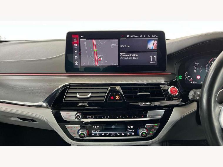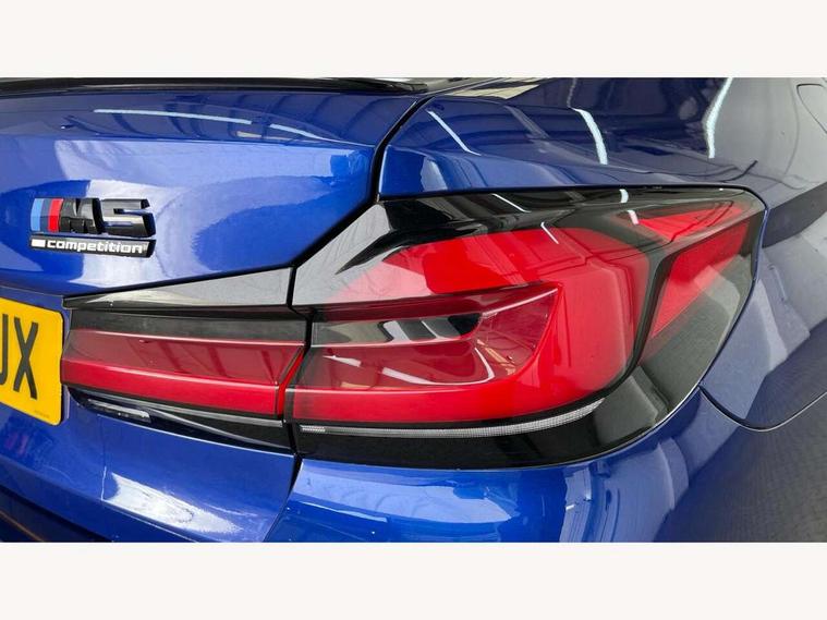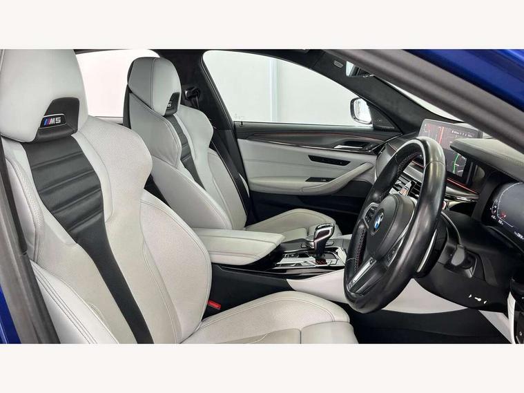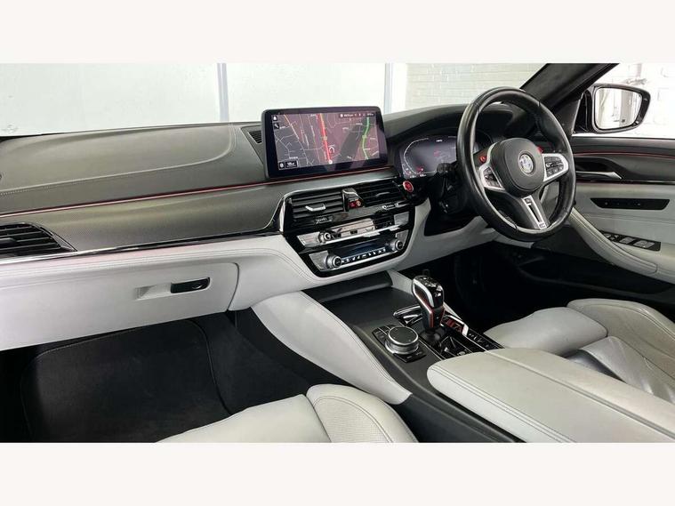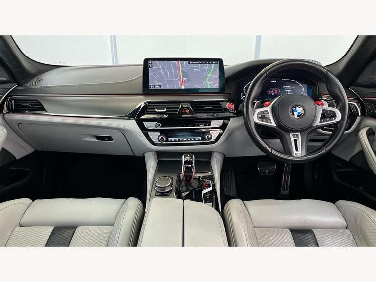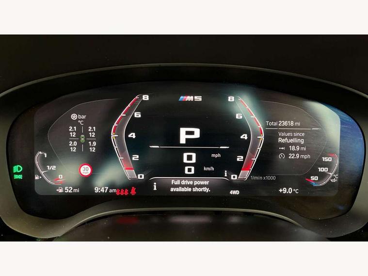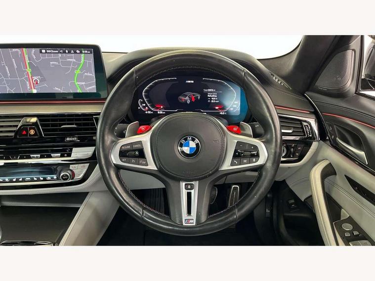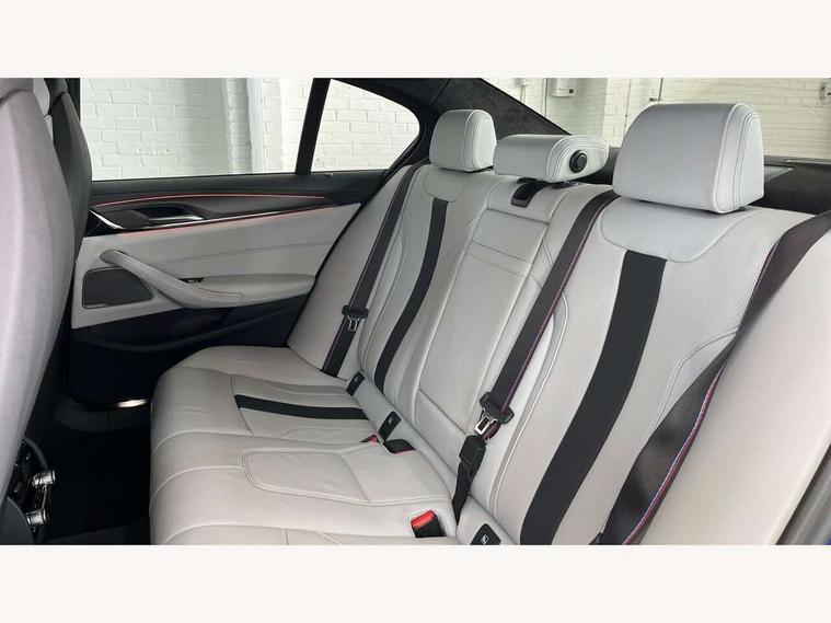 32GB hard disc drive (HDD) memory, Active Guard, BMW ConnectedDrive online services, BMW Drive recorder, BMW gesture control, BMW Head up display, BMW legal emergency call, BMW Live Cockpit Professional sat nav system with 12.3" instrument display and high resolution control display, BMW Teleservices, Brake force display, Comfort access system with smart opener, Electric boot lid - electrically opening/closing rear tailgate, Enhanced bluetooth with wireless charging, iDrive touch controller with shortcut buttons, M Servotronic steering, Oil sensor for level and grade, On board computer (OBC) includes average speed, fuel consumption and range, journey computer, outside temperature display, personal profile functions, On-board diagnosis - OBD, Powered by Operating System 7.0, Service interval indicator, Start/stop button in red, Wi-Fi hotspot, Adaptive suspension with dynamic damping control, Catalytic converter, Double wishbone front axle, Eight speed M Steptronic sport transmission with drivelogic and gearshift paddle switches on steering wheel includes launch control, Engine cover with M designation, High precision direct injection, Integral rear axle, Petrol Particulate Filter, Rear biased M specific xDrive setup, VALVETRONIC with Double VANOS, DAB tuner, Favourite buttons, All round anti-corrosion system, Auto dimming door mirrors, Black exhaust tailpipes, BMW Individual high gloss shadow line includes exterior mirror frame, window frame surround, B pillar finish, air breather in high gloss black, BMW individual lights shadow line, Body coloured bumpers, Body coloured door handles inserts, Carbon fibre roof, Door handle illumination, Dynamic brake lights with LED technology, Electric front and rear windows with fingertip open/close + anti-trap all round and comfort closing function, Follow me home headlight function, Heated windscreen washer jets, High beam assistant, High level LED brake light, Illuminated door sill finishers with M5 designation, Interior rear view electrochromatic mirror with automatic anti dazzle function, LED daytime running lights, M rear spoiler, M specific electrically adjustable/foldable/heated exterior mirrors with integrated direction indicators, M Sport exhaust system, Rain sensor including auto headlights activation, Rear boot, Rear side wing doors, Sun protection glazing, 12V power sockets 2 x rear, 1 x luggage compartment (additional 1 X double USB adaptor with 2A charging current), 3 seat bench in 2nd row, 4 zone control automatic air conditioning, Ambient interior lighting with 11 pre-defined selectable light designs including 6 colours, Armrest - front and rear integrated door trim, centre console includes storage compartment, rear centre includes 2 cupholders, Battery in luggage compartment with jump start facility in engine bay, Black velour front and rear floor mats with M piping, Child seat ISOFIX attachment with rear outer seats includes top tether, Cup holders (2 front and 2 rear), Driver and front passenger lumbar support, Electric seat adjustment with memory, Front and rear footwell lights, Front and rear reading lights, Headrests for all seats, Height and length electric adjustment steering column, Lockable glove compartment with light, M leather steering wheel, M multifunctional sport seats driver and front passenger with comfort electric height adjust headrests and illuminated M5 logo headrests, Multifunction controls for leather steering wheel, Single front passenger seat, Through loading system with 40/20/40 split folding rear seat, BMW Individual high gloss shadow line with extended contents pack - M5, Connected package professional - M5, Parking assistant plus pack - M5, Airbags - driver/front passenger, rear and side, first and second row seats head airbags, front passenger seat airbag deactivation, Anti-lock braking system (ABS), Automatic Stability Control (ASC), Brake assist function, Brake energy regeneration, Child locks on rear doors, Cornering brake control (CBC), Crash sensor activating central locking release, hazard warning lights, fuel cut off and interior lighting, Deformation zones - front and rear with door reinforcements and bumpers up to 2.5 mph, DSC - Dynamic Stability Control, Dynamic brake control, Dynamic Traction Control - DTC, Electromechanical parking brake with automatic drive away release and auto hold function, Electronic brake force distribution, Impact-dependent airbag system, M Sport seatbelts, Motor Slip Regulation (MSR) - Engine Drag Torque Control, Seat belts front inertia reel with pyrotechnical belt latch tensioner, belt force limiter and belt restrainer, Side impact protection, Three inertia reel rear seatbelts, Two tone horn, Tyre pressure indicator, Warning triangle and first aid kit, Alarm system (Thatcham 1) with remote control and electronic engine immobiliser, Locking wheel bolts, Galvanic embellisher for controls, Tyre repair kit,