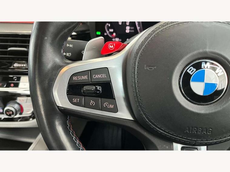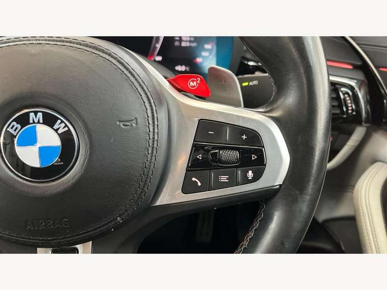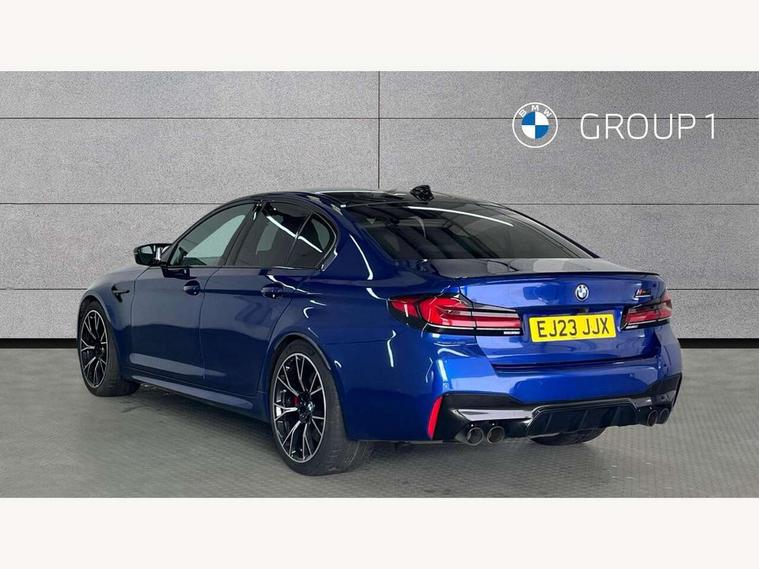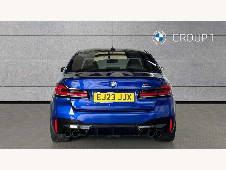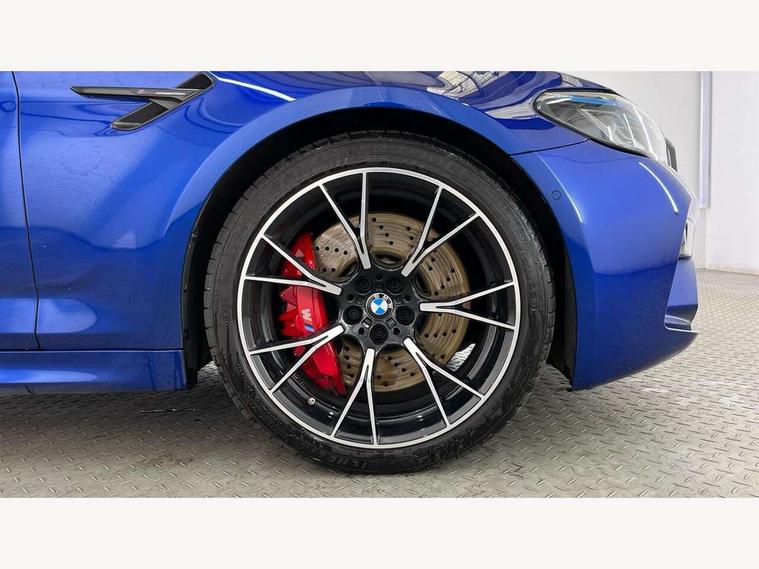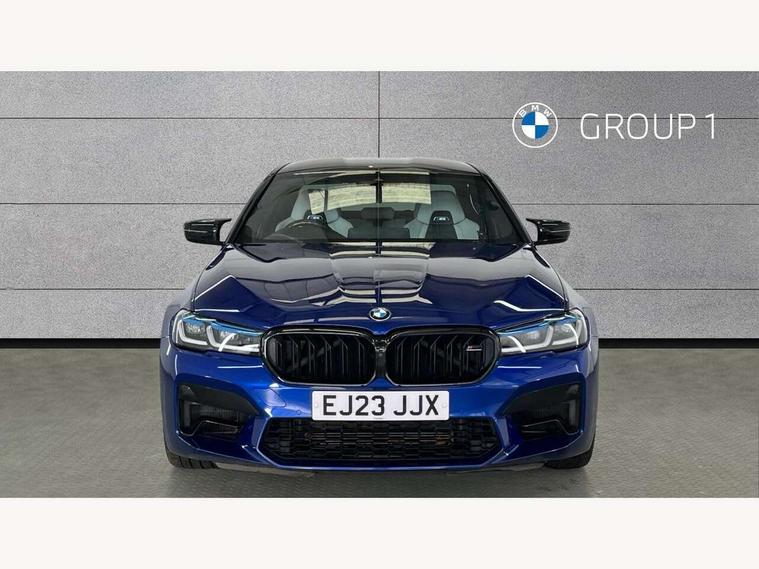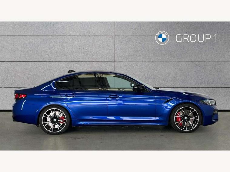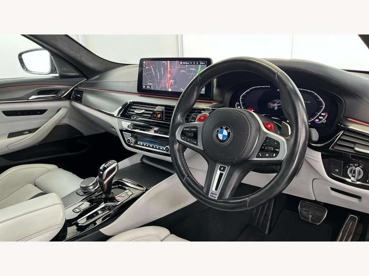 32GB hard disc drive (HDD) memory, Active Guard, BMW ConnectedDrive online services, BMW Drive recorder, BMW gesture control, BMW Head up display, BMW legal emergency call, BMW Live Cockpit Professional sat nav system with 12.3" instrument display and high resolution control display, BMW Teleservices, Brake force display, Comfort access system with smart opener, Electric boot lid - electrically opening/closing rear tailgate, Enhanced bluetooth with wireless charging, iDrive touch controller with shortcut buttons, M Servotronic steering, Oil sensor for level and grade, On board computer (OBC) includes average speed, fuel consumption and range, journey computer, outside temperature display, personal profile functions, On-board diagnosis - OBD, Powered by Operating System 7.0, Service interval indicator, Start/stop button in red, Wi-Fi hotspot, Adaptive suspension with dynamic damping control, Catalytic converter, Double wishbone front axle, Eight speed M Steptronic sport transmission with drivelogic and gearshift paddle switches on steering wheel includes launch control, Engine cover with M designation, High precision direct injection, Integral rear axle, Petrol Particulate Filter, Rear biased M specific xDrive setup, VALVETRONIC with Double VANOS, DAB tuner, Favourite buttons, All round anti-corrosion system, Auto dimming door mirrors, Black exhaust tailpipes, BMW Individual high gloss shadow line includes exterior mirror frame, window frame surround, B pillar finish, air breather in high gloss black, BMW individual lights shadow line, Body coloured bumpers, Body coloured door handles inserts, Carbon fibre roof, Door handle illumination, Dynamic brake lights with LED technology, Electric front and rear windows with fingertip open/close + anti-trap all round and comfort closing function, Follow me home headlight function, Heated windscreen washer jets, High beam assistant, High level LED brake light, Illuminated door sill finishers with M5 designation, Interior rear view electrochromatic mirror with automatic anti dazzle function, LED daytime running lights, M rear spoiler, M specific electrically adjustable/foldable/heated exterior mirrors with integrated direction indicators, M Sport exhaust system, Rain sensor including auto headlights activation, Rear boot, Rear side wing doors, Sun protection glazing, 12V power sockets 2 x rear, 1 x luggage compartment (additional 1 X double USB adaptor with 2A charging current), 3 seat bench in 2nd row, 4 zone control automatic air conditioning, Ambient interior lighting with 11 pre-defined selectable light designs including 6 colours, Armrest - front and rear integrated door trim, centre console includes storage compartment, rear centre includes 2 cupholders, Battery in luggage compartment with jump start facility in engine bay, Black velour front and rear floor mats with M piping, Child seat ISOFIX attachment with rear outer seats includes top tether, Cup holders (2 front and 2 rear), Driver and front passenger lumbar support, Electric seat adjustment with memory, Front and rear footwell lights, Front and rear reading lights, Headrests for all seats, Height and length electric adjustment steering column, Lockable glove compartment with light, M leather steering wheel, M multifunctional sport seats driver and front passenger with comfort electric height adjust headrests and illuminated M5 logo headrests, Multifunction controls for leather steering wheel, Single front passenger seat, Through loading system with 40/20/40 split folding rear seat, BMW Individual high gloss shadow line with extended contents pack - M5, Connected package professional - M5, Parking assistant plus pack - M5, Airbags - driver/front passenger, rear and side, first and second row seats head airbags, front passenger seat airbag deactivation, Anti-lock braking system (ABS), Automatic Stability Control (ASC), Brake assist function, Brake energy regeneration, Child locks on rear doors, Cornering brake control (CBC), Crash sensor activating central locking release, hazard warning lights, fuel cut off and interior lighting, Deformation zones - front and rear with door reinforcements and bumpers up to 2.5 mph, DSC - Dynamic Stability Control, Dynamic brake control, Dynamic Traction Control - DTC, Electromechanical parking brake with automatic drive away release and auto hold function, Electronic brake force distribution, Impact-dependent airbag system, M Sport seatbelts, Motor Slip Regulation (MSR) - Engine Drag Torque Control, Seat belts front inertia reel with pyrotechnical belt latch tensioner, belt force limiter and belt restrainer, Side impact protection, Three inertia reel rear seatbelts, Two tone horn, Tyre pressure indicator, Warning triangle and first aid kit, Alarm system (Thatcham 1) with remote control and electronic engine immobiliser, Locking wheel bolts, Galvanic embellisher for controls, Tyre repair kit,