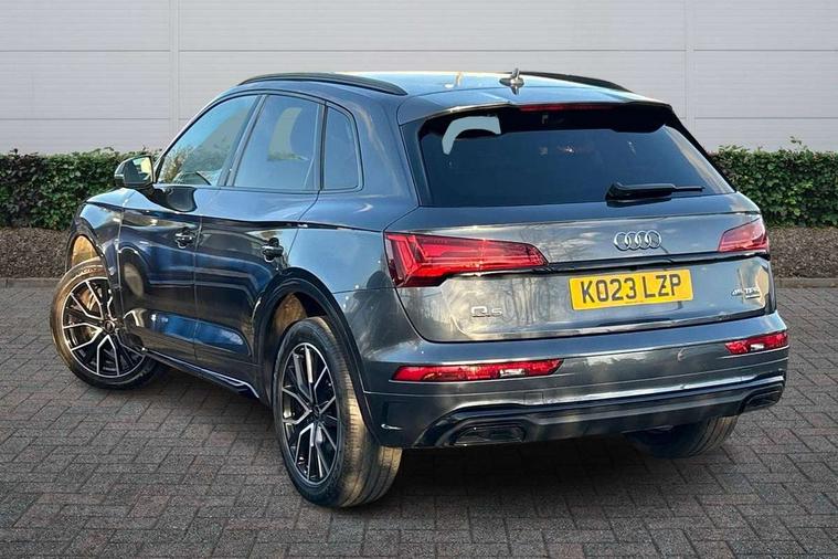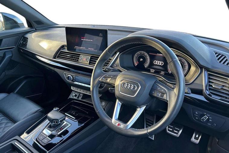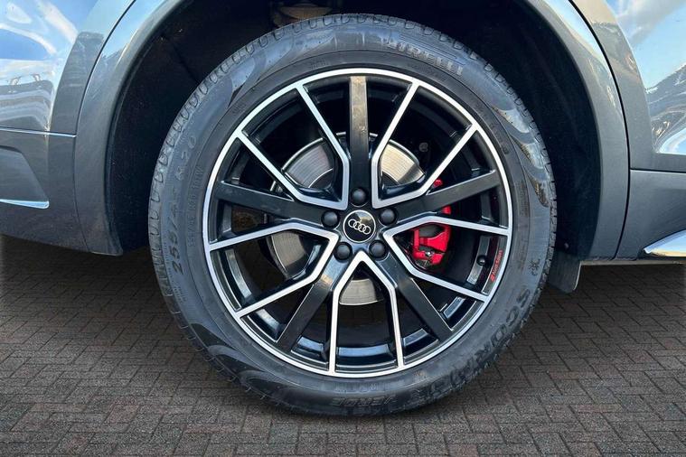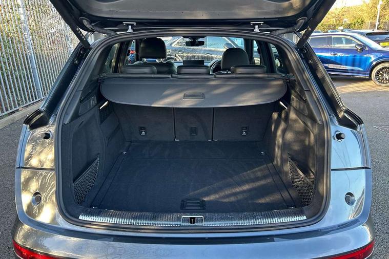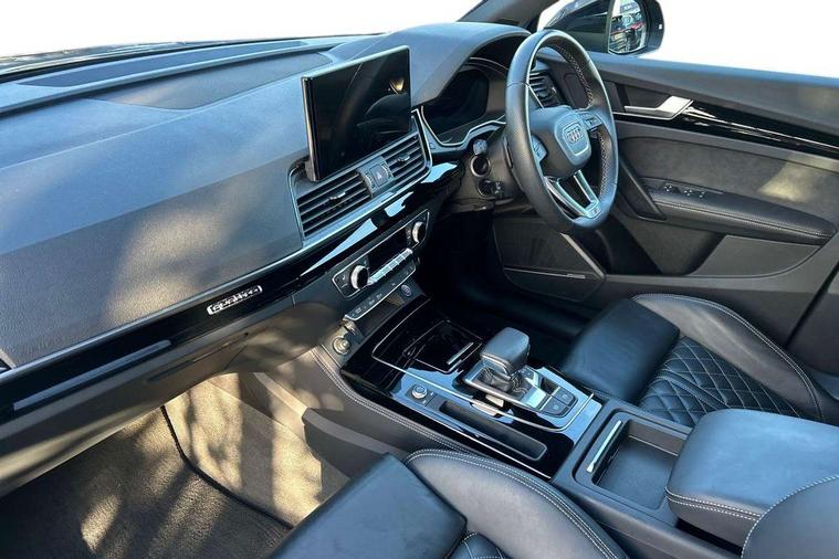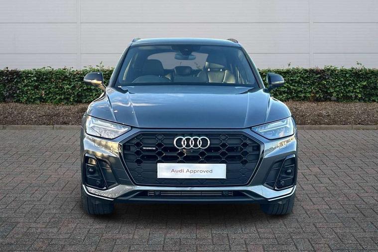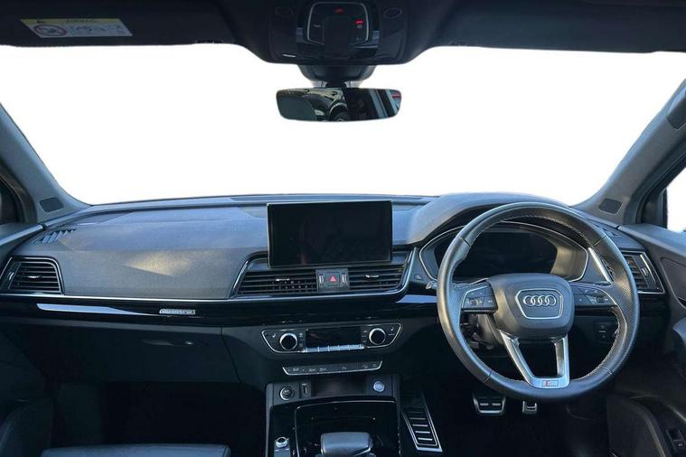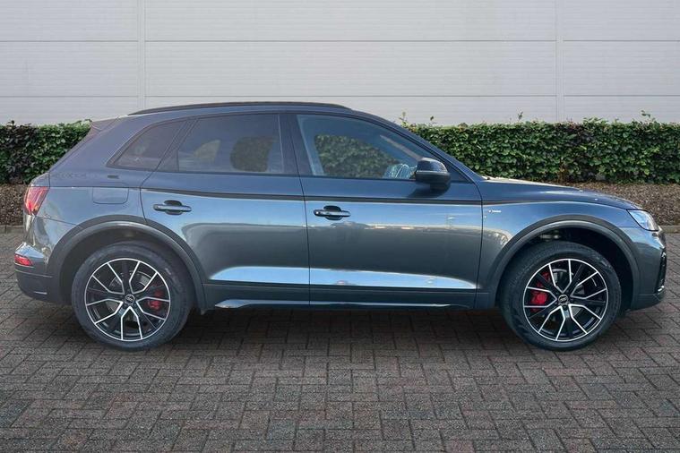 Acoustic front and rear parking sensor, Audi connect safety and service (e-call), Audi connect with Amazon Alexa Integration, Audi drive select, Audi virtual cockpit plus with 12.3" screen and three different layout designs, Audi wireless smartphone interface, Automatic start-stop system with coasting functionality and efficiency programme, Bluetooth interface, Electro - mechanical power assisted steering, MMI navigation plus with 10.1" touch screen, Power tailgate, Reversing camera, Service interval indicator, Voice control system with Audi hotword activation "Hey Audi", Quattro on demand, S line sports suspension, 2 x USB charging port with aux input socket, 8 loudspeakers, DAB Digital radio, Acoustic windscreen, Audi matrix LED headlights with dynamic front and rear indicators, Audi rings at front and rear in black, Audi rings decal on rear doors, Auto dimming door mirrors, Auto dimming frameless rear view mirror, Automatic headlight adjustment, Automatic headlights and windscreen wipers, Black roof rails, Body colour bumpers, Body colour underbody protection, Chrome plated exhaust trims, Daytime running lights, Door sills in Selenite silver, Electric adjustable/heated/folding door mirrors, Front air inlet surrounds in anthracite black, Front and rear electric windows, Headlight washers, High gloss black B pillar trims and triangular rear door trim, High level LED brake light, Rear chrome trim strip below lights, Rear privacy glass and rear side windows, Rear side wing doors, Rear wiper, Roof bars, S Line rear spoiler, 3 rear headrests, 4 way electric lumbar support for driver and front passenger, 40:20:40 split folding 3 rear bench seat in 2nd row with rear centre armrest, Black cloth headlining, Comfort front centre armrest, Contrast stitching on seats, steering wheel and gear lever gaiter, Deluxe 3 zone electronic climate control, Electrically adjustable front seats, Fine Nappa leather upholstery with diamond pattern contrast stitching + front sport seats with S embossed logo, Front/rear floor mats, Gear lever in black leather, Heated front seats, Height adjustable front head restraints, Height/reach adjustable steering column, Illuminated door sill trims with S logo, Luggage compartment cover, Rear seat bench plus-adjust for forwards/backwards position/backrest angle, cupholders in the armrest, load through hatch and remote backrest release, Removable luggage compartment floor, Single front passenger seat, Stainless steel pedals, Sunvisors with vanity mirrors, Black styling package - Q5 Edition 1, Extended interior upholstery pack - Q5, Extended LED Interior multi coloured Lighting Pack - Q5, 3 point seatbelts on all seats, 6 airbags - Driver, front passenger, curtain and side airbags, Electrically operated child locks on rear doors, Electromechanical parking brake, Electronic stabilisation control including ABS, ASR and EDL, First aid kit with warning triangle and vests, Front and rear brake calipers painted in red, Front passenger airbag deactivation, Hill descent control, Hill hold assist, ISOFIX child seat mounting for front passenger seat and ISOFIX child seat mounting with Top Tether for outer rear seats, Multi collision brake assist, Pop-up bonnet for pedestrian protection, Pre sense city, Seat belt force limiter, Seatbelt monitoring, Tyre pressure warning, Anti theft alarm, Anti-theft wheel bolts, Keyless Go access/ignition system, Remote central locking, Air vents inserts and centre console in gloss black, Piano black finish inlay,