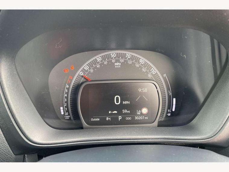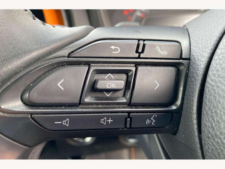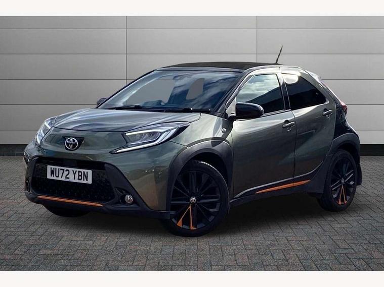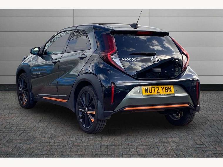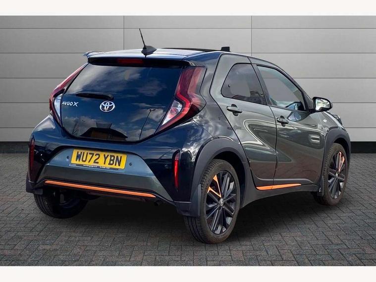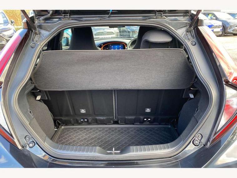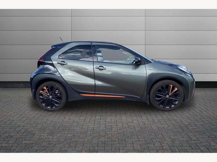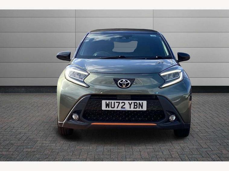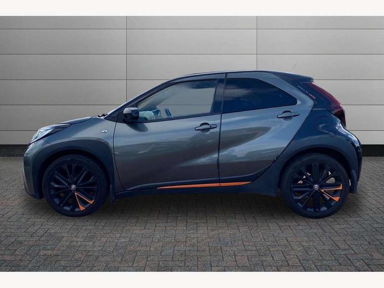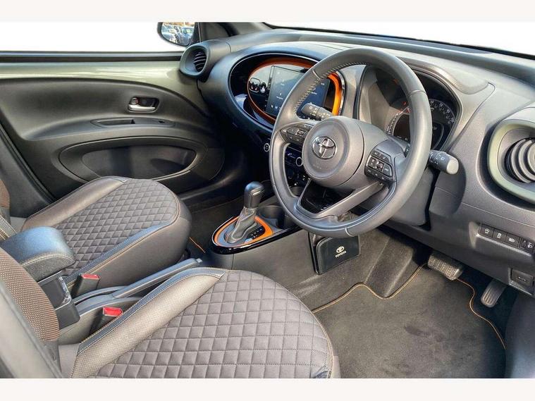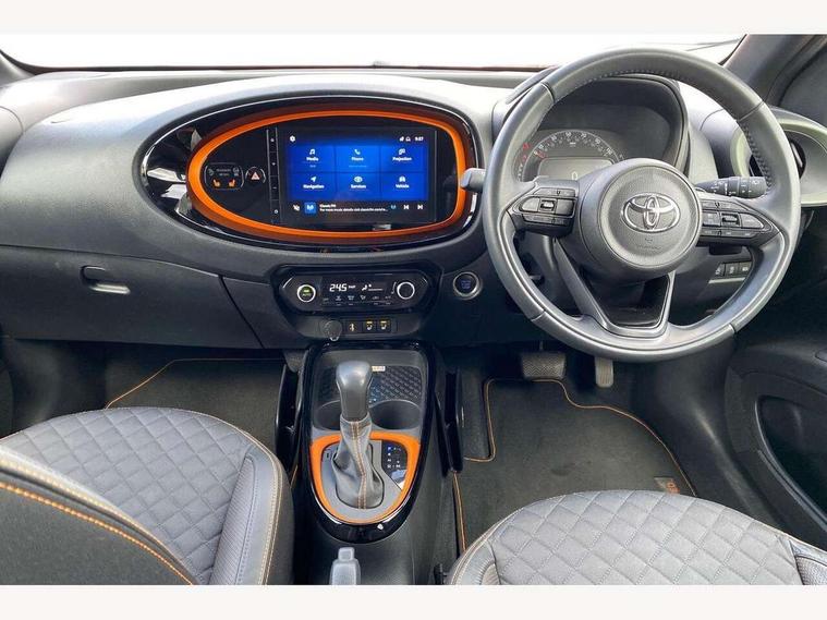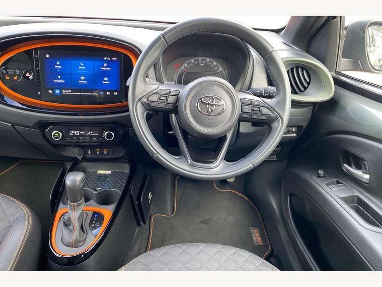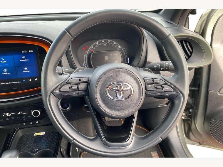 4.2" TFT colour screen, Adjustable speed limiter, Analogue speedometer, Bluetooth connectivity, Digital tachograph, Driver attention alert system, eCall emergency call system, ECO-driving indicator, Electric power steering, Front and rear parking sensors with auto brake, Intersection turn assist, Key reminder warning, Noise reduction kit, Pre collision system with emergency steering assist, Remote boot door release on key, Reversing camera with static guide lines, Smart entry and push button start, Speed limit display, Start and stop, Wireless charger, Wireless Smartphone Integration includes Apple CarPlay and Android auto, Vehicle Stability Control (VSC), 4 speakers, 9" HD multimedia display touch screen with Toyota smart connect, DAB digital audio broadcast, USB connector, Auto headlights, Auto wipers, Automatic headlights cut-off, Automatic high beam On/Off switch, Bicycle towing hook, Black fog light surrounds, Black side protection mouldings, Black wheel arch mouldings, Body colour door handles, Body coloured front bumper, Boot door scuff plate, Canvas roof, Eclipse black rear bumper, Electric heated door mirrors, Follow me home headlights, Front fog lights, Front power windows, Gloss black door mirrors, Gloss black upper front grille, Headlight cut-off reminder, LED daytime running lights guide, LED front light guide, LED High mounted stop lamp, LED projector headlights, Limited edition logo on C pillar, Magnolia strip on lower front and rear bumpers, Manual day/night rear view mirror, Manual headlight levelling, Metallic Bi-tone paint, Power adjustable door mirrors, Privacy glass, Rain sensor, Rear combination lights LED bulb type, Rear side wing doors, Rear windscreen defogger, Rear windscreen wiper, Remote hazard lights system, Short antenna, Variable intermittent windscreen wipers, 12v power outlet - front, 2 seat bench in 2nd row, 3 spoke leather steering wheel, 50/50 split folding rear seat, Adjustable speed limiter switch on steering wheel, Audio and telephone switches on steering wheel, Auto air conditioning, Black insert on steering wheel, Black roof lining, Boot light, Canvas top headlining, Centre room light, Chrome interior door handles, Chrome surround on air conditioning buttons, Clean air filter, Driver and front passenger heated seats, Floor mats, Front and rear cup holders, Front head rest deco art, Front head restraints, Gear shift indicator, Height adjustable driver seat, Intelligent adaptive cruise control switch on steering wheel, ISOFIX child restraint system on rear seats, Lane departure alert switch on steering wheel, Leather gearshift knob, Light blue ambient lighting in centre console, Manual tilt steering wheel, Manually reclining and sliding driver seat, Manually reclining and sliding front passenger seat, Multimedia switches on steering wheel, Paddle shift levers on steering wheel, Partial leather seats, Pollen filter, Rear door pockets, Rear head restraints, Remote air-conditioning system, Satin silver insert on gear shift knob, Single compartment glovebox with lights, Single front passenger seat, Soft tonneau cover, Sun visors with mirror on driver and passenger side, Voice recognition switch on steering wheel, Toyota safety sense pack - Aygo X, Anti lock braking system + Electronic brake force distribution, Child safety door lock, Emergency brake light signal (EBS), Hill start assist control (HAC), Passenger airbag on/off switch, Seat belt reminder for front and rear seats, Supplement restraints system (SRS) - 6 airbags, Traction control, Tyre pressure warning system, Immobiliser, Remote power door locks, Black wheel centre caps, Mandarina Orange wheel insert, Tyre repair kit,