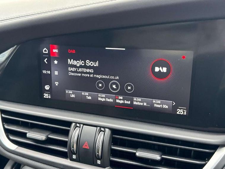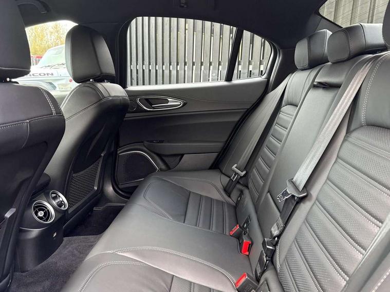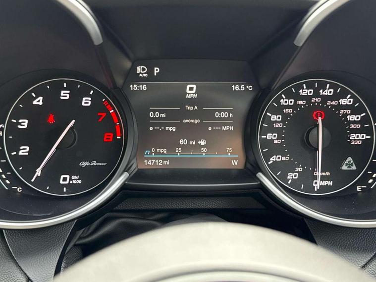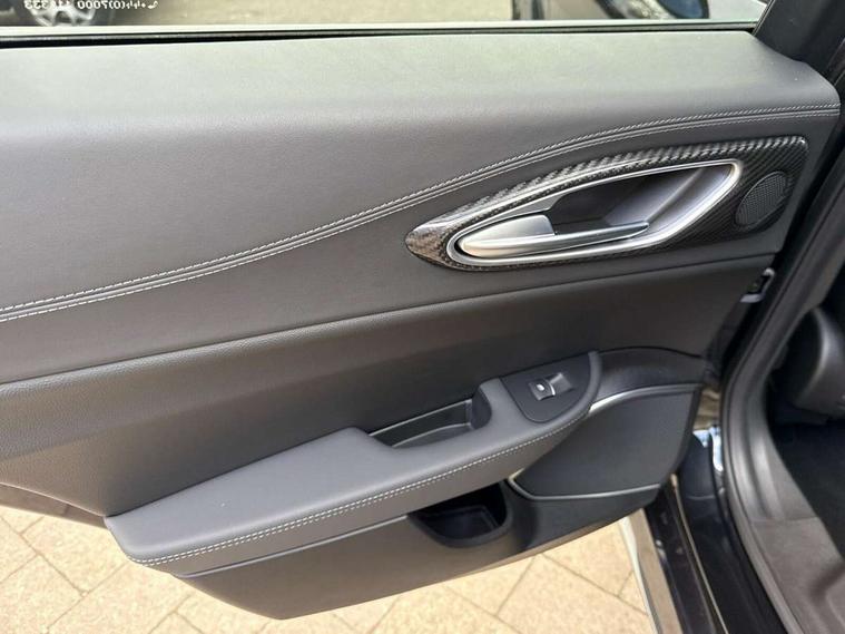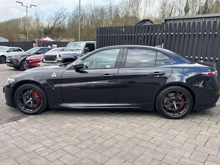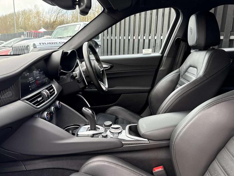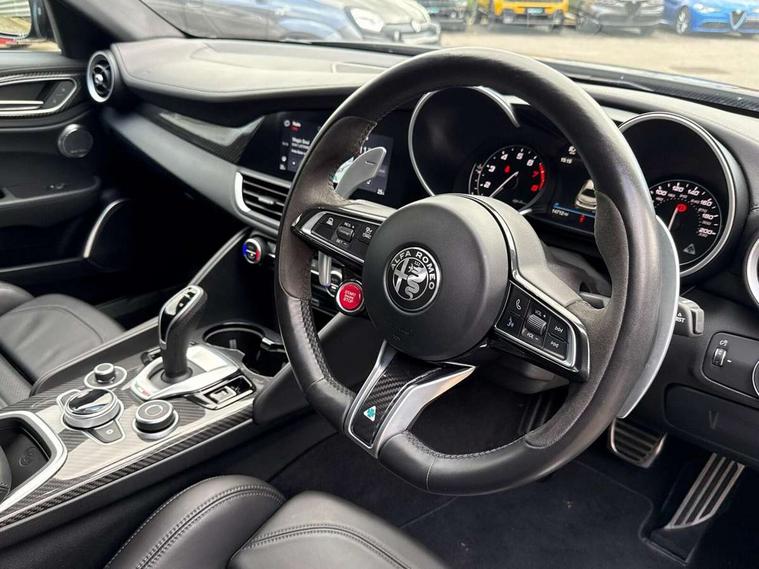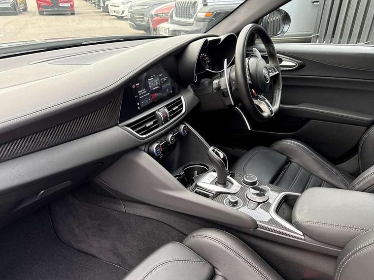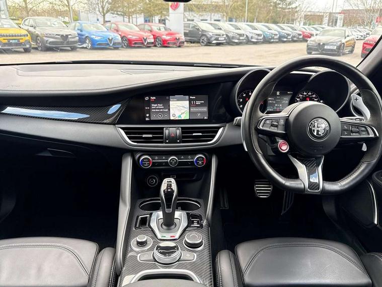 7 - inch colour TFT instrument cluster, Active cruise control, Alfa connect box, Alfa connected services, Alfa DNA Pro (with race mode), Alfa multi touch 3D Nav 8.8" Infotainment system (radio, 3D Nav, MP3, aux-in, bluetooth), Apple car play/Android Auto, Drive mode selector, Dusk sensor, Electrically operated tailgate, European maps, Forward collision warning, Front and rear parking sensors, Lane departure warning system, Noise reduction kit, PAS, Rear view camera with dynamic grid lines, Stop/start system, TMC Pro, Trip computer, Wireless charging pad, Alfa Chassis Domain Control, Alfa synaptic dynamic control suspension, Audio system with 8 speakers, Digital Audio Broadcast radio-DAB, Rear USB port, Satin finish speaker surround system, Steering wheel mounted audio controls, USB and Aux in armrest, USB in front centre console, Alfa Active aero, Auto dimming electrochrome door mirrors, Auto headlights, Auto high beam, Bi-Xenon 35W headlamps + AFS, Carbon fibre interior accents, Carbon fibre rear spoiler, Carbon side skirts, Covered underbody, Dark finish Giulia badge, Dark finish V grille, Dark tinted rear windows, Dual chrome tipped exhausts, Electrically adjustable and folding door mirrors, Electrochrome rear view mirror, Exterior door handle courtesy lights, Front fog lights, Gloss balck window surrounds, Headlamp washer, Heated washer jets, LED DRL, LED tail and brake lights, Privacy glass, Quadrifoglio badge, Quadrifoglio sports bumpers, Rain sensor, Rear boot, Rear diffuser, Rear side wing doors, Rear wing door, Sports exhaust with quad tailpipes, 12V power outlet, 2 individual rear seats, 3 rear headrests, 40:20:40 split folding rear bench seat, 6 way power driver seat with memory and 4 way lumbar adjustment, 6 way power passenger seat with memory and 4 way lumbar adjustment, Additional soundproofing, Aluminium shift paddles on steering column, Aluminium sports pedal and footrest, AQS Air quality system, Bag hooks, Black painted interior bezels, Boot light, Cargo net, Dark roof lining, Door sill scuff plates, Driver sunvisor with mirror, Dual zone automatic climate control with AQS, English handbook, Floor mats, Front courtesy map lamps, Front headrests, Front passenger seat, Functional LED lighting, Heated front seats, Heated steering wheel, Power bolster, Quadrifoglio Leather/Alcantara flat bottomed sports steering wheel with carbon fibre insert, Rear air vents, Red Start button on steering wheel, Sports leather gear knob, Trunk hooks, Ambient light pack - Guilia, ABS, Alfa active torque vectoring, Autonomous emergency braking, Child locks on rear doors, Electronic parking brake, ESP, Front airbag deactivation on passenger side, Integrated brake system, Seatbelt reminder, Specific 3rd central seatbelt, Traction control, Tyre pressure monitoring system (TPMS), Alarm system with bonnet and intrusion protection, Cyber security level 3, Immobiliser, Passive entry, Remote central locking, Carbon fibre dashboard inserts, Leather dashboard, door panels and central armrest, Fix and go puncture repair kit, Mixed fitment tyres, Monochrome central wheel caps, Tyres default,