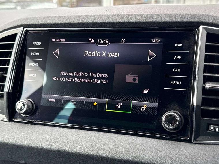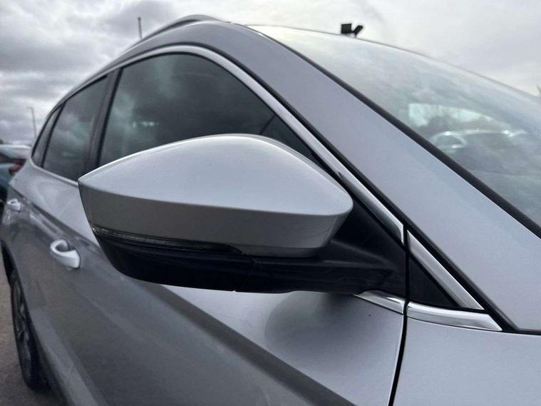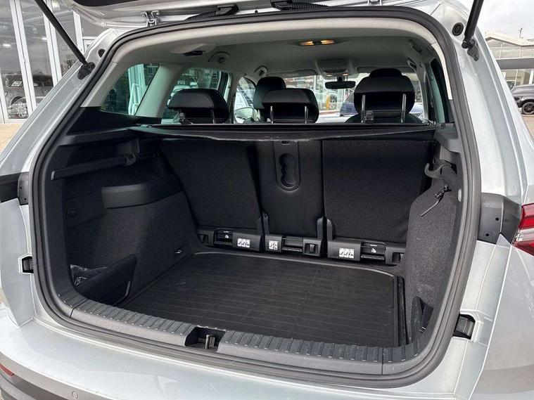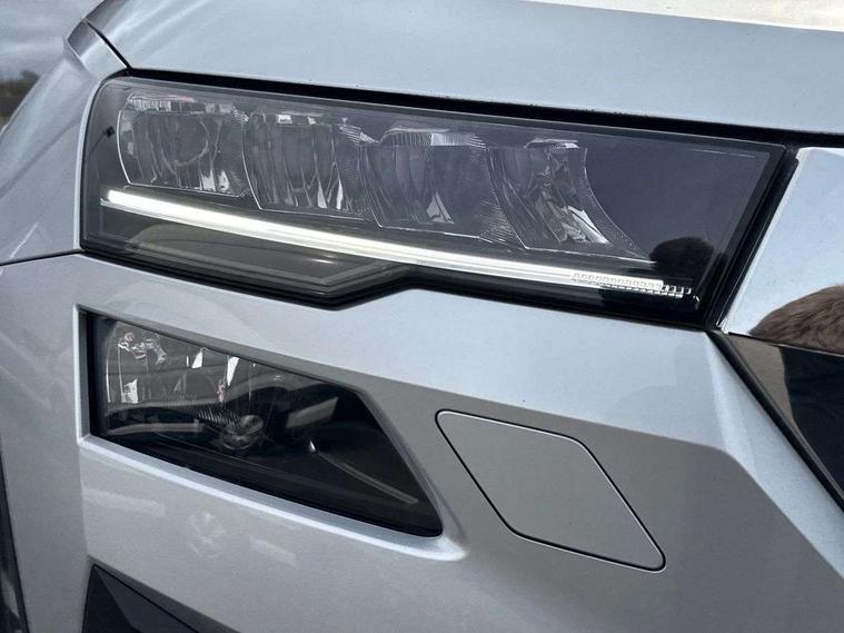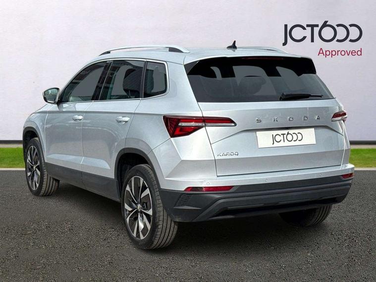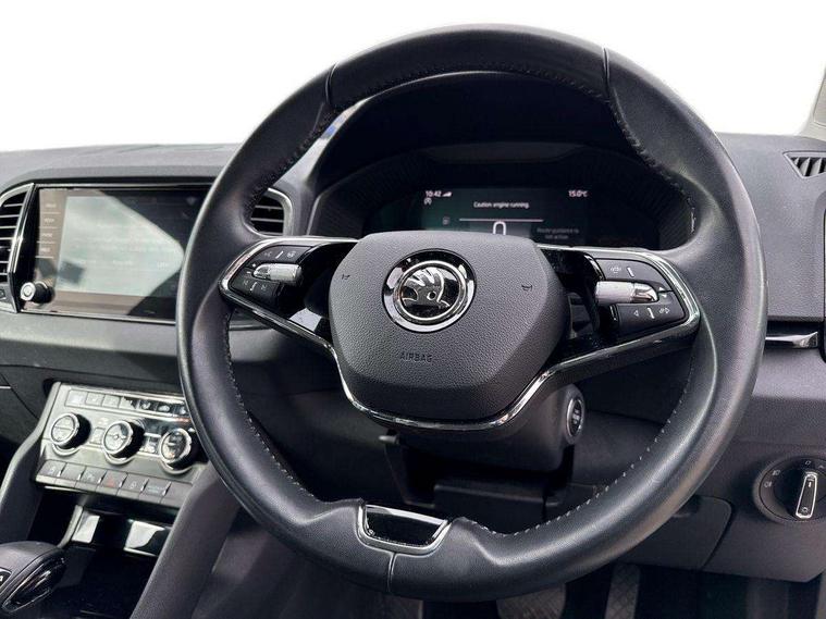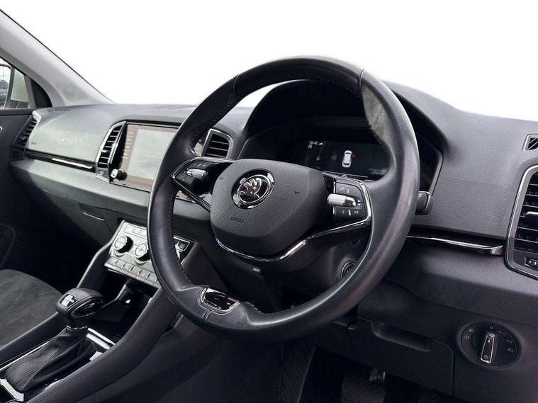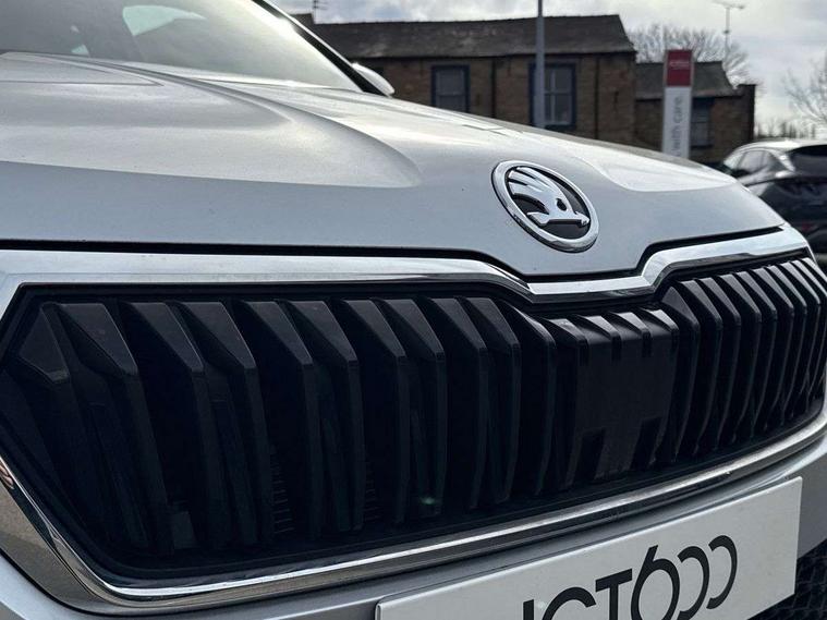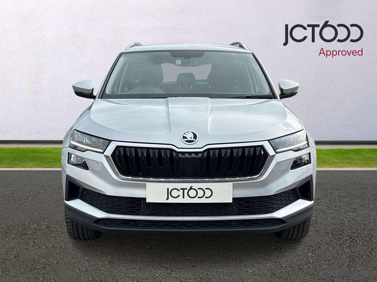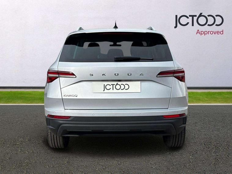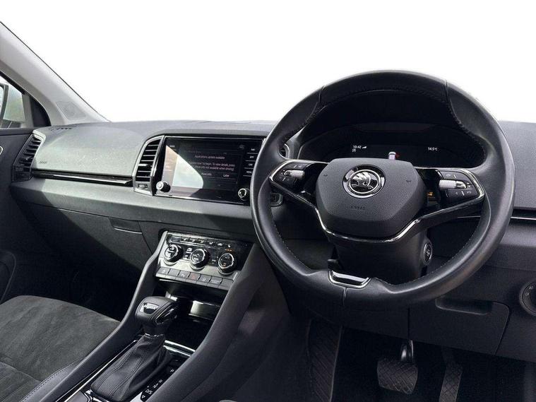 8" Digital display, Care connect, Driver fatigue sensor, Emergency services call system, Outside temperature gauge, Service interval indicator, SmartLink wireless for Apple and wired for Android, Start/stop system with regenerative braking, USB C Port x 2 in front centre console, 8 Speakers, DAB radio with Bluetooth, USB connection, Acoustic glass, Aero front windscreen wipers with intermittent function, Auto dimming rear view mirror with light and rain sensors, Black electric window control buttons, Body colour door mirrors and handles, Dynamic headlight range control with cornering light function, Electric front and rear windows with child proof lock, Heated rear windscreen, LED daytime running lights, LED rear lights with high functionality welcome effect and dynamic indicators, Light assistant (coming/leaving home/tunnel light), Plastic scuff plates, Privacy glass, Rear side wing doors, Rear spoiler, Rear window wiper with washer system and intermittent control, Safety reflectors on front doors, 1.5 litre bottle holders in driver and front passenger door panels, 12V socket in boot, 12v socket in front centre armrest with storage compartment and rear air vents, 2 Folding hooks and nets in boot, 2 spoke leather heated multifunction steering wheel with DSG paddles, 2 x Tablet holder, 3 rear height adjustable headrests, 3 seat bench in 2nd row, 4 foldable roof handles with rear coat hooks, Black floor carpet, Chrome inner door handles, Decorative door sills with KAROQ badging, Double sided boot floor, Foldable hooks in the boot, Front head restraints, Height adjustable front three point seats belts with tensioners, Height/reach adjust steering wheel, Ice scraper, Illuminated glovebox, Illuminated luggage compartment, Isofix child seat preparation for front passenger seat, Isofix child seat preparation outer rear, Manual lumbar support for front seats, Pen holder, Pollen filter, Rear boot cover, Rear reading lights, Rubbish bin door, Safety vest holder, Single front passenger seat, Storage box in upper central dashboard closed, Sunvisors with illuminated vanity mirrors, Textile floor mats, Ticket holder, VarioFlex seats with standard rear seat release, Chrome roof rails + chrome pack - Karoq, Parking pack - Karoq, Automatic door unlocking in case of crash, Automatic fuel cut off in case of crash, Child locks on rear doors, Driver airbag, Electronic parking brake with auto hold function, Emergency rear braking signal, ESC including ABS, MSR, ASR, EDS, HBA, DSR, RBS, MKB and traction control, Front side airbags, Hill hold control, Knee airbags, Passenger airbag with switch-off function, Pedestrian monitor, Seatbelt reminder signalisation and pretensioner for all seats, Three point seatbelts rear, Two tone horn, Tyre pressure display, Tyre pressure monitor, Alarm with interior monitoring, back up horn and tilt sensor with safe function, Electronic engine immobiliser, Keyless entry and start/stop, Remote central locking with 2 remote folding keys, Chrome framed air vents, 18" Procyon silver alloy wheels with anthracite aero inserts, Anti-theft wheel bolts protection, Storage on wheel cover, Tool kit,