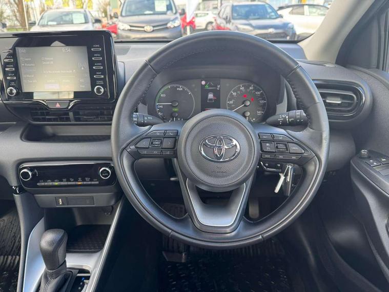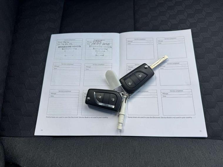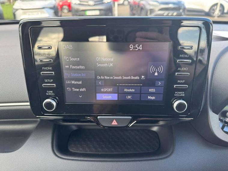 4.2" coloured TFT multi information display with analogue speedometer, Adaptive cruise control, Adjustable speed limit with speed warning, Bluetooth connectivity, E-call, Electric power steering, Hybrid energy display, Multi information display switches on steering wheel, Reversing camera, Smartphone integration with Apple CarPlay and Android auto, Smartphone integration with Apple CarPlay/Android Auto, Tailgate, Voice recognition, Vehicle Stability Control (VSC), 4 speakers, 9" Multimedia touch display, Toyota Touch 3 system with DAB radio, USB connection, Acoustic windscreen glass, Auto windscreen wipers, Automatic headlights, Body coloured door mirrors, Bulb indicators, Chequered front grille, Daytime running lights, Electric adjustable heated door mirrors, Follow me home headlights, Front auto power windows with anti jam protection, Front halogen fog lights, Halogen projector headlights, LED High mounted stop lamp, Manual headlight levelling, Rain sensor, Rear auto power windows with anti jam protection, Rear side wing doors, Rear spoiler, Rear wiper, Shark fin antenna, Turning signal integrated indicators in door mirrors, Variable front intermittent wipers, 3 adjustable rear headrests, 3 seat bench in 2nd row, 3 spoke leather steering wheel, 60/40 split folding rear seat, Active headrests, Adjustable boot height, Auto air conditioning, Coat hooks in rear grab handles, Cup holders (2 front & door), Data Communication Module (DCM) connected services, Fabric upholstery, Front armrest, Glovebox, Grey roof lining, Height adjustable driver's seat, Isofix seat fixing, Leather gearshift, Pollen filter, Shopping bag hooks, Single front passenger seat, Tilt/telescopic steering column, 3 point seatbelts on all rear seats, ABS+EBD+Brake assist, Electronic parking brake, Emergency brake light system (EBS), Front passenger airbag on/off switch, Front seatbelt reminder, Hill start assist control (HAC), Rear child proof door locks, Rear seat belt reminder, Supplemental Restraint System (SRS) 8 airbags: Driver & passenger's airbags, dual side curtain airbags, side impact airbags, front centre airbag, Toyota Safety Sense 3 with over the air updates, Tyre pressure warning system, 2x Master key, Alarm/immobiliser, Remote powered central double locking doors, Soft touch instrument panel, Space saver spare wheel,