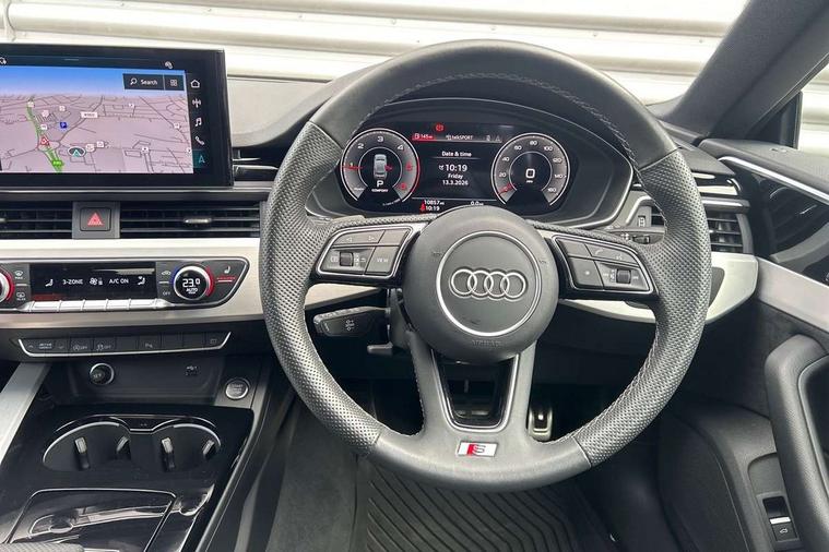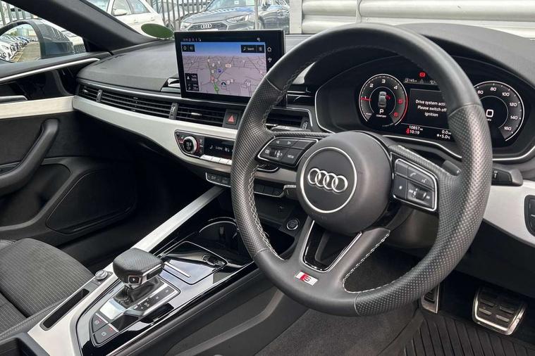 360 camera, Advanced key with Audi hands free boot opening system, Audi connect safety and service (e-call), Audi drive select (Auto, Comfort, Dynamic, Efficiency and Individual), Audi phone box light with wireless charging, Audi smartphone interface, Audi virtual cockpit - 12.3" full colour digital instrument cluster, vehicle/engine speed, Radio/media information+Driver assistance systems, Automatic start-stop system with coasting functionality and efficiency programme, Bluetooth interface, Camera based traffic sign recognition, Electro-mechanical power steering, Email, calendar and text messages displayed via MMI, Head up Display, Lane departure warning, MMI nav+ with MMI touch - 10.1" high resolution MMI display, touch sensitive, 3D map, route/country info, dynamic route guide, personal route assist, Park assist with parking aid plus, Service interval indicator, Voice control system, Diesel particulate filter, Sports suspension lowered by 23mm, Bang and Olufsen 3D sound system, CD player, DAB digital radio reception, Two additional USB ports for rear passenger in rear centre console, Two SDXC card slots, USB - C in rear, Audi matrix LED headlights with LED rear lights + dynamic front and rear indicators, Auto dimming rear view mirror, Body colour bumpers, Body colour door handles, Body colour front spoiler lip, Body colour side sill trim, Body coloured door mirrors, Door mirrors folding with auto-dimming and memory function, Electric adjustable heated door mirrors, Electric front windows, Front fog lights, Honeycomb structure radiator grille in grained matt black, Kerb-view function for passenger side, LED daytime running lights, LED side indicator lights integrated into door mirrors, LED third brake light, Matt aluminium silver tailpipe trim, Panoramic glass sunroof, Privacy glass, Rain and light sensors, Rear side wing doors, Rear wiper, S line badges on front wings, S line front and rear bumpers with side skirts, S Line rear diffuser in matt anthracite black with trim strip in matt aluminium silver, Side air inlets in grained matt black with matt aluminium silver inlay, Variable front intermittent wipers, Windscreen with acoustic glazing, 3 seat bench in 2nd row, 3 spoke high multifunction leather sport steering wheel with paddle shfit and S badging perforated leather grips, 4 way electric lumbar support for driver and front passenger, 40/20/40 split folding 3 seater rear bench seat, Adjustable steering column, Black cloth headlining, Black perforated leather gearknob, Contrast stitching on seats, steering wheel and gear lever gaiter, Deluxe 3 zone electronic climate control, Electrically adjustable front seats with memory function for driver's side, Front centre armrest, Front head restraints, Front/rear floor mats, Heated front seats, Illuminated door sill trim with S logo, ISOFIX child seat mounting and top tether, Luggage compartment mat, Rear centre armrest, Rear headrests, Single front passenger seat, Stainless steel pedals and footrest, Sunvisors with vanity mirrors, Extended LED interior light pack - A5/S5, 3x3 point rear seatbelts, 6 airbags - Driver, front passenger, curtain and side airbags, Attention and drowsiness assist, Electromechanical parking brake, Electronic Stabilisation Control (ESC) including ABS, ASR and EDL, Front passenger airbag deactivation, Height adjustable front seatbelts, Hill hold assist, Manual child lock in rear doors, Multi collision brake assist, Pop-up bonnet for pedestrian protection, Pre sense city, Seatbelt monitoring, Tyre pressure warning, Variable restraint system, Warning triangle and first aid kit, Anti theft alarm system, Anti theft wheel bolts, Immobiliser, Keyless Go, Remote central locking, Matt brushed aluminium inlays, Tool kit, Tyre repair kit,