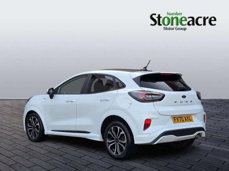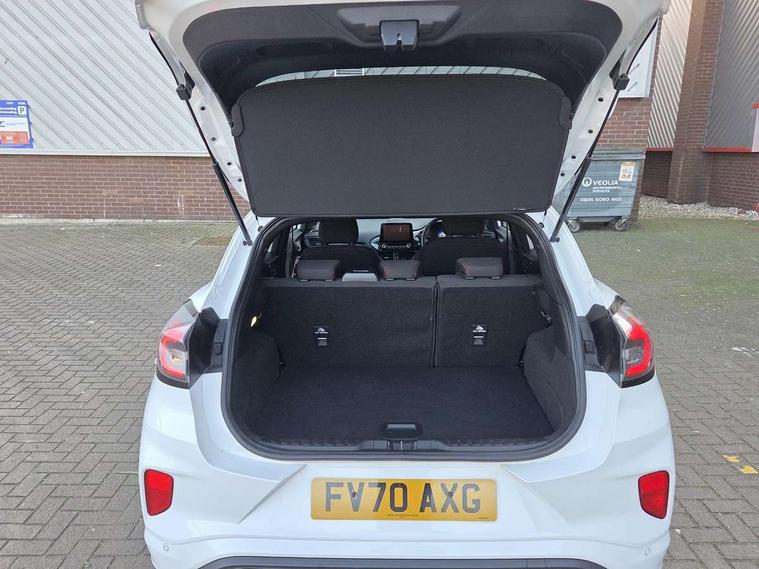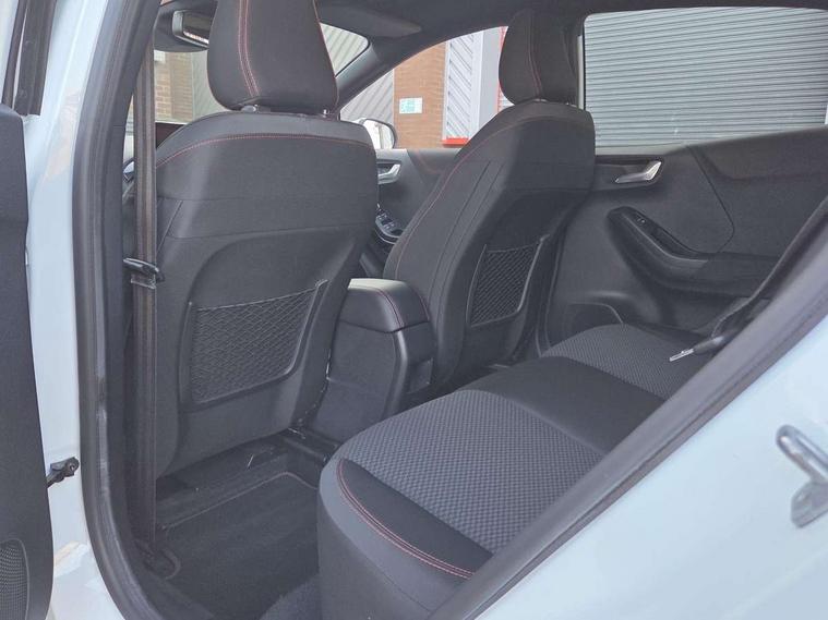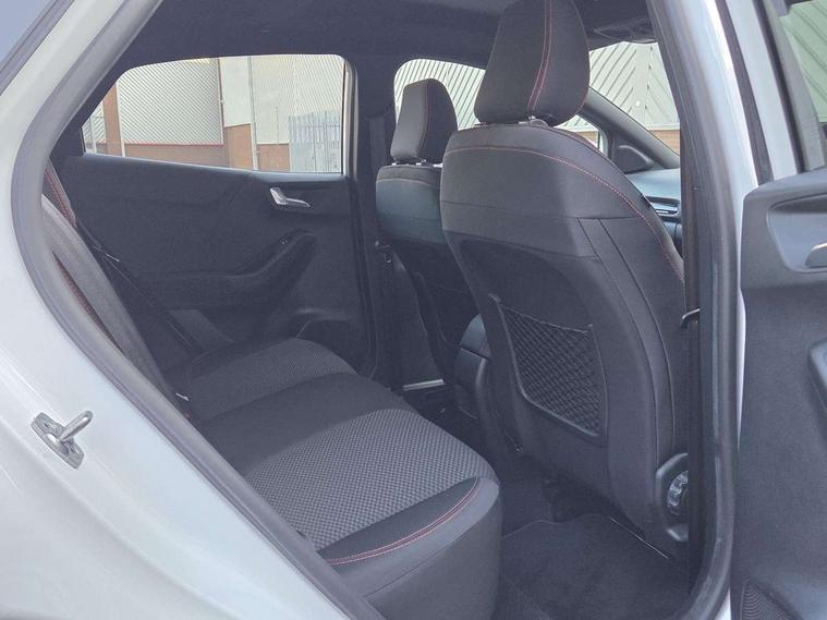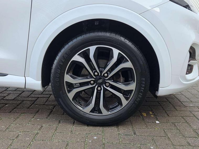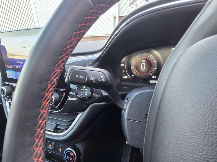 Ford easy fuel, Full digital 12.3" instrument cluster, Lane keeping aid with lane departure warning, Power assist steering, Rear parking sensor, Selectable drive modes(Normal, Eco, Sport, Slippery and Trail), Wireless charging pad, Automatic headlights with rain sensing wipers and auto high beam, Body coloured door mirrors, Front fog lights with cornering lights and LED rear lamps, Power foldable heated door mirrors with puddle lamps, Quickclear heated windscreen, ST-Line body kit with large rear spoiler wth sports suspension, Alloy sports pedals, Centre console with armrest and stowage, Court cloth upholstery with belgrano bolsters, Driver seat height/lumbar adjust, Ford megabox extended bootspace, Front and rear floor mats, Front and rear head restraints, Manual air conditioning, ST-Line flat bottomed sensico leather steering wheel with leather handbrake and aluminium gear knob, 3 rear seatbelts, Electronic stability control (ESC) and hill start assist, Pre-collision assist with autonomous emergency braking, pedestrian/cyclist detection & post-collision braking, Tyre pressure monitoring system (TPMS), Thatcham alarm, Tyre inflation kit,