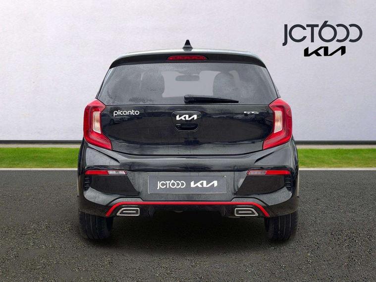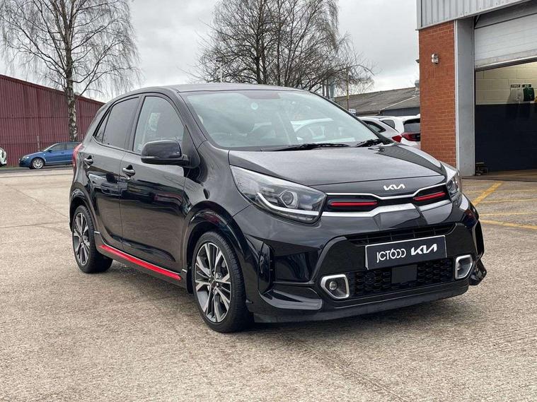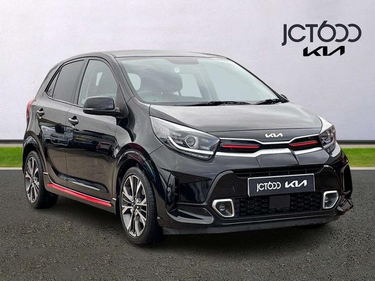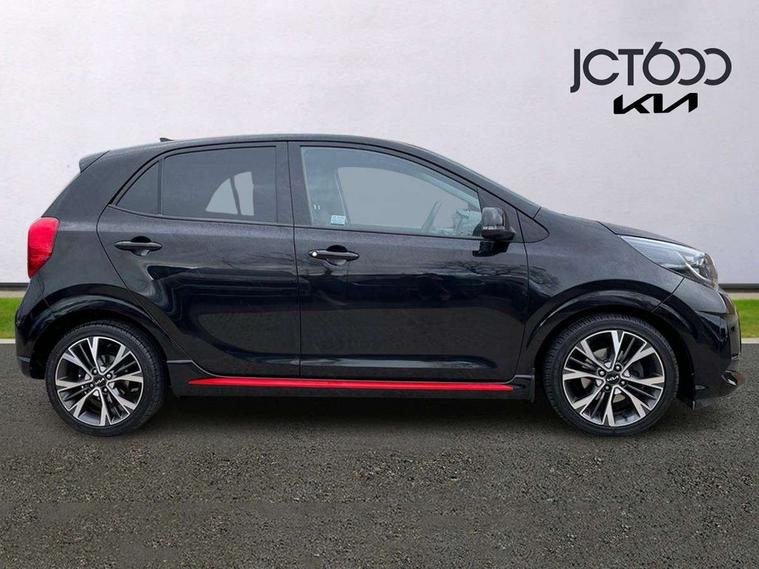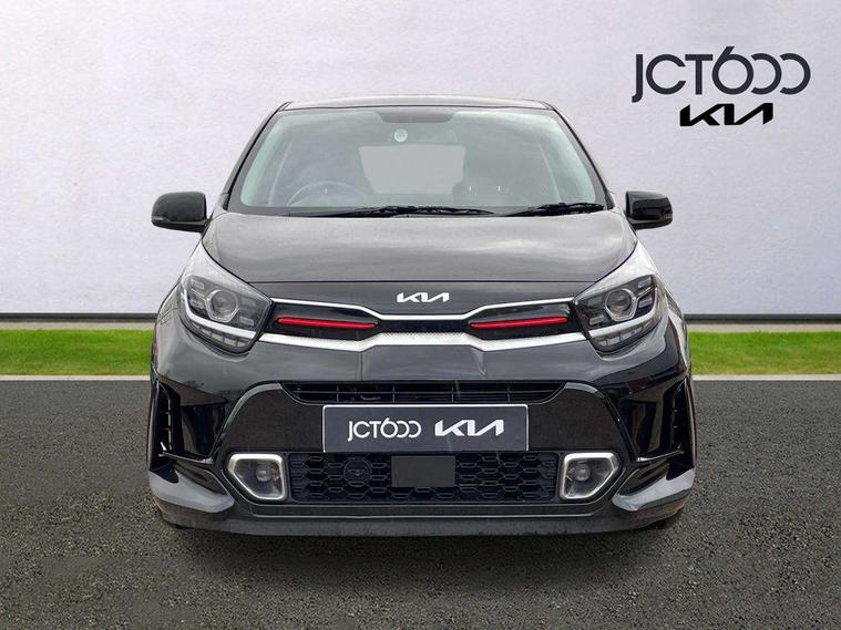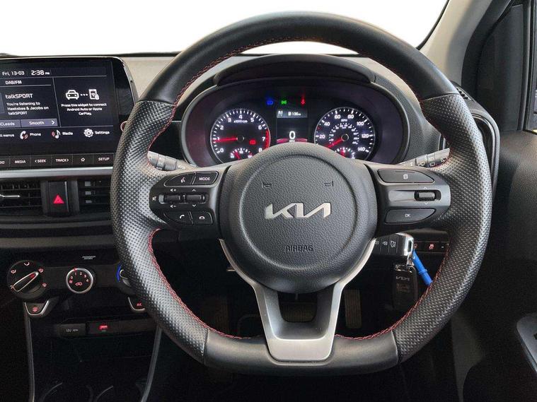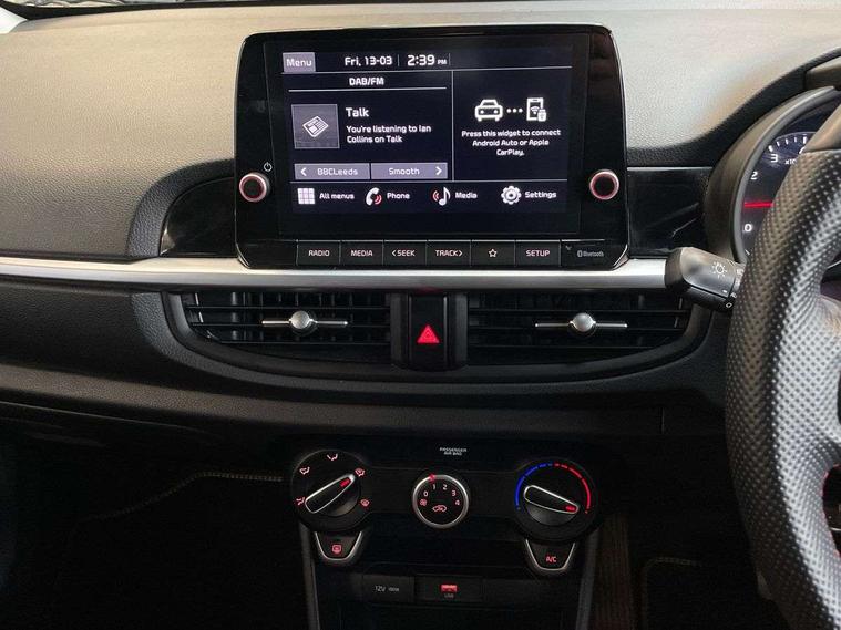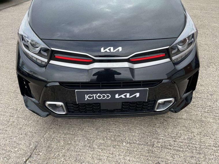 8" touchscreen display with RDS and DAB, Apple car play/Android Auto with voice control, Emergency call service, Emergency stop signalling system, External temperature gauge, Motor driven power steering, Reversing camera system with dynamic guidelines (Integrated into centre fascia screen), Tachometer, Trip computer, 6 speaker audio system, Bluetooth with music streaming, Steering wheel mounted controls, USB ports for connection of a media device, Automatic headlight control system, Bi-function projection headlights, Black beltline mouldings, Black grille with silver surround, Body colour B pillars, Body colour bumpers, Body colour mirrors and door handles, Body colour side sill mouldings, Day/night rear view mirror, Electric adjustable/heated/folding door mirrors with LED indicators lights, Front and rear electric windows with drivers's auto up/down function, Front fog lights, Headlamp levelling, Heated rear window, High mount brake light, LED daytime running lights, LED rear fog lights, LED rear lights, Privacy glass - Rear windows and tailgate, Rain sensor, Rear side wing doors, Rear wash/wipe, Speed variable front wipers, Sports front and rear bumpers with gloss black skid plates twin exhaust, Tinted glass, Visible VIN plate, Welcome and follow-me home light functionality, 1 x rear coat hook, 12V power point front, 2 seat bench in 2nd row, 3 x passenger assist grips, 60/40 split/folding 2nd row of seats, All round height adjustable headrests, Black and red accents front door armrest, Centre Console with Storage Box and Sliding Armrest, Cupholders in centre console, D-cut steering wheel with red stitching, Driver and front passenger sunvisor with vanity mirror, Driver seat height adjust, Faux leather upholstery, Front cabin lights, Glovebox, High gloss lower centre fascia trim, door armrest and air vents, ISOFIX Child seat top tethers and anchor fixings, Leather trimmed steering wheel and gearshift, Luggage area light, Luggage area parcel shelf, Manual air conditioning, Passenger front seatback pockets, Satin chrome interior door handles, Single front passenger seat, Slide/reclining front seats, Tilt adjustable steering wheel, Advanced Driver Assistance Pack - Picanto, 2 x 3-point rear seatbelts, ABS/EBD, Automatic unlocking of doors in case of impact, Dual front airbags, ESC + BAS + VSM + HAC, Front passenger airbag cut-off switch, Front seatbelt height adjusters, Front seatbelt pretensioners + load limiters, Hill hold control, Knee airbags, Rear child proof door locks, Seatbelt warning, Side impact protection, Torque vectoring brake based and straight line stability (SLS), Traction control, Twin curtain airbags, Twin front side airbags, Tyre pressure monitoring system, Anti theft alarm, Engine immobiliser, Folding key, Locking wheel nuts, Remote central door locking, 16" alloy GT-Line wheels, Tyre mobility kit,
