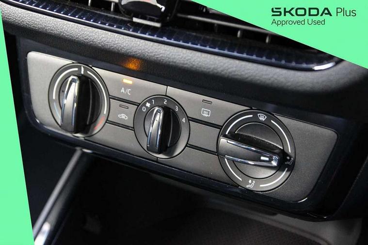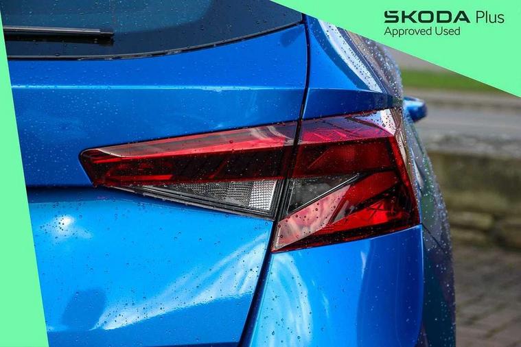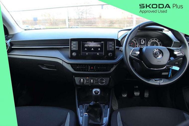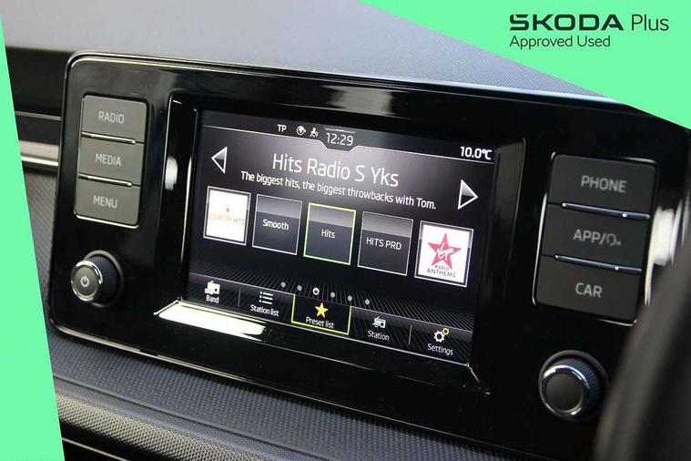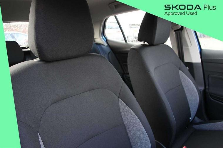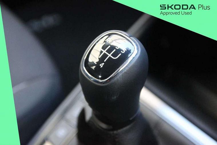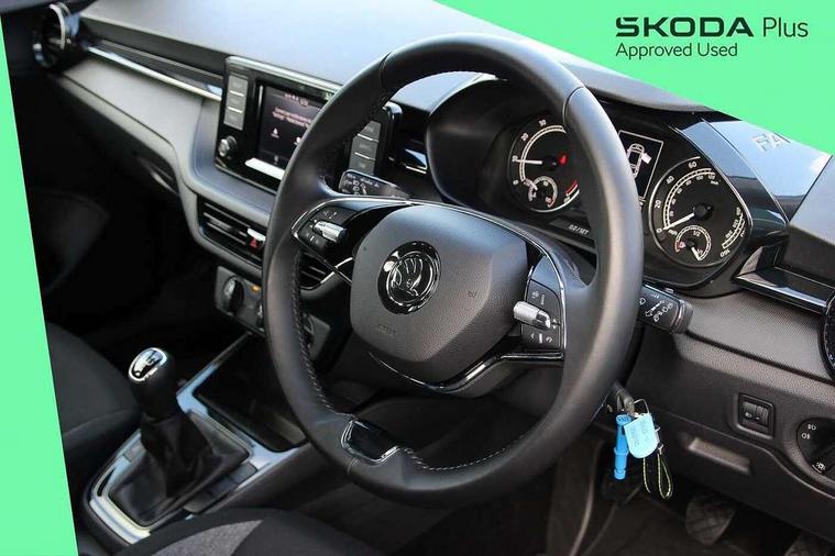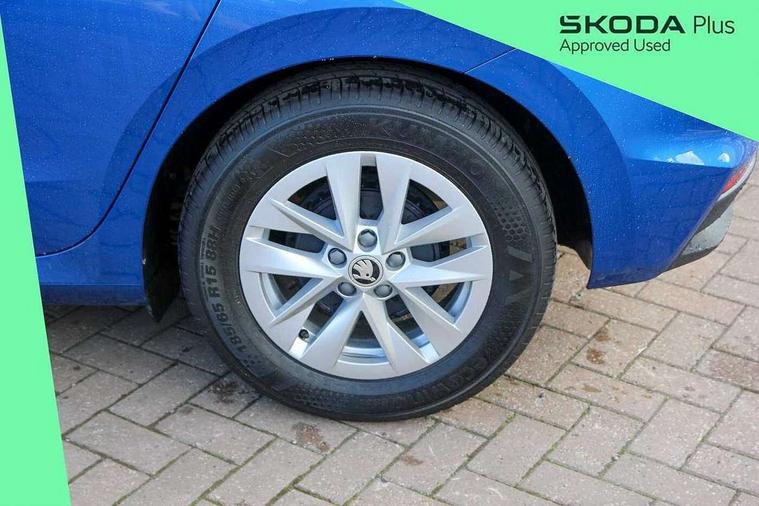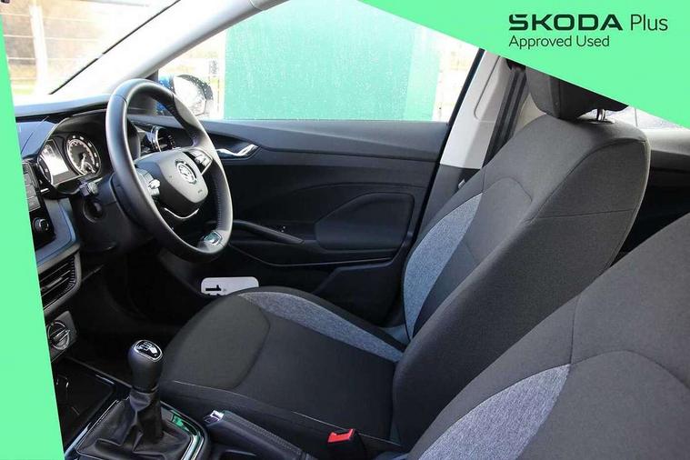Bluetooth connection, Driver alert system - DAS, Electromechanical power steering, Exterior temperature gauge, Lane assist including road edge detection, Multifunction trip computer in black and white, Service interval indicator, Speed limiter, 2x USB-C in the front (for data transmission and charging), 4 speakers in front, Auxiliary socket for external MP3 player, DAB digital radio reception, Radio Swing with 6.5" colour display, Basic LED Headlights, Basic rear lights, Body colour door mirrors, Body coloured bumpers, Dimming rear view mirror with black frame, Door mirror integrated indicators, Electrically adjustable and heated door mirrors, Electrically adjustable front windows with function auto up/down, Front fog lights, Front window wiper intermittent control, Headlight range control - Automatic, Ice scraper in fuel cap, LED daytime running lights with coming and leaving home feature, Mechanical adjustable rear windows, Rain sensor, Rear LED fog light, Rear side wing doors, Rear window wiper with washing nozzles, Roof mounted spoiler, SKODA tailgate lettering in chrome, Third brake light, 2 reading lights in front and 2 reading lights in rear, 2 spoke leather multifunction steering wheel, 3 rear headrests, Backrest split and folding, Central console with fixed cup holder and storage box, Chrome handbrake release button, Fabric upholstery, Gearshift knob/handle in leather, Grain satin black interior door handles, Hand brake lever handle in leather, Height adjustable front headrests, Height adjustable front seats, Height adjustable steering wheel, ISOFIX and TopTether anchorage points to the outer rear seats, ISOFIX and TopTether on the front passenger seat, Luggage compartment lighting, Manual air conditioning, Manually adjustable lumbar support in front seats, Pollen filter, Rear seat bench unsplit, Single front passenger seat, Storm grey headlining, Sun visors with mirror and airbag label on passenger side, Ticket holder, 3-point height adjustable front seats belts with pretensioner and force limiter, Automatic warning lights in case of crash, Driver and passengers airbag with switch off function, e-Call+, ESC including ABS, MSR, ASR, EDS, HBA and XDS, Front and rear seat belt warning, FRONT ASSIST (AEB City and AEB Inter Urban), Front side airbags, Head airbags, One tone horn, Pedestrian protection, Three rear 3-points safety seat belts with pretensioner and force limiter including stop function for outer rear seat belts, Tyre pressure monitoring system, Anti-theft alarm system including immobiliser, interior monitoring, backup horn, and towing protection, Central locking with radio remote control, interior controls, SAFE function and 2 foldable keys, Black painted air vents, Glossy black decorative trim, Grain satin black central console cover, Grain satin black lower decorative trim, Satin black door and side trim panel in front, Anti-theft wheel bolts protection, Super-low rolling resistance tyres,