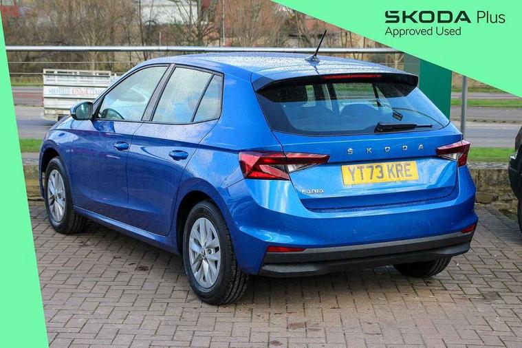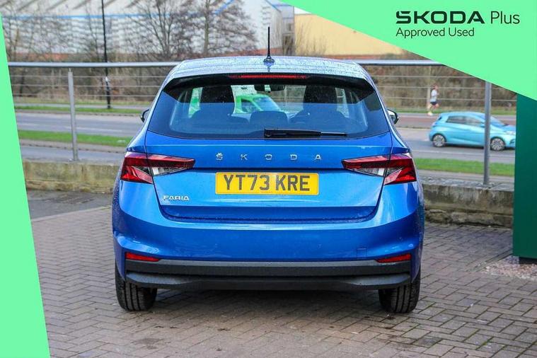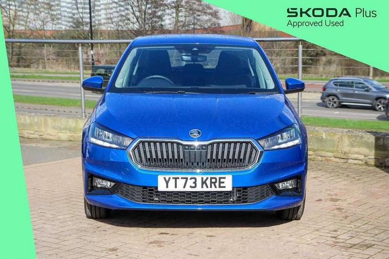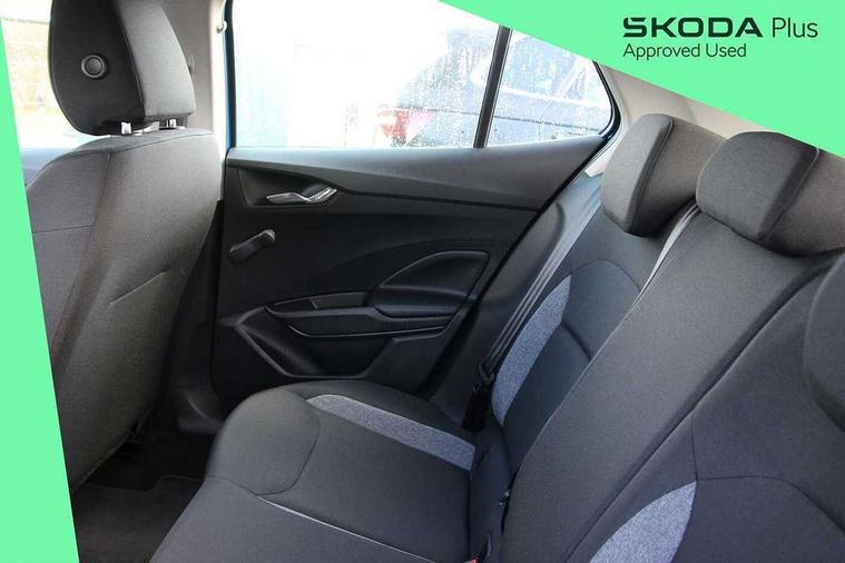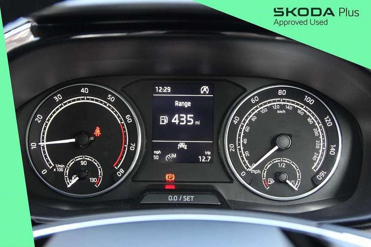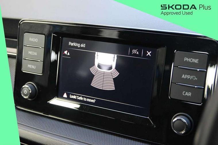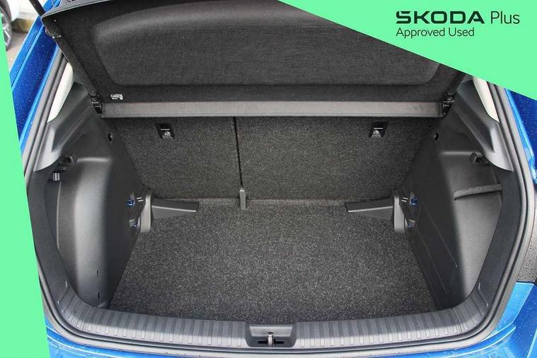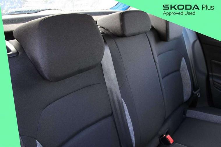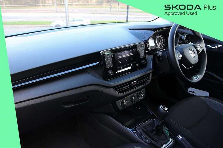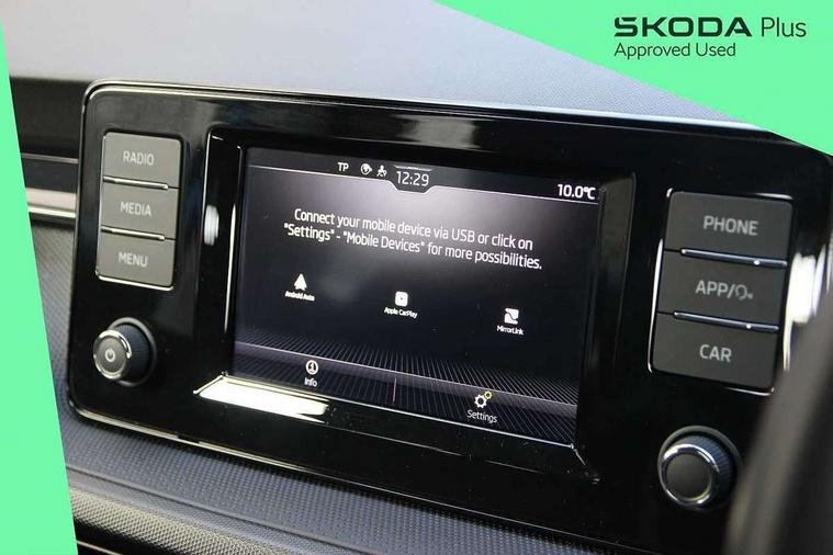 Bluetooth connection, Driver alert system - DAS, Electromechanical power steering, Exterior temperature gauge, Lane assist including road edge detection, Multifunction trip computer in black and white, Service interval indicator, Speed limiter, 2x USB-C in the front (for data transmission and charging), 4 speakers in front, Auxiliary socket for external MP3 player, DAB digital radio reception, Radio Swing with 6.5" colour display, Basic LED Headlights, Basic rear lights, Body colour door mirrors, Body coloured bumpers, Dimming rear view mirror with black frame, Door mirror integrated indicators, Electrically adjustable and heated door mirrors, Electrically adjustable front windows with function auto up/down, Front fog lights, Front window wiper intermittent control, Headlight range control - Automatic, Ice scraper in fuel cap, LED daytime running lights with coming and leaving home feature, Mechanical adjustable rear windows, Rain sensor, Rear LED fog light, Rear side wing doors, Rear window wiper with washing nozzles, Roof mounted spoiler, SKODA tailgate lettering in chrome, Third brake light, 2 reading lights in front and 2 reading lights in rear, 2 spoke leather multifunction steering wheel, 3 rear headrests, Backrest split and folding, Central console with fixed cup holder and storage box, Chrome handbrake release button, Fabric upholstery, Gearshift knob/handle in leather, Grain satin black interior door handles, Hand brake lever handle in leather, Height adjustable front headrests, Height adjustable front seats, Height adjustable steering wheel, ISOFIX and TopTether anchorage points to the outer rear seats, ISOFIX and TopTether on the front passenger seat, Luggage compartment lighting, Manual air conditioning, Manually adjustable lumbar support in front seats, Pollen filter, Rear seat bench unsplit, Single front passenger seat, Storm grey headlining, Sun visors with mirror and airbag label on passenger side, Ticket holder, 3-point height adjustable front seats belts with pretensioner and force limiter, Automatic warning lights in case of crash, Driver and passengers airbag with switch off function, e-Call+, ESC including ABS, MSR, ASR, EDS, HBA and XDS, Front and rear seat belt warning, FRONT ASSIST (AEB City and AEB Inter Urban), Front side airbags, Head airbags, One tone horn, Pedestrian protection, Three rear 3-points safety seat belts with pretensioner and force limiter including stop function for outer rear seat belts, Tyre pressure monitoring system, Anti-theft alarm system including immobiliser, interior monitoring, backup horn, and towing protection, Central locking with radio remote control, interior controls, SAFE function and 2 foldable keys, Black painted air vents, Glossy black decorative trim, Grain satin black central console cover, Grain satin black lower decorative trim, Satin black door and side trim panel in front, Anti-theft wheel bolts protection, Super-low rolling resistance tyres,
