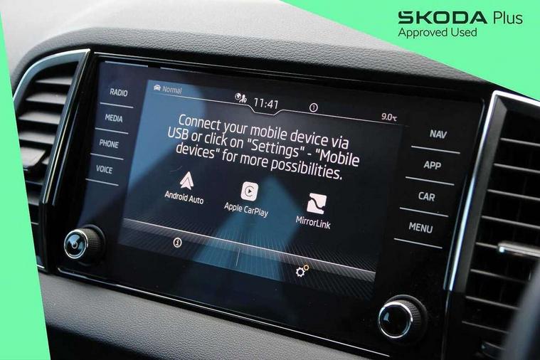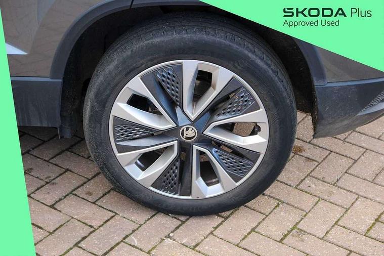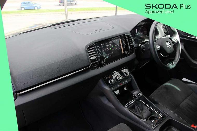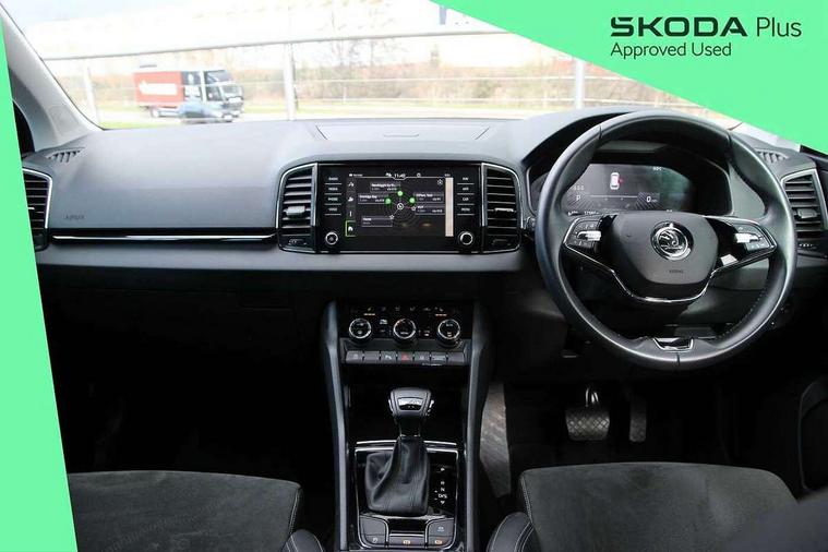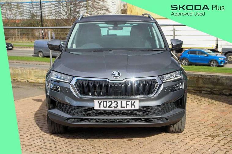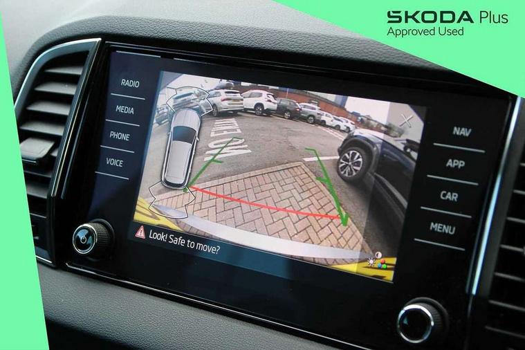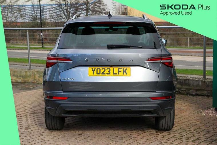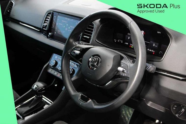 8" Digital display, Care connect, Driver fatigue sensor, Emergency services call system, Outside temperature gauge, Service interval indicator, SmartLink wireless for Apple and wired for Android, Start/stop system with regenerative braking, USB C Port x 2 in front centre console, 8 speakers, DAB radio with Bluetooth, USB connection, Acoustic glass, Aero front windscreen wipers with intermittent function, Auto dimming rear view mirror with light and rain sensors, Black electric window control buttons, Body colour door mirrors and handles, Dynamic headlight range control with cornering light function, Electric front and rear windows with child proof lock, Heated rear windscreen, LED daytime running lights, LED rear lights with high functionality welcome effect and dynamic indicators, Light assistant (coming/leaving home/tunnel light), Plastic scuff plates, Privacy glass, Rear side wing doors, Rear spoiler, Rear window wiper with washer system and intermittent control, Safety reflectors on front doors, 1.5 litre bottle holders in driver and front passenger door panels, 12V socket in boot, 12v socket in front centre armrest with storage compartment and rear air vents, 2 spoke leather heated multifunction steering wheel with DSG paddles, 2 x Tablet holder, 3 rear height adjustable headrests, 3 seat bench in 2nd row, 4 foldable roof handles with rear coat hooks, Black floor carpet, Chrome inner door handles, Decorative door sills with KAROQ badging, Double sided boot floor, Foldable hooks in the boot, Front head restraints, Height adjustable front three point seats belts with tensioners, Height/reach adjust steering wheel, Ice scraper, Illuminated glovebox, Illuminated luggage compartment, Isofix child seat preparation for front passenger seat, Isofix child seat preparation outer rear, Manual lumbar support for front seats, Pen holder, Pollen filter, Rear boot cover, Rear reading lights, Rubbish bin door, Safety vest holder, Single front passenger seat, Storage box in upper central dashboard closed, Sunvisors with illuminated vanity mirrors, Textile floor mats, Ticket holder, VarioFlex seats with standard rear seat release, Boot pack - Karoq, Chrome roof rails + chrome pack - Karoq, Parking pack - Karoq, Automatic door unlocking in case of crash, Automatic fuel cut off in case of crash, Child locks on rear doors, Driver airbag, Electronic parking brake with auto hold function, Emergency rear braking signal, ESC including ABS, MSR, ASR, EDS, HBA, DSR, RBS, MKB and traction control, Front side airbags, Hill hold control, Knee airbags, Passenger airbag with switch-off function, Pedestrian monitor, Seatbelt reminder signalisation and pretensioner for all seats, Three point seatbelts rear, Two tone horn, Tyre pressure display, Tyre pressure monitor, Alarm with interior monitoring, back up horn and tilt sensor with safe function, Electronic engine immobiliser, Keyless entry and start/stop, Remote central locking with 2 remote folding keys, Chrome framed air vents, 18" Procyon silver alloy wheels with anthracite aero inserts, Anti-theft wheel bolts protection, Storage on wheel cover, Tool kit,