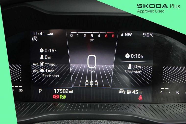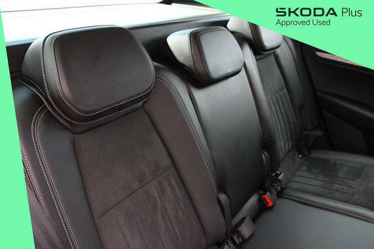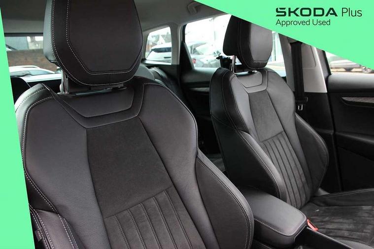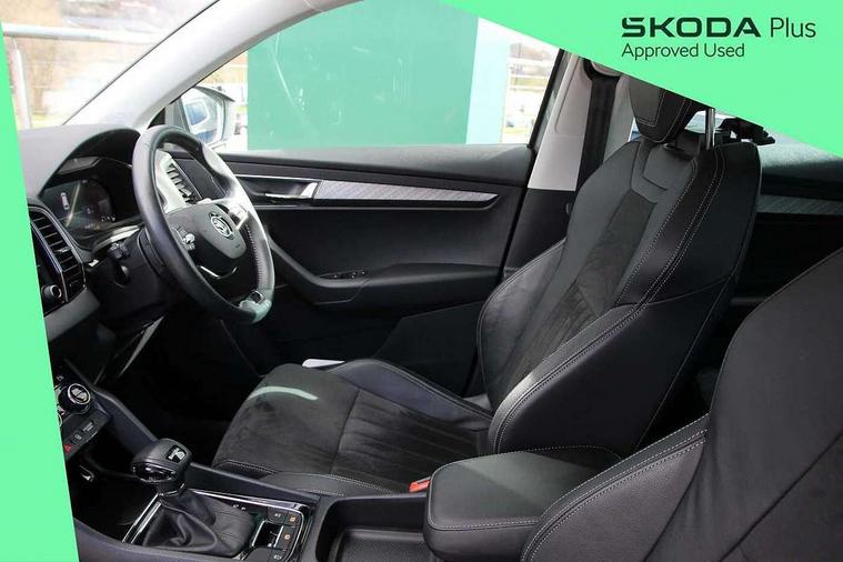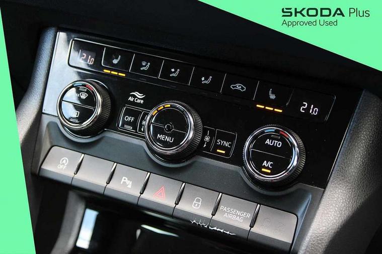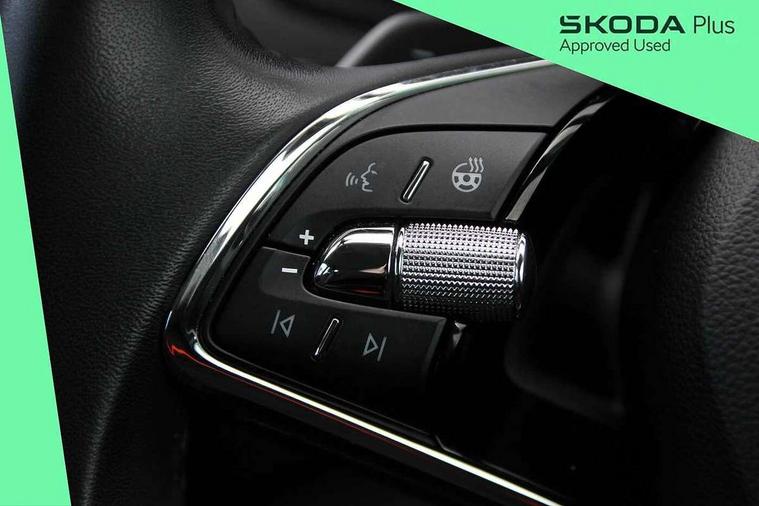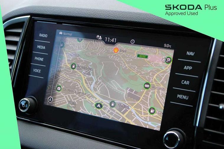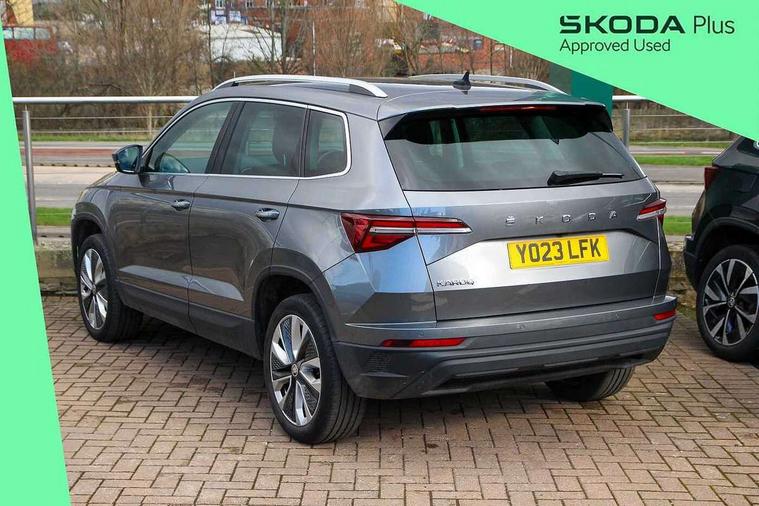 8" Digital display, Care connect, Driver fatigue sensor, Emergency services call system, Outside temperature gauge, Service interval indicator, SmartLink wireless for Apple and wired for Android, Start/stop system with regenerative braking, USB C Port x 2 in front centre console, 8 speakers, DAB radio with Bluetooth, USB connection, Acoustic glass, Aero front windscreen wipers with intermittent function, Auto dimming rear view mirror with light and rain sensors, Black electric window control buttons, Body colour door mirrors and handles, Dynamic headlight range control with cornering light function, Electric front and rear windows with child proof lock, Heated rear windscreen, LED daytime running lights, LED rear lights with high functionality welcome effect and dynamic indicators, Light assistant (coming/leaving home/tunnel light), Plastic scuff plates, Privacy glass, Rear side wing doors, Rear spoiler, Rear window wiper with washer system and intermittent control, Safety reflectors on front doors, 1.5 litre bottle holders in driver and front passenger door panels, 12V socket in boot, 12v socket in front centre armrest with storage compartment and rear air vents, 2 spoke leather heated multifunction steering wheel with DSG paddles, 2 x Tablet holder, 3 rear height adjustable headrests, 3 seat bench in 2nd row, 4 foldable roof handles with rear coat hooks, Black floor carpet, Chrome inner door handles, Decorative door sills with KAROQ badging, Double sided boot floor, Foldable hooks in the boot, Front head restraints, Height adjustable front three point seats belts with tensioners, Height/reach adjust steering wheel, Ice scraper, Illuminated glovebox, Illuminated luggage compartment, Isofix child seat preparation for front passenger seat, Isofix child seat preparation outer rear, Manual lumbar support for front seats, Pen holder, Pollen filter, Rear boot cover, Rear reading lights, Rubbish bin door, Safety vest holder, Single front passenger seat, Storage box in upper central dashboard closed, Sunvisors with illuminated vanity mirrors, Textile floor mats, Ticket holder, VarioFlex seats with standard rear seat release, Boot pack - Karoq, Chrome roof rails + chrome pack - Karoq, Parking pack - Karoq, Automatic door unlocking in case of crash, Automatic fuel cut off in case of crash, Child locks on rear doors, Driver airbag, Electronic parking brake with auto hold function, Emergency rear braking signal, ESC including ABS, MSR, ASR, EDS, HBA, DSR, RBS, MKB and traction control, Front side airbags, Hill hold control, Knee airbags, Passenger airbag with switch-off function, Pedestrian monitor, Seatbelt reminder signalisation and pretensioner for all seats, Three point seatbelts rear, Two tone horn, Tyre pressure display, Tyre pressure monitor, Alarm with interior monitoring, back up horn and tilt sensor with safe function, Electronic engine immobiliser, Keyless entry and start/stop, Remote central locking with 2 remote folding keys, Chrome framed air vents, 18" Procyon silver alloy wheels with anthracite aero inserts, Anti-theft wheel bolts protection, Storage on wheel cover, Tool kit,