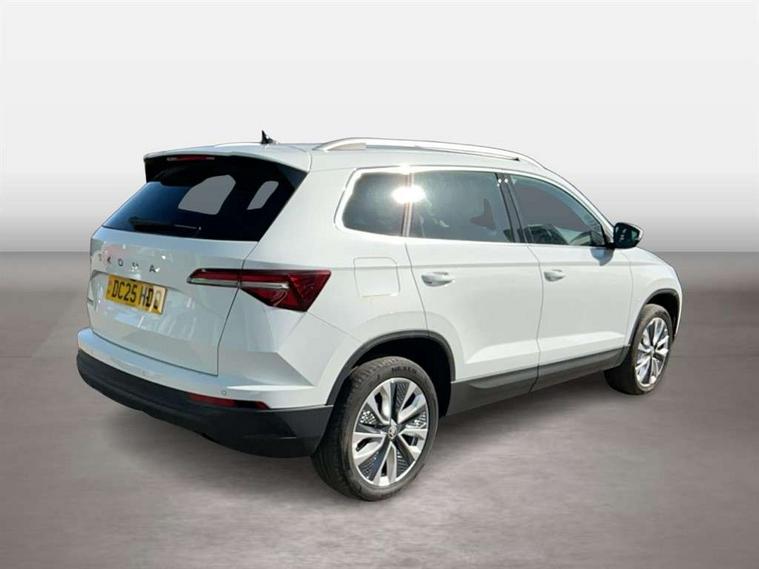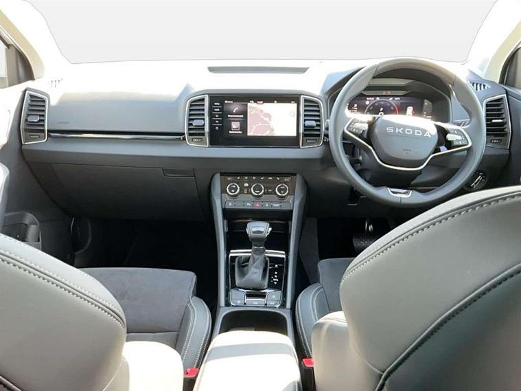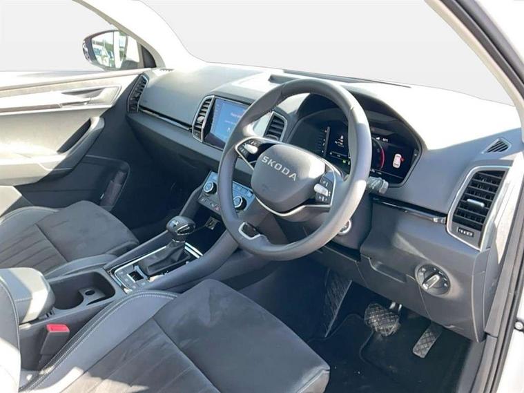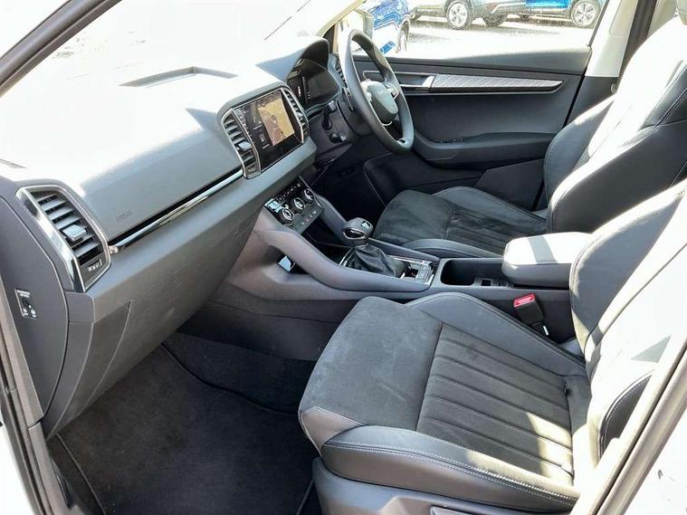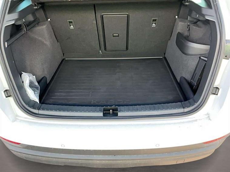 Advanced driver attention and drowsiness monitor, Drive Mode Selection including ECO function, Electro-mechanical PAS, Emergency services call system, Outside temperature gauge, Sensor for driver assistance systems, Service interval indicator, SmartLink wireless for Apple and wired for Android, Start/stop system with regenerative braking, Traffic sign recognition, USB C Port x 2 in front centre console, Virtual Cockpit - 10.25" digital display, Virtual pedal with electrically operated boot door, Wireless smartphone charging, DAB radio with Bluetooth, USB connection, Acoustic glass, Aero front windscreen wipers with intermittent function, Auto dimming rear view mirror with light and rain sensors, Black electric window control buttons, Body colour door mirrors and handles, Electric front and rear windows with child proof lock, Extended rear roof spoiler, Heated rear windscreen, LED daytime running lights, LED rear lights with high functionality welcome effect and dynamic indicators, Light assistant (coming/leaving home/tunnel light), Plastic scuff plates in door apertures, Privacy glass, Rear side wing doors, Rear window wiper with washer system and intermittent control, Safety reflectors on front doors, Third brake light, Unique dark chrome design logo on alloy wheels, 1.5 litre bottle holders in driver and front passenger door panels, 12V socket in boot, 12v socket in front centre armrest with storage compartment and rear air vents, 2 spoke leather heated multifunction steering wheel with DSG paddles, 2 x Tablet holder, 3 rear height adjustable headrests, 3 seat bench in 2nd row, 4 foldable roof handles with rear coat hooks, Black floor carpet, Cargo elements in boot, Chrome inner door handles, Decorative door sills with KAROQ badging, Foldable hooks in the boot, Front head restraints, Height adjustable front three point seats belts with tensioners, Height/reach adjust steering wheel, Ice scraper, Illuminated glovebox, Illuminated luggage compartment, Interior noise suppression, Isofix child seat preparation for front passenger seat, Isofix child seat preparation outer rear, Manual lumbar support for front seats, Pearl grey interior ceiling, Pen holder, Pollen filter, Rear boot cover, Rear package tray, Rear reading lights, Rubbish bin door, Safety vest holder, Single front passenger seat, Skoda lettering on steering wheel, Storage box in upper central dashboard closed, Sunvisors with illuminated vanity mirrors, Textile floor mats, Ticket holder, Columbus pack - Karoq, Design Pack - Karoq, Non Smokers pack, Parking pack - Karoq, Automatic door unlocking in case of crash, Automatic fuel cut off in case of crash, Driver airbag, Electronic parking brake with auto hold function, Emergency rear braking signal, ESC (incl. ABS+MSR+ASR+EDS+HBA+DSR+RBS+MKB), Front side airbags, Head airbags, Hill hold control, Knee airbags, Passenger airbag with switch-off function, Pedestrian monitor, Power operated child safety locks, Seatbelt reminder signalisation and pretensioner for all seats, Three point seatbelts rear, Two tone horn, Tyre pressure monitor, Alarm with interior monitoring, back up horn and tilt sensor with safe function, Electronic engine immobiliser, Keyless entry and start/stop, Remote central locking with 2 remote folding keys, Black centre console, Chrome framed air vents, Satin black dashboard, Anti-theft wheel bolts protection, Breakdown and tool kit,