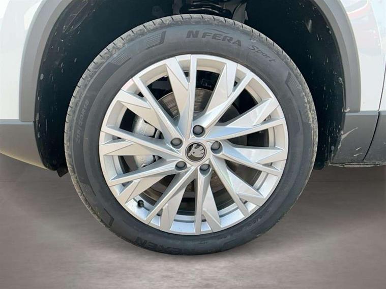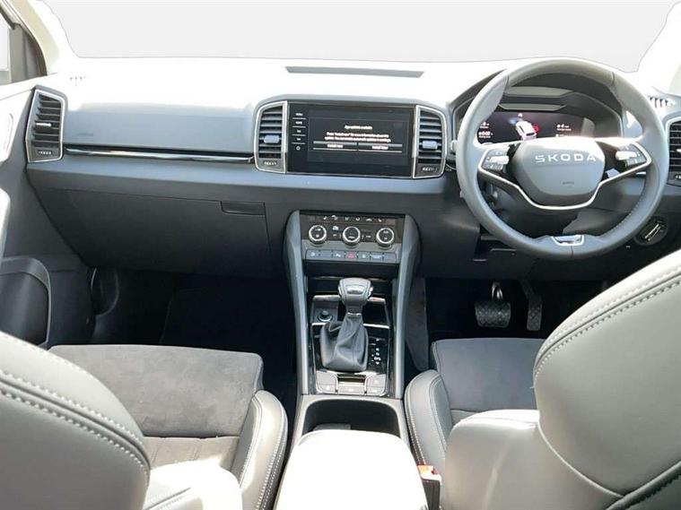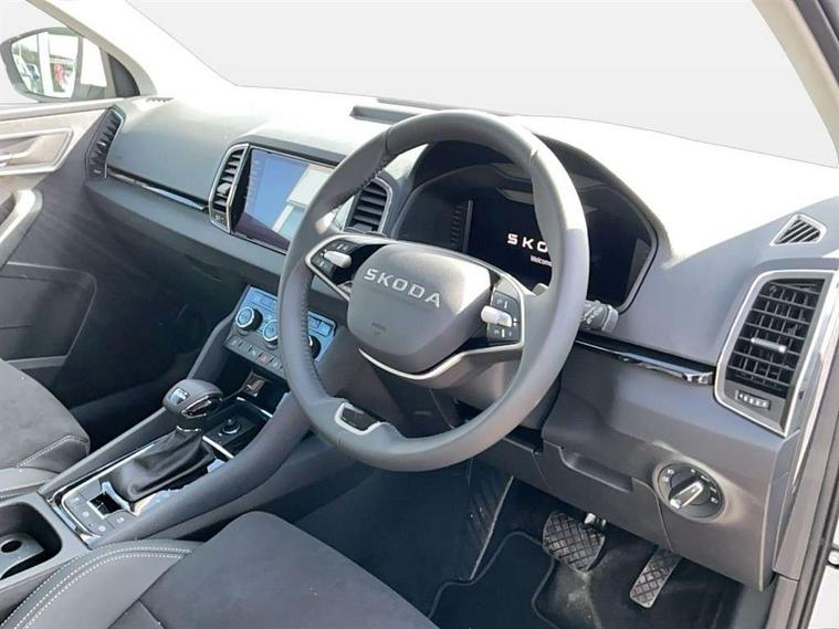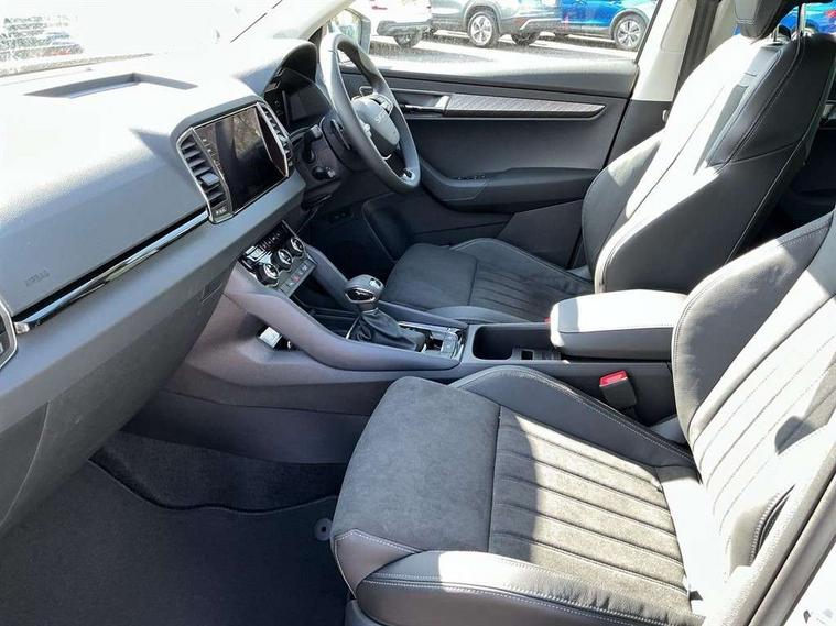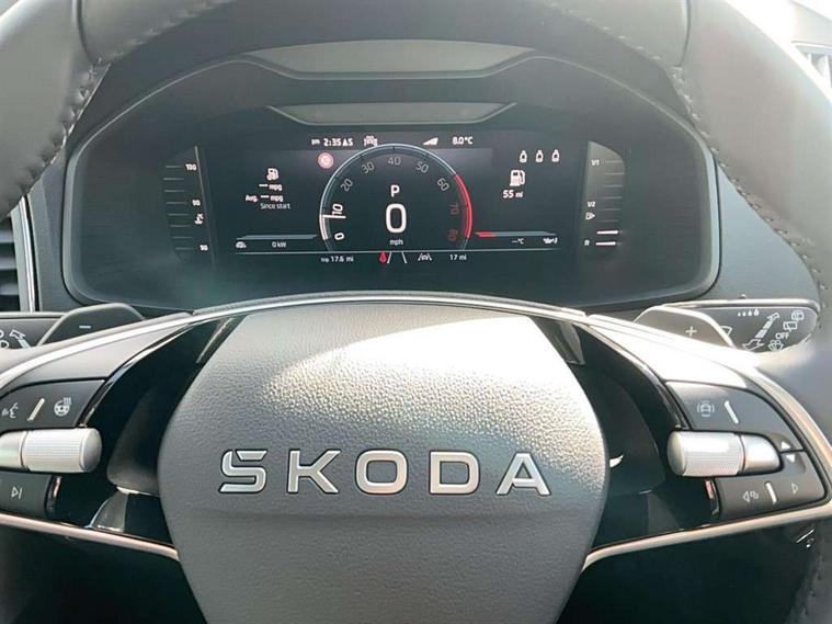 Advanced driver attention and drowsiness monitor, Drive Mode Selection including ECO function, Electro-mechanical PAS, Emergency services call system, Outside temperature gauge, Sensor for driver assistance systems, Service interval indicator, SmartLink wireless for Apple and wired for Android, Start/stop system with regenerative braking, Traffic sign recognition, USB C Port x 2 in front centre console, Virtual Cockpit - 10.25" digital display, Virtual pedal with electrically operated boot door, Wireless smartphone charging, DAB radio with Bluetooth, USB connection, Acoustic glass, Aero front windscreen wipers with intermittent function, Auto dimming rear view mirror with light and rain sensors, Black electric window control buttons, Body colour door mirrors and handles, Electric front and rear windows with child proof lock, Extended rear roof spoiler, Heated rear windscreen, LED daytime running lights, LED rear lights with high functionality welcome effect and dynamic indicators, Light assistant (coming/leaving home/tunnel light), Plastic scuff plates in door apertures, Privacy glass, Rear side wing doors, Rear window wiper with washer system and intermittent control, Safety reflectors on front doors, Third brake light, Unique dark chrome design logo on alloy wheels, 1.5 litre bottle holders in driver and front passenger door panels, 12V socket in boot, 12v socket in front centre armrest with storage compartment and rear air vents, 2 spoke leather heated multifunction steering wheel with DSG paddles, 2 x Tablet holder, 3 rear height adjustable headrests, 3 seat bench in 2nd row, 4 foldable roof handles with rear coat hooks, Black floor carpet, Cargo elements in boot, Chrome inner door handles, Decorative door sills with KAROQ badging, Foldable hooks in the boot, Front head restraints, Height adjustable front three point seats belts with tensioners, Height/reach adjust steering wheel, Ice scraper, Illuminated glovebox, Illuminated luggage compartment, Interior noise suppression, Isofix child seat preparation for front passenger seat, Isofix child seat preparation outer rear, Manual lumbar support for front seats, Pearl grey interior ceiling, Pen holder, Pollen filter, Rear boot cover, Rear package tray, Rear reading lights, Rubbish bin door, Safety vest holder, Single front passenger seat, Skoda lettering on steering wheel, Storage box in upper central dashboard closed, Sunvisors with illuminated vanity mirrors, Textile floor mats, Ticket holder, Columbus pack - Karoq, Design Pack - Karoq, Non Smokers pack, Parking pack - Karoq, Automatic door unlocking in case of crash, Automatic fuel cut off in case of crash, Driver airbag, Electronic parking brake with auto hold function, Emergency rear braking signal, ESC (incl. ABS+MSR+ASR+EDS+HBA+DSR+RBS+MKB), Front side airbags, Head airbags, Hill hold control, Knee airbags, Passenger airbag with switch-off function, Pedestrian monitor, Power operated child safety locks, Seatbelt reminder signalisation and pretensioner for all seats, Three point seatbelts rear, Two tone horn, Tyre pressure monitor, Alarm with interior monitoring, back up horn and tilt sensor with safe function, Electronic engine immobiliser, Keyless entry and start/stop, Remote central locking with 2 remote folding keys, Black centre console, Chrome framed air vents, Satin black dashboard, Anti-theft wheel bolts protection, Breakdown and tool kit,