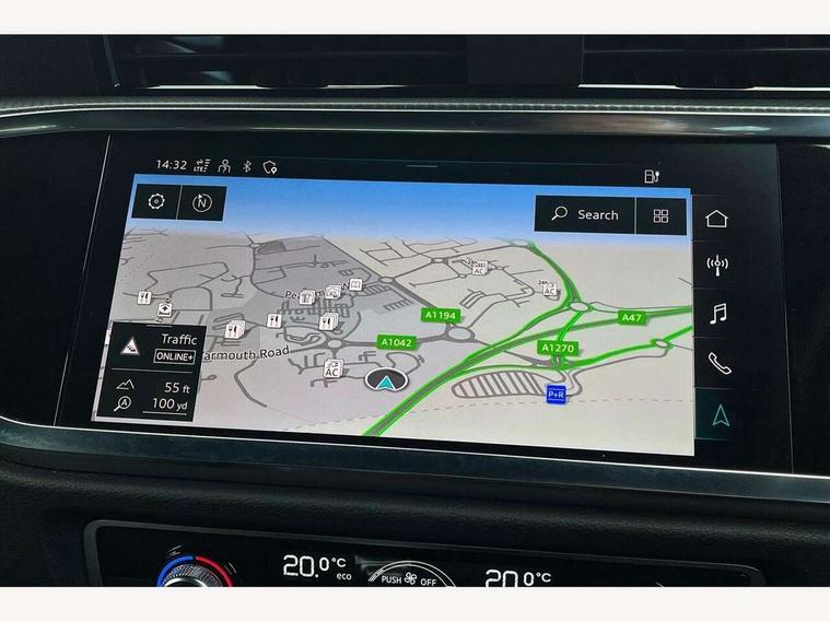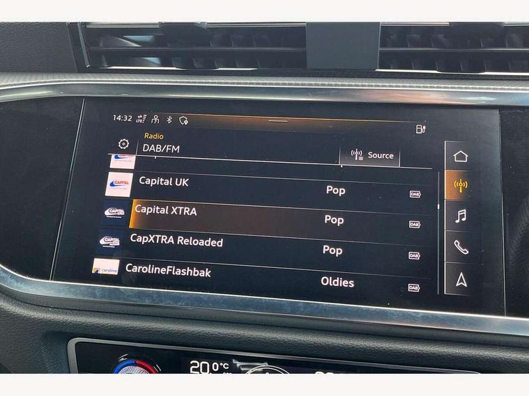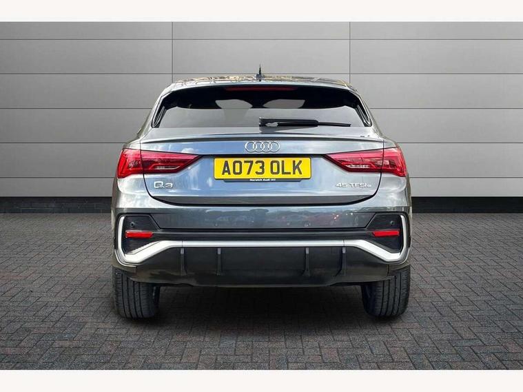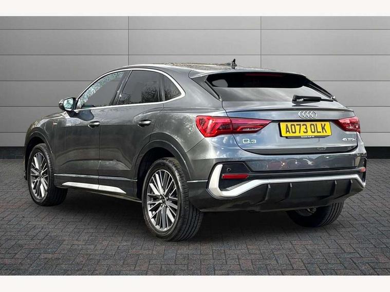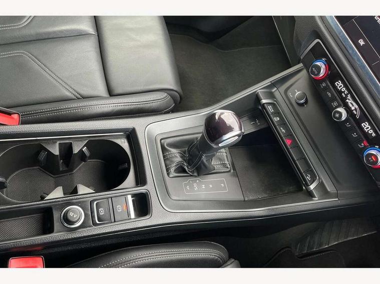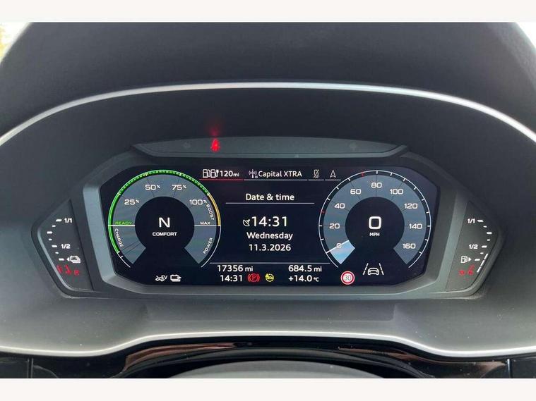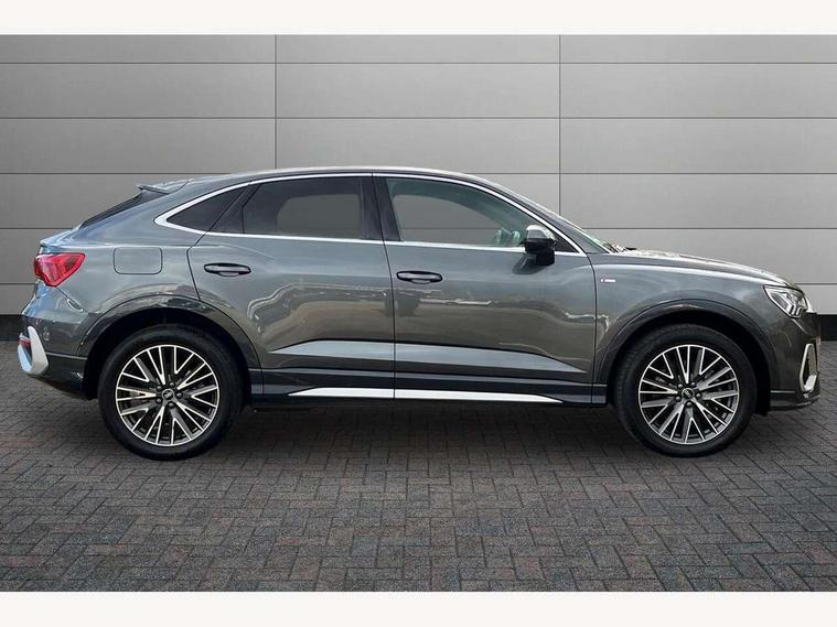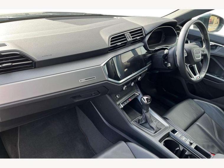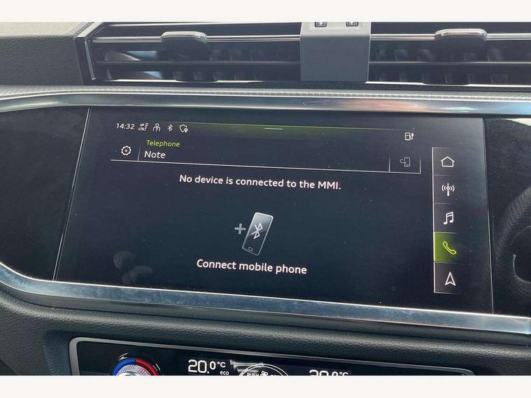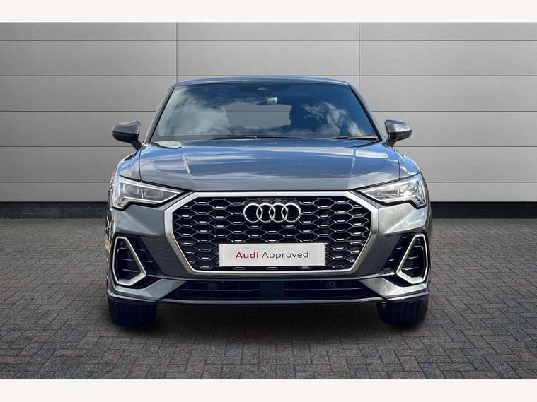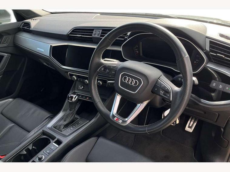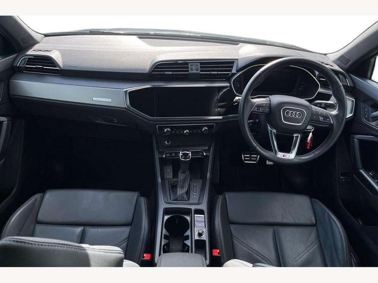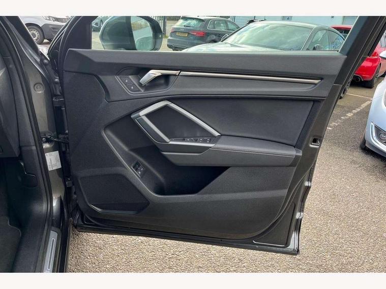 Audi drive select, Audi lane departure warning, Audi Virtual Cockpit - 10.25" display, Bluetooth interface, Camera based traffic sign recognition, Legal emergency call, MMI Navigation Plus with high resolution 10.1 inch touchscreen colour display, Power operated tailgate, Progressive steering, Service interval indicator, Smartphone interface includes wireless Apple carplay/Android Auto, Start stop system with recuperation, Voice control system with natural language interaction, 3 pin 10 amp domestic charging cable, 3.6 kw On-board charger, Standard suspension, Type 2 mode 3 32 amp charging cable, Type 2 socket for AC charging, 2 USB-C ports with charge and data functions, 6 passive loudspeakers, DAB digital radio module, Acoustic windscreen, Aluminium window trim, Auto dimming frameless rear view mirror, Diffuser grille in grained matt black, Diffuser trim in selenite silver, Electrically folding, adjustable and heated door mirrors with integrated LED side indicators and kerb view function for passenger side, Front and rear electric windows, Front fog lights, Front side air inlets in selenite silver, Front underbody protection in manhattan grey paint finish, Grille surround in aluminium silver matt, High gloss black finish B and C pillars, LED Dynamic rear indicators, LED headlights with LED daytime running lights, LED rear lights, LED third brake light, Privacy glass dark tinted rear and rear-side windows (from B-pillar backwards), Radiator grille in anthracite black with inlay in matt aluminium silver, Rain and light sensors, Rear side wing doors, Rear underbody protection in matt black, Rear wiper, S line badges on front wings, S line front and rear bumpers and side skirts in contrasting Manhattan grey paint finish, Side skirt insert in matt Platinium grey, Variable front intermittent wipers, 12V socket in rear centre console, 3 seat bench in 2nd row, 3 spoke leather multifunction steering wheel features S badging and grips in perforated leather with contrast stitching, 40:20:40 folding with manual adjustment for 60:40 forwards/backwards position and backrest angle, Adjustable rear seat bench/backrest with centre armrest and cupholder, Black cloth headlining, Dual zone electronic climate control, Front and rear black floor mats with contrast stitching, Front and rear headrests, Front and rear roof module including reading lights, Front centre armrest, Glove compartment lighting, Height and reach adjustable steering wheel, Illuminated door sill trims with S logo, ISOFIX child seat mounting for front passenger with airbag deactivation and outer rear seat including top tether attachment point for outer rear seats, Luggage compartment light right in white, Luggage compartment sill protection in stainless steel, Manual front seats with height adjustment, Perforated leather gearknob, Single front passenger seat, Stainless steel pedals, Ambient lighting pack - Q3, Non smoking pack - Q3, 3x3 point rear seatbelts, 6 airbags - Driver, front passenger, curtain and side windows, Audi pre-sense front with pedestrain and cyclist recognition, Electrically operated child locks on rear doors, Electromechanical parking brake, Electronic stabilisation control including ABS, ASR and EDL, Front seatbelt reminder, Hill descent control, Hill hold assist, Pre sense basic, Seatbelt monitoring, Tyre pressure warning, Warning triangle and first aid kit, Anti theft alarm, Anti theft wheel bolts, Immobiliser, Remote central locking, Aluminium look interior elements, Black dashboard, Dark matt brushed aluminium inlay, Detail dashboard around MMI touch colour display in glass look, black with surround in aluminium look, Leatherette door armrest, Tool kit, Tyre repair kit,