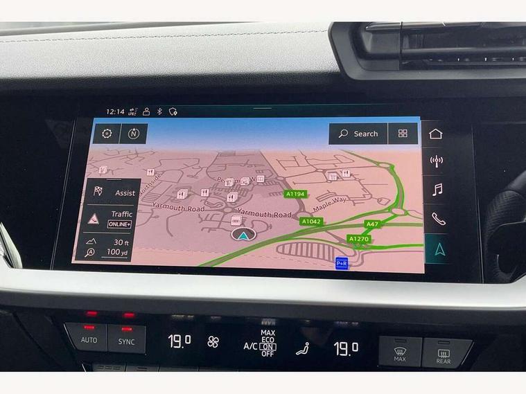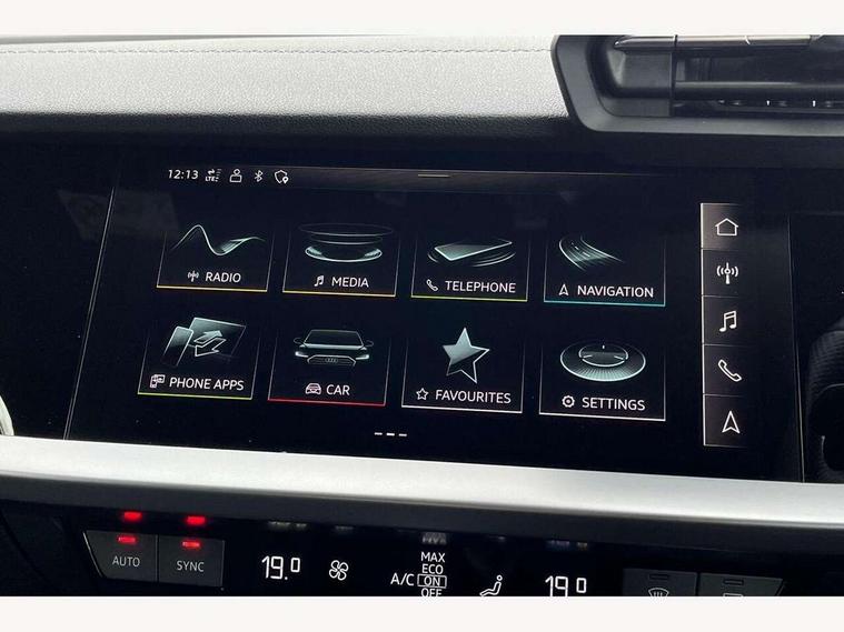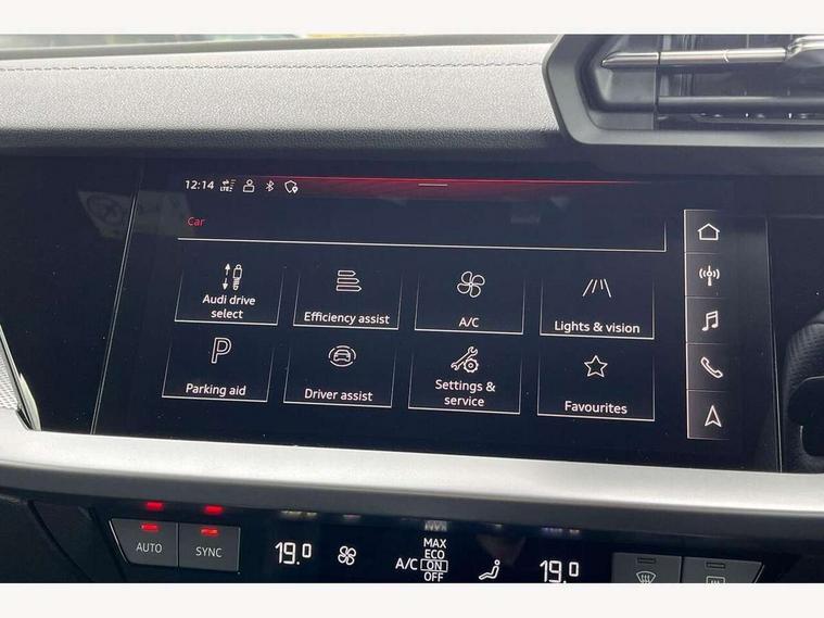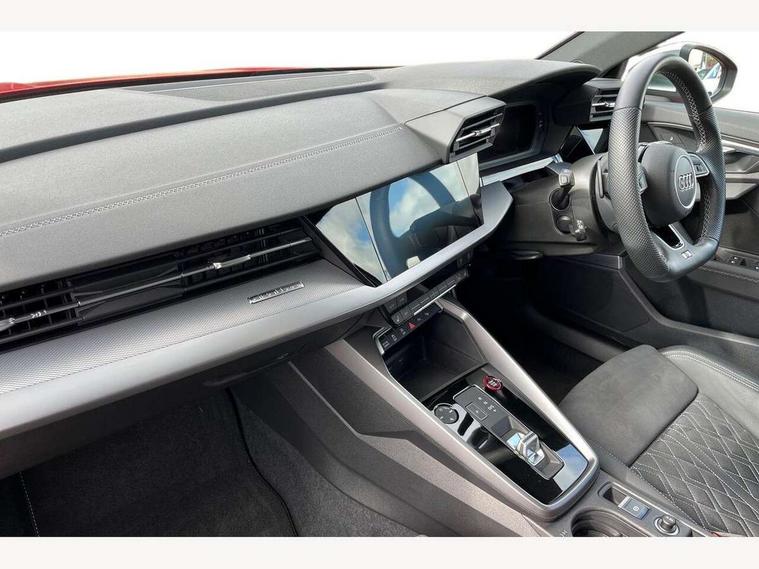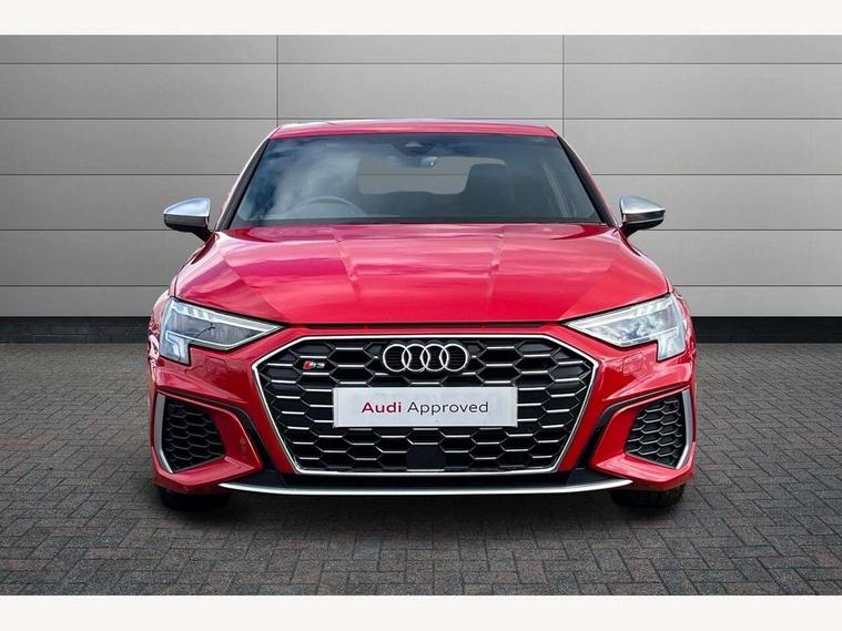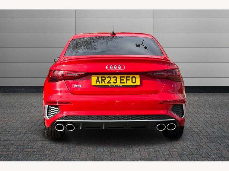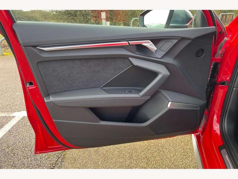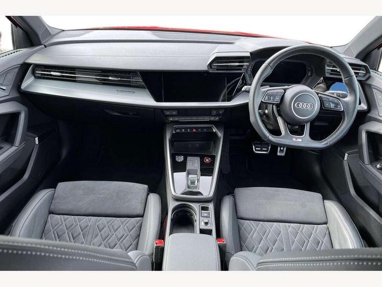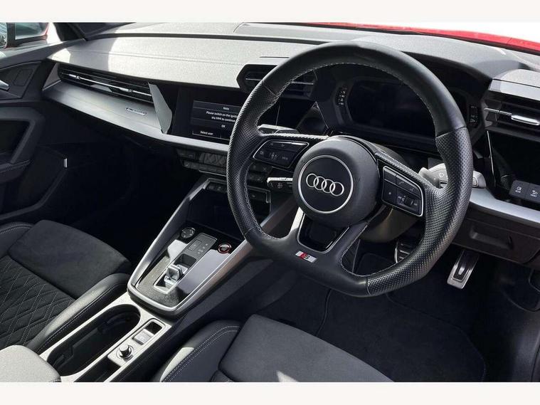 Audi connect emergency call and service, Audi drive select (Auto, Comfort, Dynamic, Efficiency and Individual), Audi smartphone interface, Audi Virtual Cockpit - 10.25" digital and colour instrument cluster, Automatic start/stop system with recuperation, Bluetooth interface, Collision avoidance assistant, Lane departure warning system, MMI Navigation Plus with high resolution 10.1" colour touch screen display, Progressive steering, Service indicator, Voice control system with natural language interaction, Quattro permanent all wheel drive, S sport suspension with spring damper adjustment and lowering by 15mm, 2x USB Type C ports (for charging and data transfer), 6 passive loudspeakers, CD player, DAB Digital radio, 3rd brake light, Acoustic glass windscreen, Audi Beam uses LEDs to project the Audi logo onto the ground as you exit your S3, Auto dimming frameless rear view mirror, Dual branch oval twin tailpipes in chrome plated finish, Electrically adjustable/heated/folding/auto dimming door mirrors with integrated LED indications + kerb view function for passenger side, Exterior mirror with aluminium look housing, Front electric windows, Headlight washers, Illuminated door sills with aluminium inserts at the front with S logo, LED daytime running lights, LED headlights with LED rear lights and dynamic rear indicators, Light and rain sensors, Model and engine designation badges at rear, Privacy glass - dark tinted rear window, rear door and side windows, Rear boot, Rear electric windows, Rear side wing doors, 12V socket and storage compartment in front centre console, 3 seat bench in 2nd row, 40/20/40 split folding rear seat bench with cupholder, Black cloth headlining, Dual zone electronic climate control, Fine Nappa leather upholstery with front sports seats S embossed logo, Front and rear centre armrest in leather, Front and rear headrests, Front/rear floor mats, Heated front seats, Height and reach adjustable steering wheel, Illuminated vanity mirror, Interior lighting - glove compartment light and right hand side, Luggage compartment floor covering, Manual boot compartment lid, Single front passenger seat, Stainless steel pedals and front footrest in black, Body styling design pack - S3, LED interior lighting pack - A3 Saloon, Storage pack - A3/S3 Saloon, 3x3 point rear seat belts, Driver and front passenger airbag with passenger airbag deactivation, Electronic Stabilisation Control (ESC) including ABS, ASR and EDL, First aid kit with warning triangle and 2 safety vests, Front side airbags with head airbags and interaction airbag, Hill hold assist, Pre-sense front with pedestrian and cyclist detection, Seatbelt monitoring, Tyre pressure loss indicator, Anti theft alarm, Anti-theft wheel bolts, Electronically operated child locks, Immobiliser, Remote control central locking, Aluminium air vent surrounds, Aluminium trim elements, Dark spectrum aluminium inlays, accent surfaces in the dashboard and centre console in platinum grey silk effect paint finish,