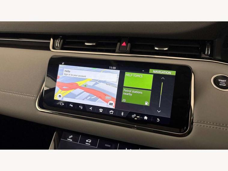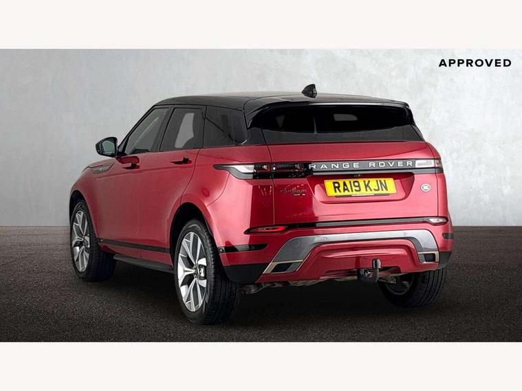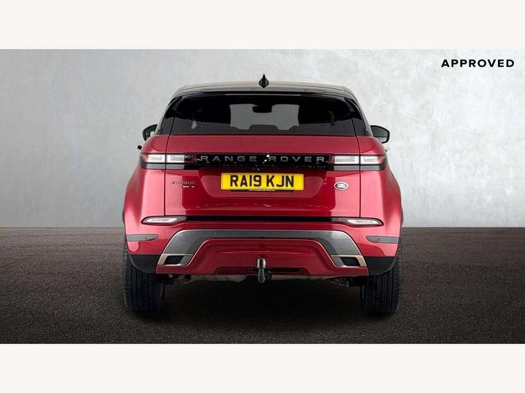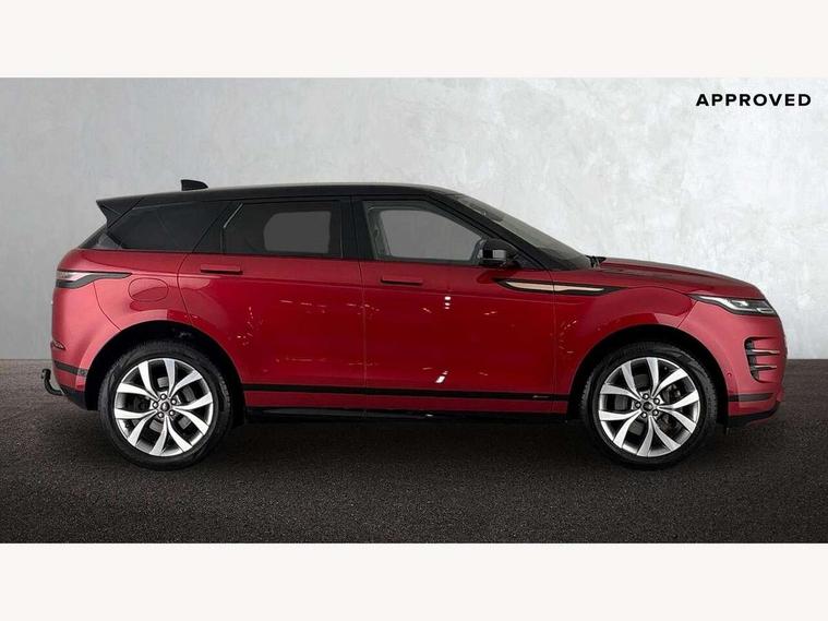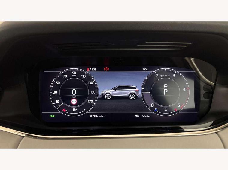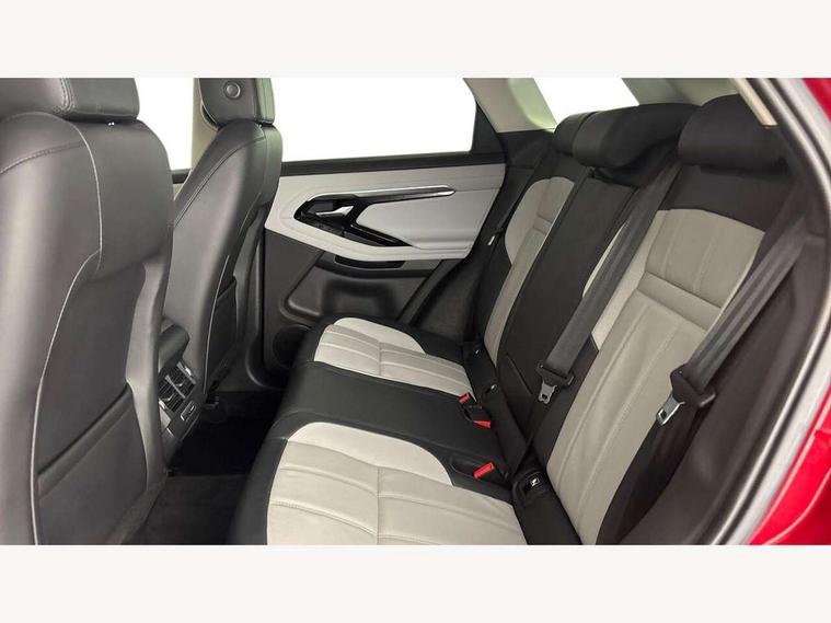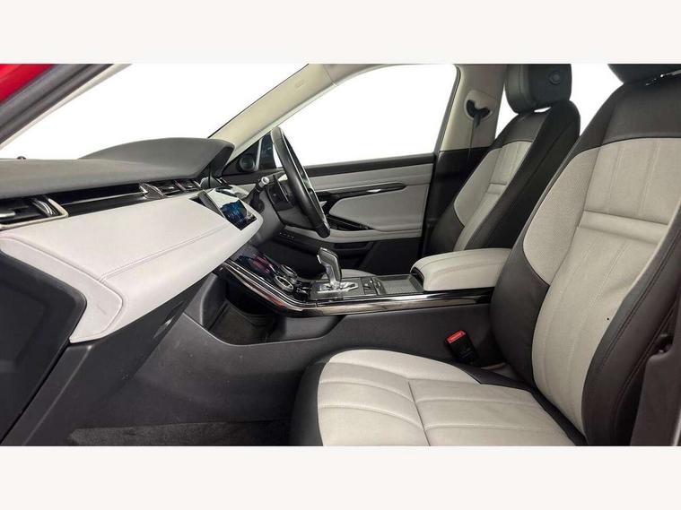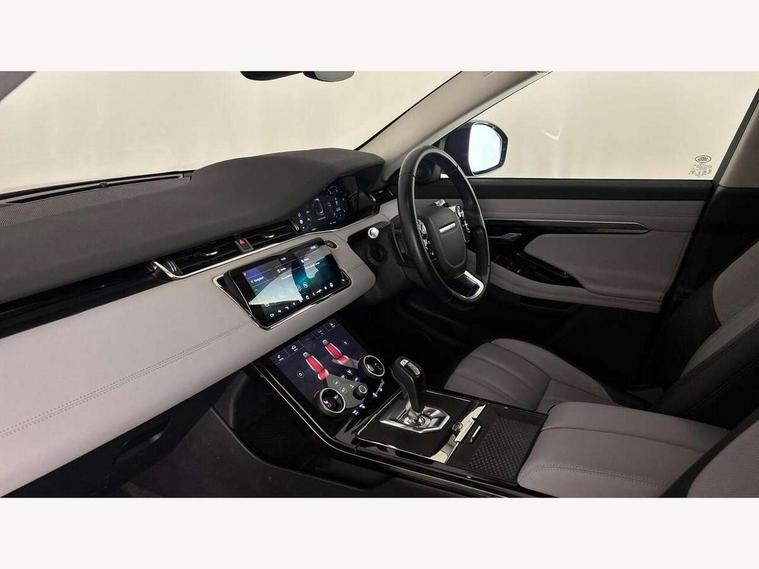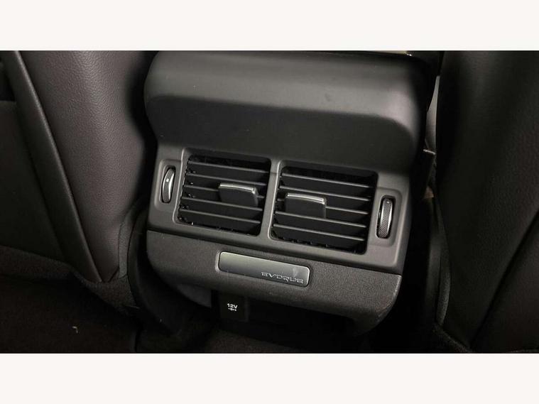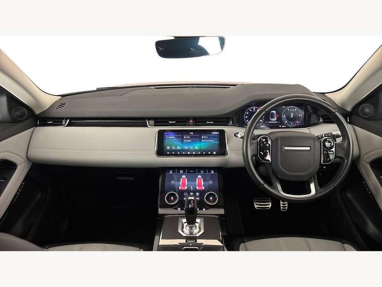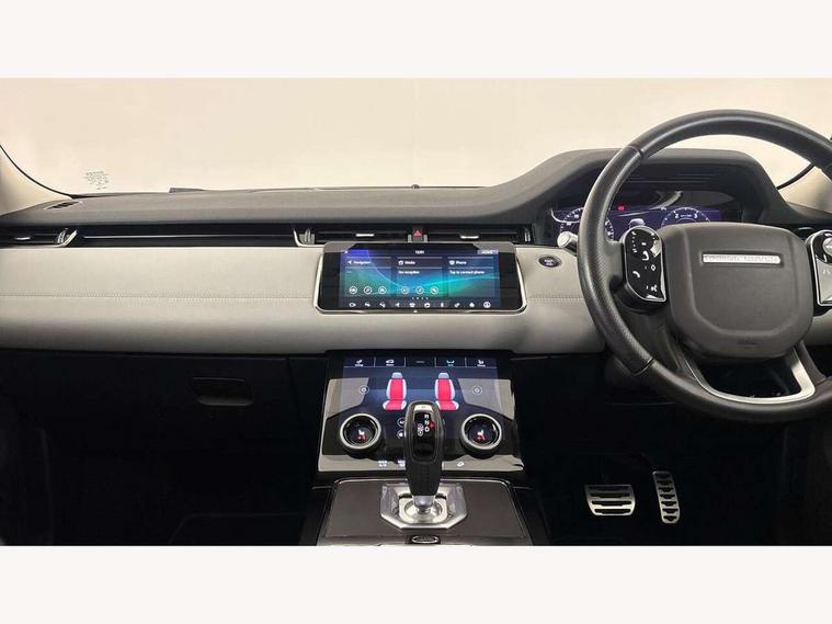 360 degree parking aid, Android Auto, Apple car play, Bluetooth connectivity, Brake pad wear indicator warning light, Clear exit monitor, Driver condition monitor, Duo touch pro, Electronic power assisted steering (EPAS), InControl remote, Interactive Driver display instrument cluster, Land Rover InControl apps, Lane keep assist, Navigation pro system, Park assist - Parallel, perpendicular and parking exit, Pro services and wifi hotspot, Push button starter, Rear traffic monitor, Smart settings, Traffic sign recognition with adaptive speed limiter, Voice control system, Active Driveline, All terrain progress control, Passive suspension, Terrain Response 2 Auto, Digital Audio Broadcast radio-DAB, Steering wheel mounted controls, Automatic headlight levelling, Electric windows with one touch open/close and anti trap, Evoque and R-Dynamic badge, Flush deployable exterior door handles, Heated rear window with timer, Heated washer jets, Heated windscreen, Power fold, auto-dimming, heated door mirrors with memory and approach lights, Rain sensing windscreen wipers, Rear fog lights, Shadow atlas bonnet and tailgate script, Tailgate spoiler, 40:20:40 split folding rear seats, Black gearshift paddles, Bright metal pedals, Isofix system on outer rear seats, Overhead lighting console, Overhead stowage for sunglasses, Passive front head restraints, Rear air vents, Rear centre headrest, Sunvisors with illuminated vanity mirrors, Twin front cupholders with cover, Twin sliding front centre armrest, Two zone climate control, Anti-lock braking system (ABS), Customer configurable autolock, DSC - Dynamic Stability Control, Electronic brake force distribution, Electronic parking brake, Electronic traction control, Front and rear seatbelt reminder, Hill descent control, Hill launch assist, Low traction launch, Power operated child locks, Roll stability control, Six airbags - Driver and passenger airbags/driver knee airbag/front side airbag and curtain airbags, Torque vectoring brake, Tyre pressure monitoring system, Alarm, Immobiliser, Intrusion sensor, Locking wheel nuts,