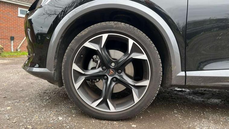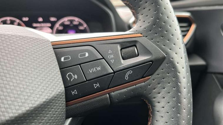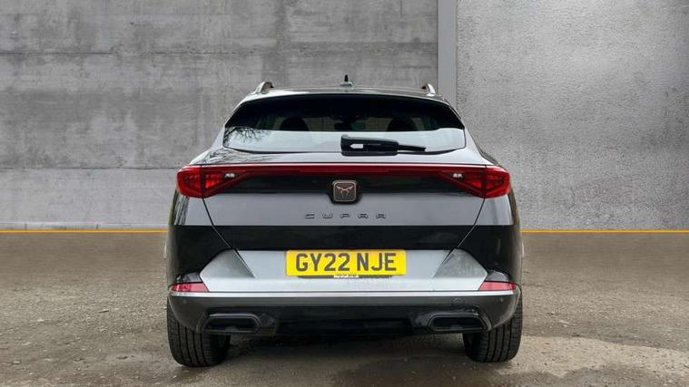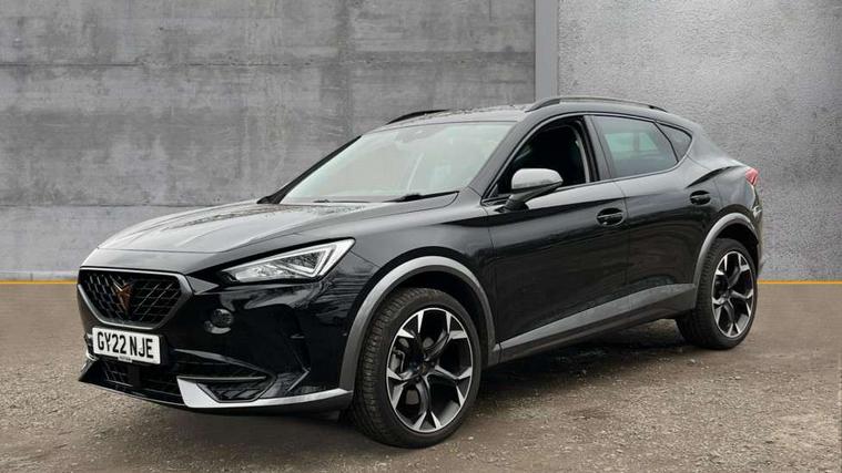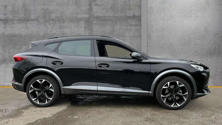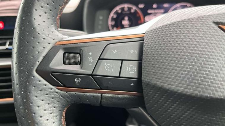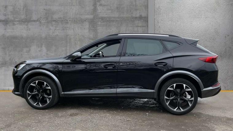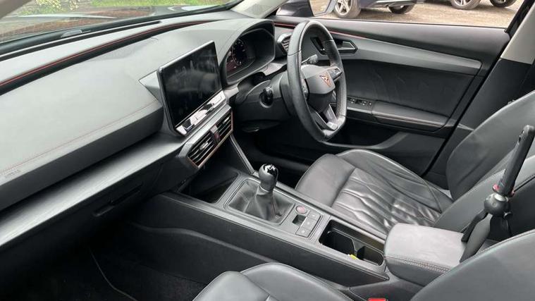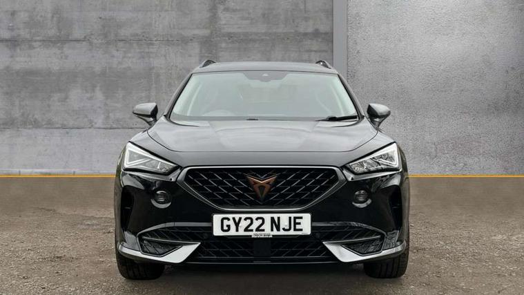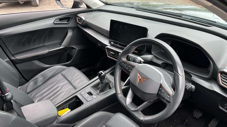 Digital cockpit and configurable dashboard, Driver alert system, Driving profile selection, E-call, Forward collision warning with automatic braking, Lane assist, Park assist (inc front/rear parking sensors), PAS, Predictive adaptive cruise control with speed limiter, Rear view camera, RPM, trip computer, outside temp gauge, instrument light brightness, low fuel warning light, lights on reminder, gearshift indicator, Service interval indicator, Start/stop system with regenerative braking, Wireless apple carplay, Wireless phone charger, Electronic locking differential and dynamic traction support, Standard suspension, 2 front and 2 rear USB type C sockets, Auxiliary input socket, DAB radio, Auto dimming rear view mirror, Body colour door handles, Body coloured bumpers, Dark grey wing mirror, Daytime running light with automatic headlight control and coming home feature, Dynamic headlight range control, Electric front/rear windows, Electrically adjustable heated and folding door mirrors with memory function, Front fog lamps with cornering function, Gloss black roof rails and window surrounds, LED Headlights, LED Taillights with dynamic indicator, Rain sensing wipers, Rear diffuser with black simulated exhaust pipes, Rear side wing doors, Rear wash/wipe, Third brake light, Tinted rear windows, Welcome lights, 12v power supply in centre console, 12V socket, 12v socket in loadspace, 2 front and 2 rear reading lights, 230V socket, 3 seat bench in 2nd row, 60/40 split rear bench seat with armrest and mechanical seat release, Dust/pollen filter, Front and rear head restraints, Front centre armrest, Height/reach adjust steering wheel, Illuminated interior front door sills, Illuminated sunvisor with mirror, Isofix, Leather multi function steering wheel, Luggage tie-down hooks, Single front passenger seat, Three zone climate control with control panel in rear, Variable luggage/load compartment floor, Wraparound lighting, Genuine Nappa leather Pack - Cupra, Navigation system pack with 10" navigation system - Formentor, Safety and driving pack (M) - Formentor, 3 point seatbelts on all rear seats, ABS, Brake control system - ESC and brake booster, Child proof door locks, Driver and front passenger airbags with front passenger airbag de-activation, Electronic parking brake, Front and rear disc brakes, Front side curtain airbags, Hill hold control, Seat belt reminder for front and rear seats, Tyre pressure monitoring system, Anti theft alarm system, Keyless entry and start system (KESSY), Locking wheel bolts, Copper and aluminium interior detailing, 19" 'Exclusive' machined sport matte black and silver alloy wheels,