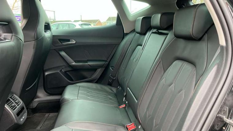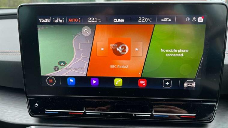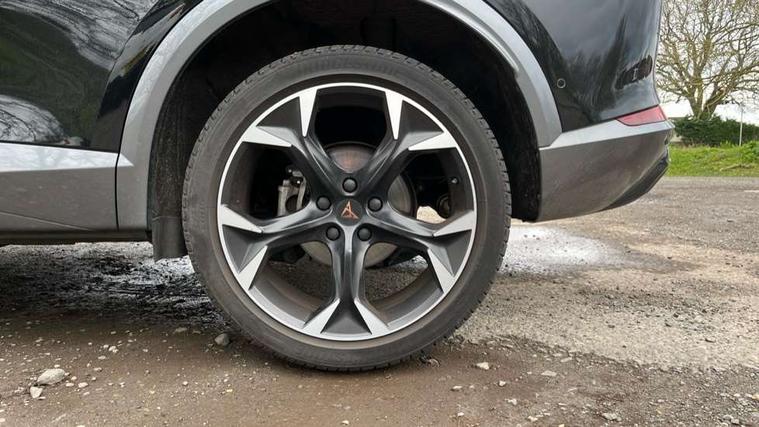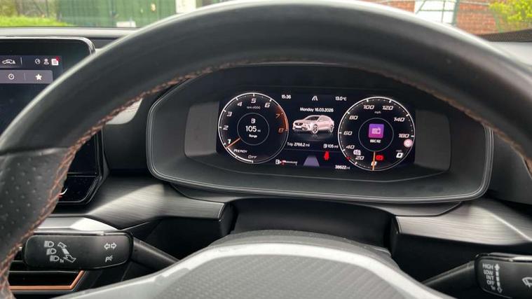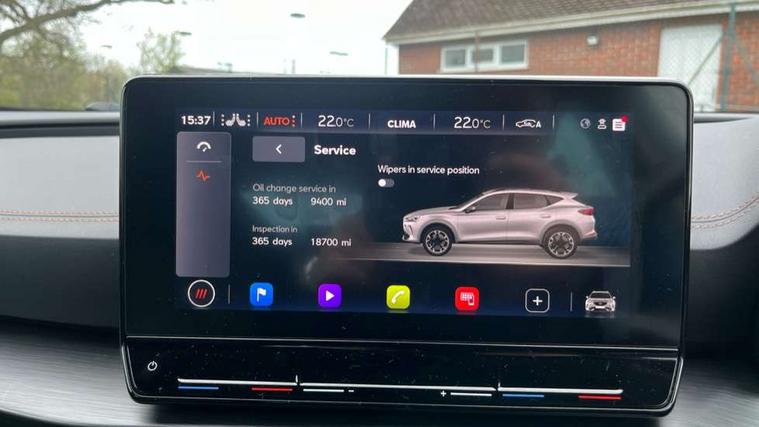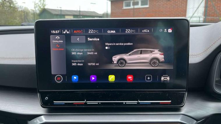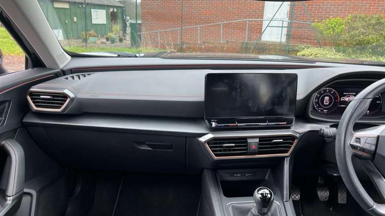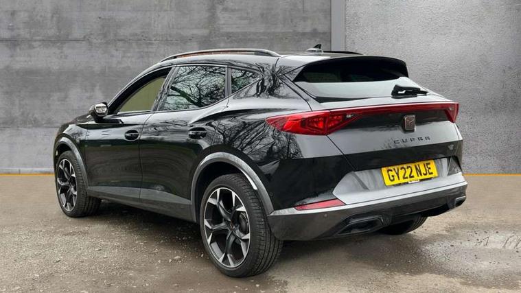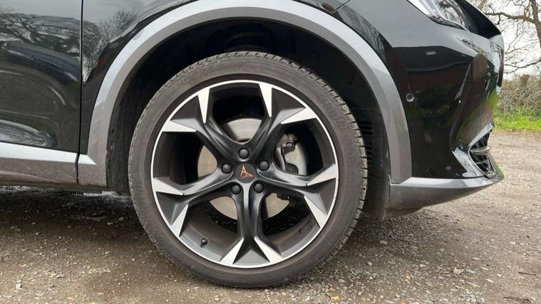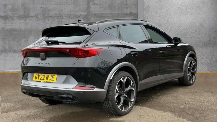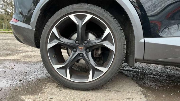 Digital cockpit and configurable dashboard, Driver alert system, Driving profile selection, E-call, Forward collision warning with automatic braking, Lane assist, Park assist (inc front/rear parking sensors), PAS, Predictive adaptive cruise control with speed limiter, Rear view camera, RPM, trip computer, outside temp gauge, instrument light brightness, low fuel warning light, lights on reminder, gearshift indicator, Service interval indicator, Start/stop system with regenerative braking, Wireless apple carplay, Wireless phone charger, Electronic locking differential and dynamic traction support, Standard suspension, 2 front and 2 rear USB type C sockets, Auxiliary input socket, DAB radio, Auto dimming rear view mirror, Body colour door handles, Body coloured bumpers, Dark grey wing mirror, Daytime running light with automatic headlight control and coming home feature, Dynamic headlight range control, Electric front/rear windows, Electrically adjustable heated and folding door mirrors with memory function, Front fog lamps with cornering function, Gloss black roof rails and window surrounds, LED Headlights, LED Taillights with dynamic indicator, Rain sensing wipers, Rear diffuser with black simulated exhaust pipes, Rear side wing doors, Rear wash/wipe, Third brake light, Tinted rear windows, Welcome lights, 12v power supply in centre console, 12V socket, 12v socket in loadspace, 2 front and 2 rear reading lights, 230V socket, 3 seat bench in 2nd row, 60/40 split rear bench seat with armrest and mechanical seat release, Dust/pollen filter, Front and rear head restraints, Front centre armrest, Height/reach adjust steering wheel, Illuminated interior front door sills, Illuminated sunvisor with mirror, Isofix, Leather multi function steering wheel, Luggage tie-down hooks, Single front passenger seat, Three zone climate control with control panel in rear, Variable luggage/load compartment floor, Wraparound lighting, Genuine Nappa leather Pack - Cupra, Navigation system pack with 10" navigation system - Formentor, Safety and driving pack (M) - Formentor, 3 point seatbelts on all rear seats, ABS, Brake control system - ESC and brake booster, Child proof door locks, Driver and front passenger airbags with front passenger airbag de-activation, Electronic parking brake, Front and rear disc brakes, Front side curtain airbags, Hill hold control, Seat belt reminder for front and rear seats, Tyre pressure monitoring system, Anti theft alarm system, Keyless entry and start system (KESSY), Locking wheel bolts, Copper and aluminium interior detailing, 19" 'Exclusive' machined sport matte black and silver alloy wheels,