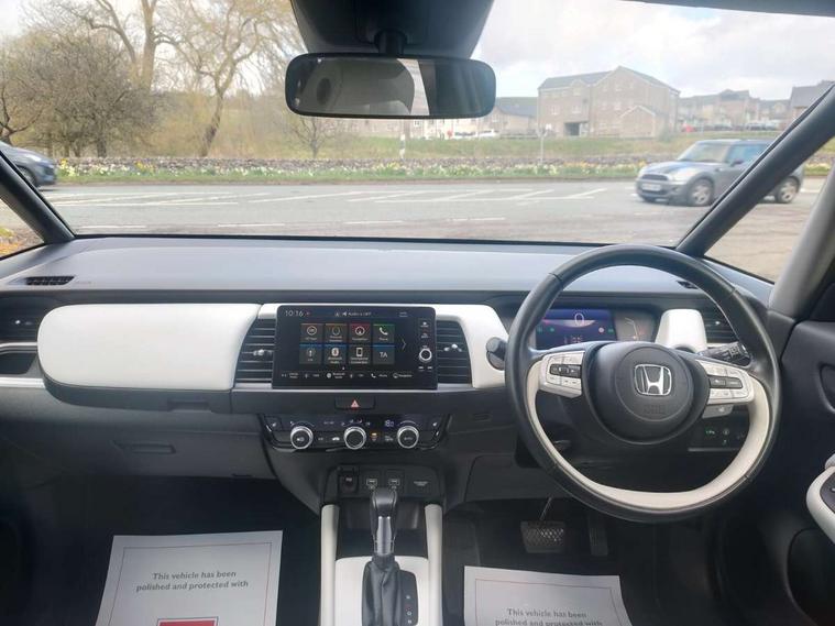 Adaptive cruise control, Adjustable speed limiter, Agile handling assist, BLIS (Blind Spot Information System) with Cross Traffic Monitor, Bluetooth hands free telephone connection, eCall emergency call system, Econ mode, Electric power steering wheel with variable gear ratio steering, Emergency stop signalling system, Forward collision warning, Front and rear parking sensors, Honda CONNECT with HERE Navigation + 9" touchscreen, AM/FM/DAB/Apple Carplay and android auto, Idle stop, Intelligent speed limiter, Lane departure warning system, Lane keep assist system, Low speed following, Multi-information display, Rear view camera, Road departure mitigation, Traffic sign recognition, Vehicle stability assist, 'Shark fin' mobile antenna, 2 USB sockets in rear, 2x USB Front socket (1 data & 1 charge), 4 speakers, Remote audio controls on steering wheel, Aspheric door mirrors, Auto wipers, Automatic headlights with on/off timer, Coming/leaving home function, Body colour door handles, Body coloured bumpers, eHEV emblem, Electric adjustable door mirrors, Electrically folding door mirrors, Front and rear electric windows, Heated door mirrors, High beam assist, LED daytime running lights, LED front fog lights, LED Headlights, LED rear lights, Privacy glass, Rear side wing doors, Rear wiper, Single exhaust tailpipe, Third brake light, 3 seat bench in 2nd row, 60/40 split rear bench seat, Cargo net hooks, Climate control air conditioning, Driver and front passenger seat armrests, Driver and passenger front seat pockets, Driver's seat height adjustment, Fabric/leather upholstery, Front accessory power socket, Front head restraints, Front map lights, Front/rear courtesy lights, Heated front seats, Heated steering wheel, Isofix child seat restraint mechanism, Isofix points, Leather gearshift knob, Leather steering wheel, Magic seat flexibility system, Paddle shift controls, Plating interior door handles, Rear head restraints, Rear parcel shelf, Single front passenger seat, Sunvisors with vanity mirrors, Tilt/telescopic adjustable steering wheel, Tonneau cover, Trunk light, 3x3 point rear seatbelts, Anti-lock braking system (ABS), Brake assist function, Brake hold function, Child locks on rear doors, Collision mitigation braking system, Deflation warning system, Driver knee airbag, Driver SRS airbag (single stage inflation), Driver/Front Passenger airbags, Electric parking brake, Front and rear side curtain airbag, Front side airbags, Hill start assist, Passenger SRS airbag cut-off device, Rear side airbags, Whiplash lessening front headrests, Front seat belt with emergency locking retractor, Honda super locks, Immobiliser, Mirrors and windows key fob operation, Remote central locking with 2 remote folding keys, Security alarm, Smart entry + Smart start, Soft pad leather interior panels, 16" Multi apperance alloy wheels in mat berlina black, Tyre repair kit,
