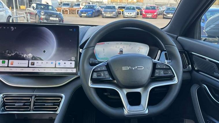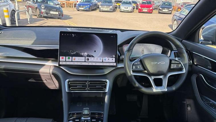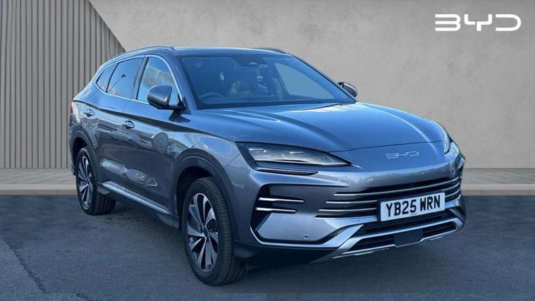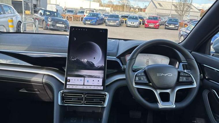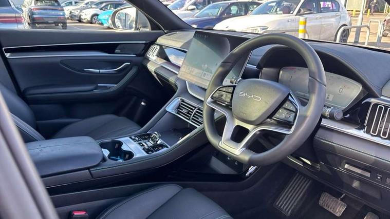 12.3" TFT full LCD instrument panel, 360 camera, Adaptive Cruise Control (ACC) and Intelligent Cruise Control (ICC), Automatic vehicle hold, Blind spot detection, BYD voice control assistant "Hi, BYD", Controller Deceleration Parking (CDP), Drive mode select (Eco, normal, sport, snow), e-Call (emergency call), Electric tailgate release, Emergency Lane Keeping Assist (ELKA), Forward collision warning, Front and rear parking sensors, Front cross traffic alert and front cross traffic brake, Head up Display, Indirect driver fatigue management, Intelligent Speed Limit Control (ISLC), Keyless system entry and start, Lane change assist, Lane Departure Assistant (LDA) and Lane Departure Warning (LDW), Lane departure prevention, PAS, Predictive collision warning, Rear collision warning, Rear cross traffic alert and rear cross traffic brake, Rollover Control System (RMI), Smartphone wireless charging, 2 x 15W, Traffic sign recognition (TSR), Vehicle-to-Load (V2L) function, 11kW on board charger, Mode 3 Type 2 charging cable (3 phase), V2L (Vehicle to load) power strip - Type F, 15.6" Electrically rotatable touchscreen, FM/DAB+ radio, Front USB ports, 1 x 18W Type C, 1 x 60W Type C, Infinity sound system with 10 speakers, Rear USB ports, 2 x 18W Type C, Aluminium roof rails, Auto dimming interior rear view mirror, Auto headlamps (on/off), Dynamic welcome lights, Electric folding and heated door mirrors, Emergency tow hook, Exterior mirror footlights, Follow me home headlights (The headlights turned on in advance and delayed off function), Front windscreen, UV protection, thermal insulation and sound proofing, High beam assist, LED 3rd brake light, LED daytime running lights, LED Headlights, LED taillights, One touch electric front/rear windows with pinch protection, Panoramic sunroof with anti-pinch sensor and electrically adjustable sunshade, Rain sensor windscreen wipers, Rear fog lights, Rear side wing doors, Rear window and rear windscreen with tinted glass, Rear wiper, 12V power outlet, 3 seat bench in 2nd row, 8 way electrically adjustable drivers seat, Adjustable rear headrests, Boot parcel shelf, Driver and passenger sunvisors with illuminated vanity mirrors, Driver seat memory function, Front centre armrest with 2 cupholders, Front LED reading lights, Front passenger seat with 4-way electric adjustment, Front seat footlights, Heat pump, Heated front seats, Heated steering wheel, Integrated headrest in front seats, ISOFIX and i-Size for front passenger and outer rear seats, LED front door lights, Nylon floor mats, PM2.5 air filter, PM2.5 air purification system, Rear air vents, Rear armrest with 2 cupholders, Rear side LED reading lights, Rhythm-reactive multi-colour ambient lighting, Single front passenger seat, Split folding rear seats - 40/60, Vegan leather multifunction steering wheel, Vegan leather upholstery, Ventilated front seats, 3x3 point rear seatbelts, ABS/EBD, Automatic emergency braking system, Brake override system (BOS), Child presence detection, Comfort stop, Door open warning, Driver airbag, Electric parking brake, Force limiting pre-tensioned front seat belts, Front centre airbag, Front passenger airbag, Front passenger airbag deactivation, Front side airbags, Hill descent control, Hill hold control, Hydraulic Brake Assist (HBA), Hydraulic brake boost, Mechanical child safety lock, Rear middle seat force limiting seat belt, Rear seat belt pretensioners, Reflective vest, Side curtain airbags, Traction control system (TCS), Tyre pressure monitoring system (TPMS), Vehicle Dynamics Control System (VDC), Warning triangle, 2 x Smart keys, Anti theft alarm system, Automatic door locking, 19" Bi-colour alloy wheels, Tyre nut covers remover, Tyre repair kit,