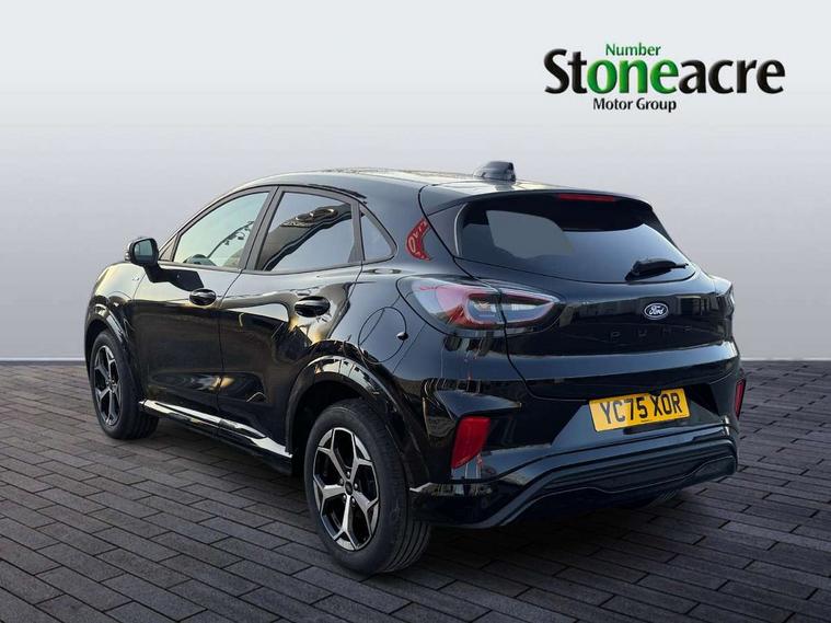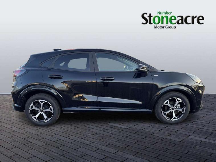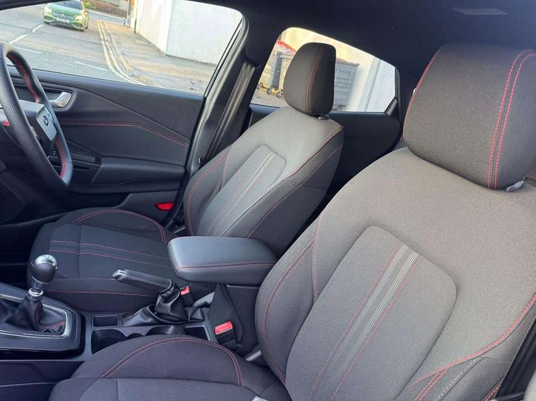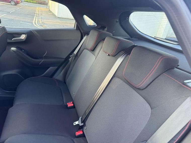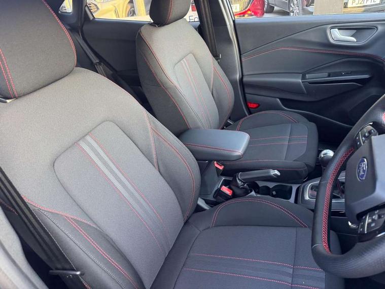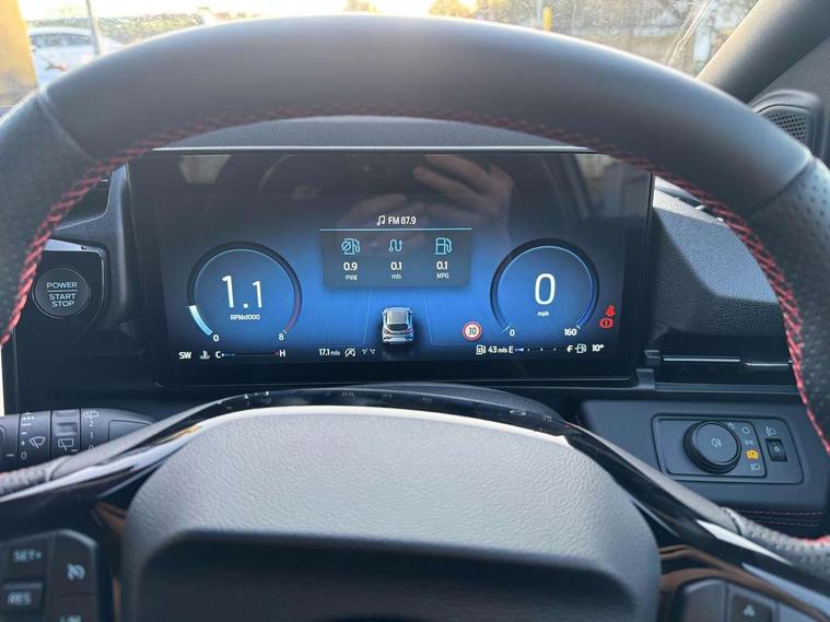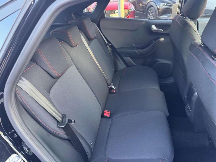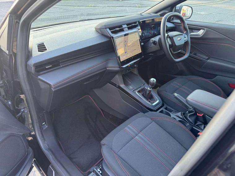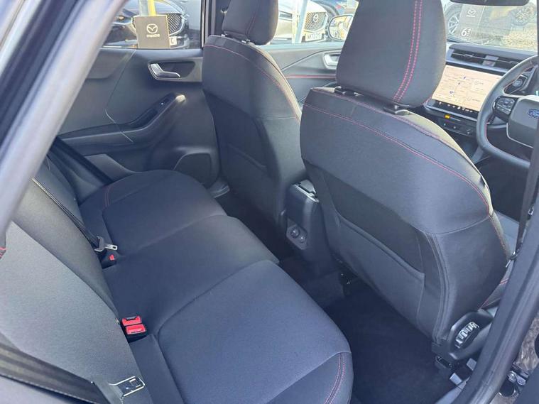 Driver impairment monitor, Emergency call service, Ford easy fuel, Full digital 12.8" instrument cluster, Lane keeping aid with lane departure warning, Power assist steering, Selectable drive modes(Normal, Eco, Sport, Slippery and Trail), Speed sign recognition, Sport suspension, 12" landscape touchscreen display with wireless apple car play and android auto 6 speaker audio system, Ford pass connect and emergency assistance, Ford SYNC4 with connected navigation, Automatic headlights with rain sensing wipers and auto high beam, Front fog lamps, LED daytime running lights, LED rear lamps, LED third brake light, Power foldable heated door mirrors with puddle lamps and puma logo protection, Quickclear heated windscreen, Rear privacy glass, Rear side wing doors, Rear wiper, ST-Line body styling kit with unique grille, 3 seat bench in 2nd row, Centre console with armrest and stowage, Electronic automatic temperature control (EATC), Ford megabox extended bootspace, Front and rear head restraints, Front floor mats, Manual 4 way driver seat adjust with lumbar adjustment, Single front passenger seat, ST- Line cloth trim with red stitching, 3 rear seatbelts, Child safety lock, Electronic stability control (ESC) and hill start assist, Pre-collision assist with autonomous emergency braking, pedestrian/cyclist detection & post-collision braking, Tyre pressure monitoring system (TPMS), Thatcham alarm,