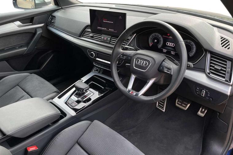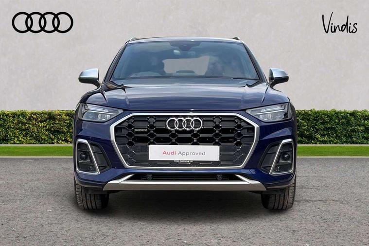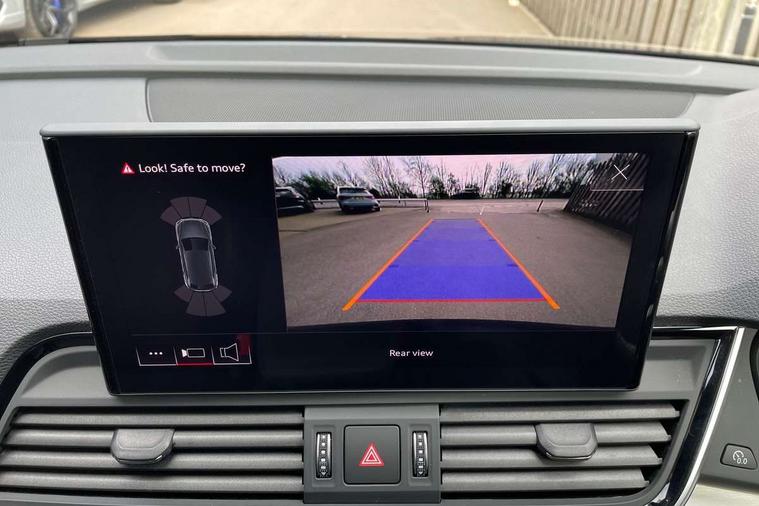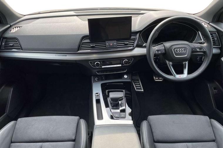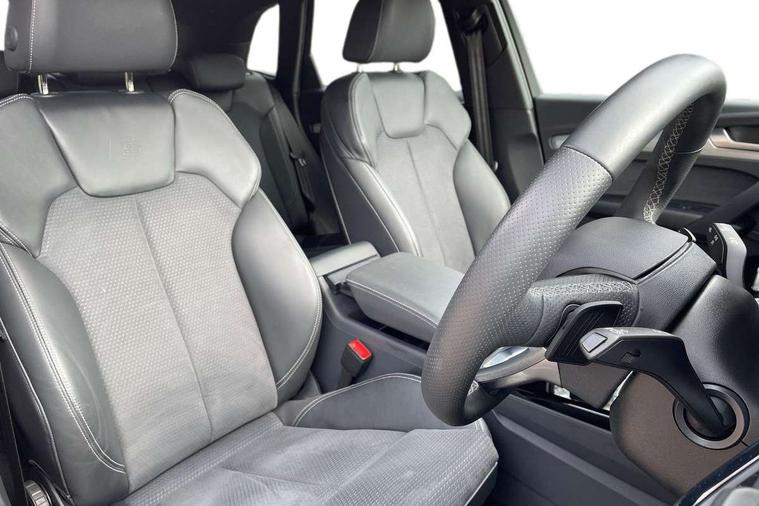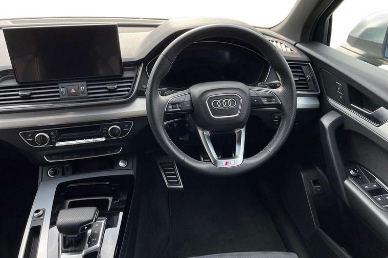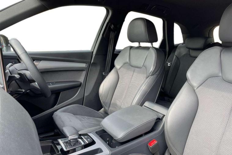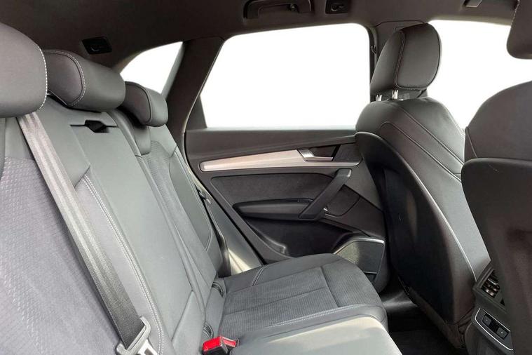 Acoustic front and rear parking sensor, Audi connect safety and service (e-call), Audi drive select, Audi virtual cockpit plus with 12.3" screen and three different layout designs, Audi wireless smartphone interface, Automatic start-stop system with coasting functionality and efficiency programme, Bluetooth interface, Camera based traffic sign recognition, Electro - mechanical power assisted steering, Lane departure warning, MMI navigation plus with 10.1" touch screen, Power tailgate, Reversing camera, Service interval indicator, Voice control system with Audi hotword activation "Hey Audi", Quattro on demand, S line sports suspension, 8 loudspeakers, DAB Digital radio, Acoustic windscreen, Aluminium roof rails, Auto dimming door mirrors, Auto dimming frameless rear view mirror, Automatic headlight adjustment, Automatic headlights and windscreen wipers, Body colour bumpers, Body colour door mirrors, Body colour rear diffuser with matt aluminium silver surrounds, Body colour underbody protection, Chrome plated exhaust trims, Daytime running lights, Door sills in Selenite silver, Electric adjustable/heated/folding door mirrors, Front air inlet surrounds in aluminium, Front and rear electric windows, Front radiator grille in honeycomb design, LED 3rd brake light, LED headlights and LED tail lights, Loading edge protection in stainless steel, Lower bumpers painted in contrast Manhattan grey, Rear chrome trim strip below lights, Rear privacy glass and rear side windows, Rear side wing doors, Rear wiper, Roof bars, S Line badges on the front wing panels, S Line front and rear bumpers, S Line rear spoiler, S Line side skirts, 2 x USB charging port with aux input socket, 3 rear headrests, 3 spoke leather multifunction steering wheel with S badging perforated leather grips, Black cloth headlining, Comfort front centre armrest, Contrast stitching on seats, steering wheel and gear lever gaiter, Deluxe 3 zone electronic climate control, Front head restraints, Front sport seats with S embossed logo, Front/rear floor mats, Gear lever in black leather, Heated front seats, Height/reach adjustable steering column, Illuminated door sill trims with S logo, Luggage compartment cover, Manual seat adjustment with 4-way electric lumbar support, Single front passenger seat, Stainless steel pedals, Sunvisors with vanity mirrors, Top surface of the rear centre armrest in artificial leather, High gloss pack - Q5, LED interior light pack - Q5, 3 point seatbelts on all seats, 6 airbags - Driver, front passenger, curtain and side airbags, Attention and drowsiness assist, Electrically operated child locks on rear doors, Electromechanical parking brake, Electronic stabilisation control including ABS, ASR and EDL, First aid kit with warning triangle and vests, Front passenger airbag deactivation, Hill descent control, Hill hold assist, ISOFIX child seat mounting for front passenger seat and ISOFIX child seat mounting with Top Tether for outer rear seats, Multi collision brake assist, Pop-up bonnet for pedestrian protection, Pre sense city, Seatbelt monitoring, Tyre pressure warning, Anti theft alarm, Anti-theft wheel bolts, Remote central locking, Remote control key with SAFELOCK and keyless go, Air vents inserts and centre console in gloss black, Matt brushed aluminium inlays, Tool kit, Tyre repair kit,