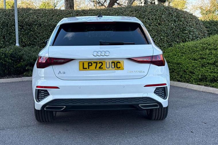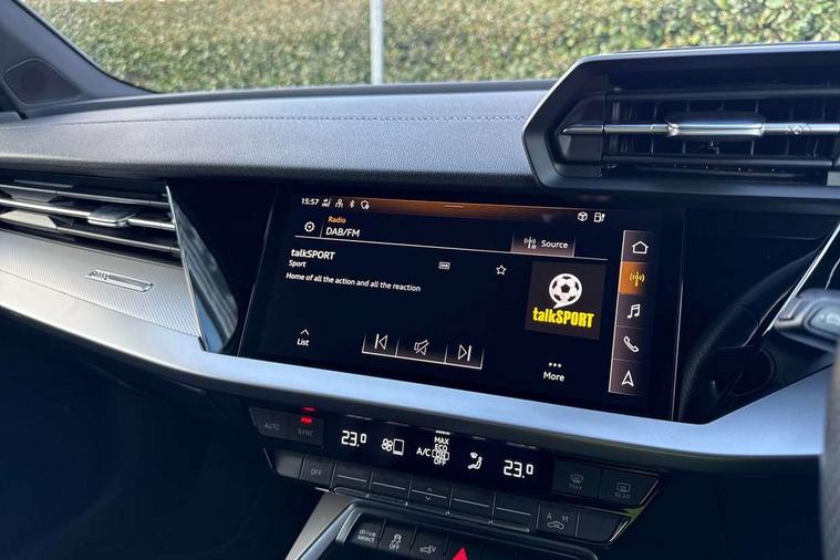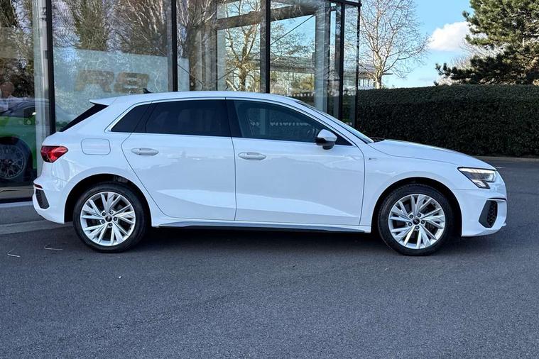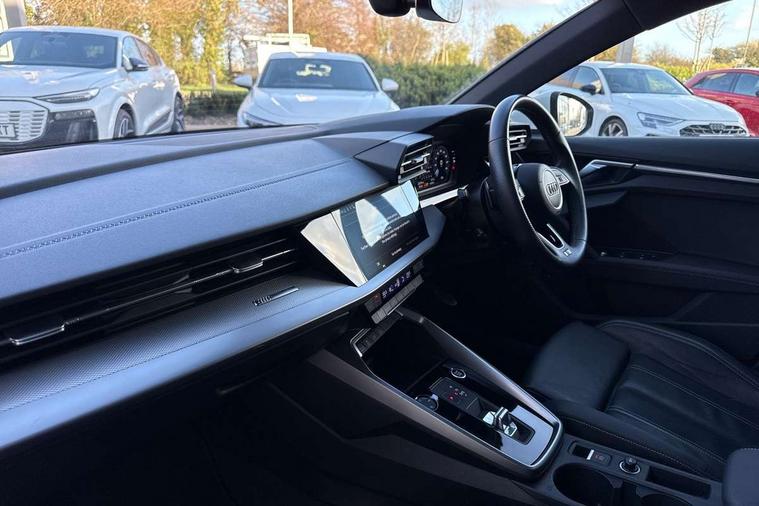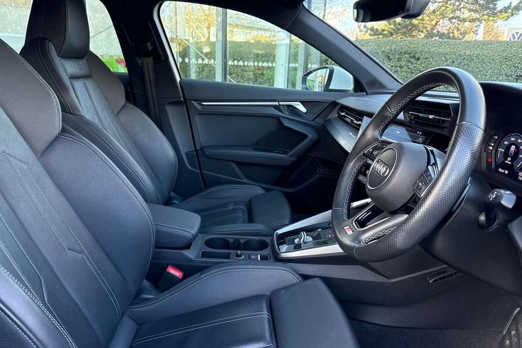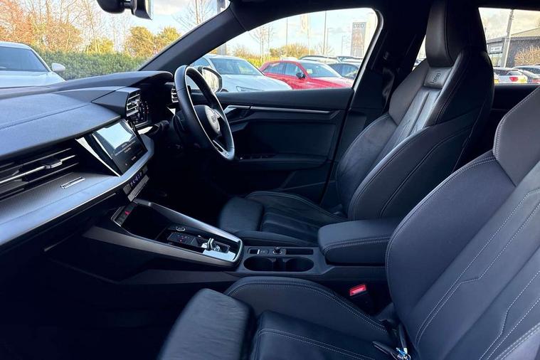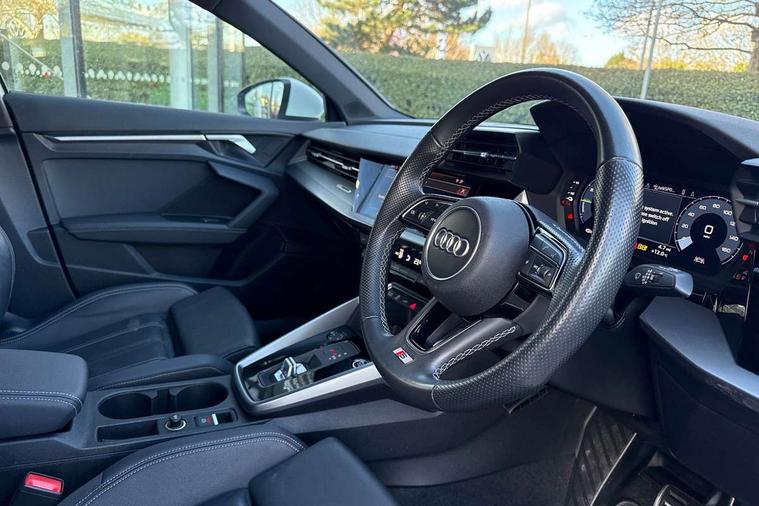 Audi drive select (Auto, Comfort, Dynamic, Efficiency and Individual), Audi smartphone interface, Audi Virtual Cockpit - 10.25" digital and colour instrument cluster, Automatic start/stop system with recuperation, Bluetooth interface, Collision avoidance assistant, e-Call (emergency call), Electromechanical power speed sensitive steering, Lane departure warning system, MMI Navigation Plus with high resolution 10.1" colour touch screen display, Service indicator, Trip computer, Voice control system with natural language interaction, 3 pin 10 amp domestic charging cable, 3.6 kw On-board charger, Standard suspension, Type 2 mode 3 32 amp charging cable, Type 2 socket for AC charging, 2xUSB-C connection with data and charging functions, 6 passive loudspeakers, DAB Digital radio, 3rd brake light, Acoustic glass windscreen, Aluminium window trim, Auto dimming frameless rear view mirror, Electrically adjustable/heated/folding/auto dimming door mirrors with integrated LED indications + kerb view function for passenger side, Front electric windows, Illuminated aluminium inserts front door sills with S logo, LED daytime running lights, LED headlights with LED rear lights and dynamic rear indicators, Light and rain sensors, Privacy glass - dark tinted rear window, rear door and side windows, Rear electric windows, Rear side air outlets in grained matt black, Rear side wing doors, Rear wiper, S line bumpers, S roof spoiler, 12V socket and storage compartment in front centre console, 3 seat bench in 2nd row, 40/20/40 split folding rear seat bench with cupholder, Black cloth headlining, Dual zone electronic climate control, Front and rear centre armrest in leather, Front and rear headrests, Front/rear floor mats, Height and reach adjustable steering wheel, Illuminated vanity mirror, Interior lighting - glove compartment light and right hand side, Luggage compartment floor covering, Manual boot compartment lid, Manually adjustable front seats, Seat side bolsters, Single front passenger seat, Stainless steel pedals and front footrest in black, Twin leather upholstery with front sports seats S embossed logo, Aluminium interior elements pack - A3 Sportback, LED interior lighting pack - A3 Sportback, S line styling pack - A3 Sportback, 3x3 point rear seat belts, Audi pre sense front, Driver and front passenger airbag with passenger airbag deactivation, Electronic Stabilisation Control (ESC) including ABS, ASR and EDL, First aid kit with warning triangle and 2 safety vests, Front side airbags with head airbags and interaction airbag, Pre-sense front with pedestrian and cyclist detection, Seatbelt monitoring, Tyre pressure loss indicator, Anti theft alarm, Anti-theft wheel bolts, Electronically operated child lock, Immobiliser, Remote control central locking, Accent surfaces in the dashboard and centre console in platinum grey silk effect paint finish, Dark spectrum aluminium inlays, Tool kit, Tyre repair kit,