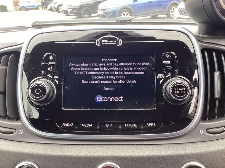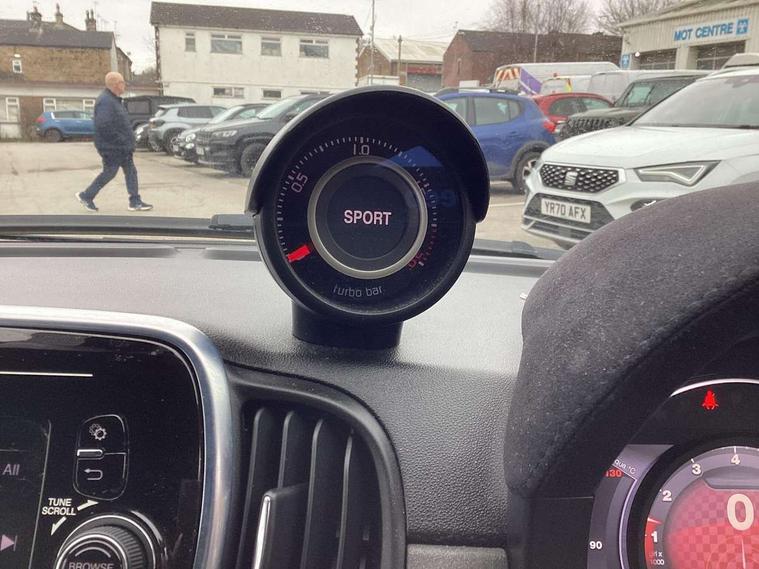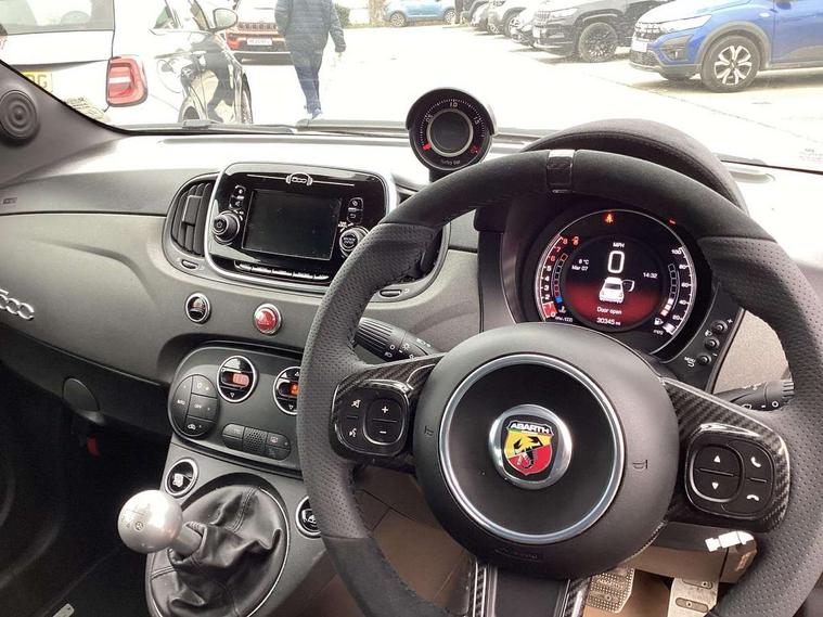 Dualdrive PAS, Rear parking sensors, Sports button, TFT display screen, Trip computer, U-connect access via mobile, Koni rear suspension with FSD technology (Frequency Selective Damping), Sports suspension, Torque transfer control (TTC), Bluetooth audio streaming, Anthracite bumper inserts, Body coloured bumpers, Dark tinted rear windows, Dual mode record monza exhaust system with four tailpipes, Electric front windows, Front fog lights, LED daytime running lights, Rear wiper, 12V socket, Abarth corsa front seats by sabelt in fabric, Aluminium gear knob, Aluminium sports pedals, Auto climate control, Front head restraints, Glovebox, Height adjustable steering wheel, High performance BMC air filter, Interior stowage net, Rear headrests, Sports alcantara leather multifunction steering wheel with carbon fibre detailing, 3x3 point rear seatbelts, ABS, Brembo brakes, Drilled and ventilated front brake discs, Drilled rear brake discs, Driver and passenger airbags, Drivers knee airbag, ESP + ASR/MSR + HBA + Hill holder, Tyre pressure monitoring system, Window airbags, Alarm, Central locking, Immobiliser, Remote central locking, Fix and go kit,