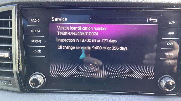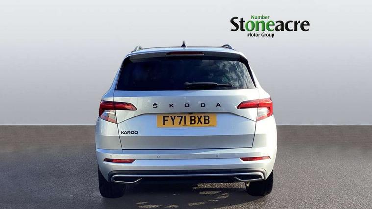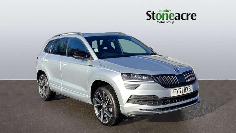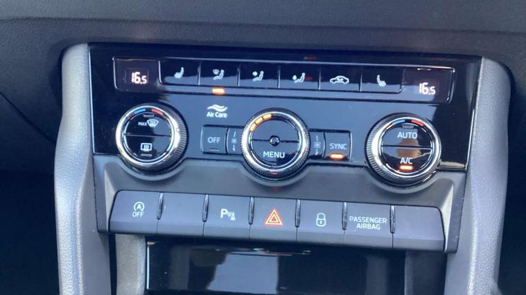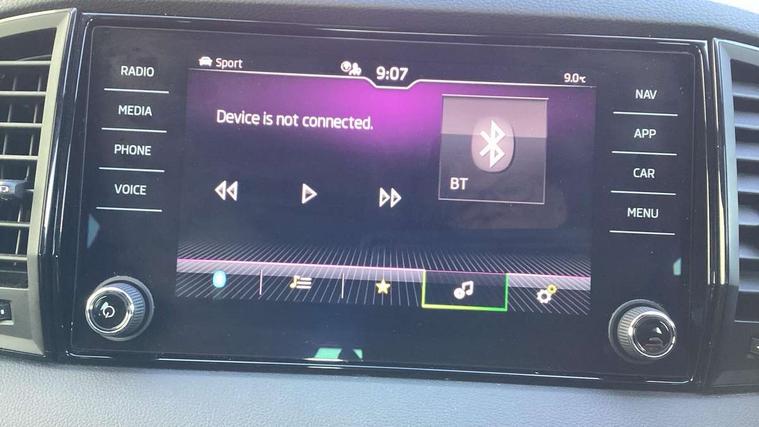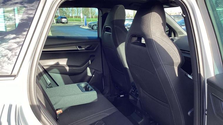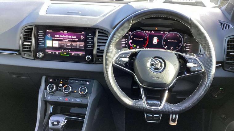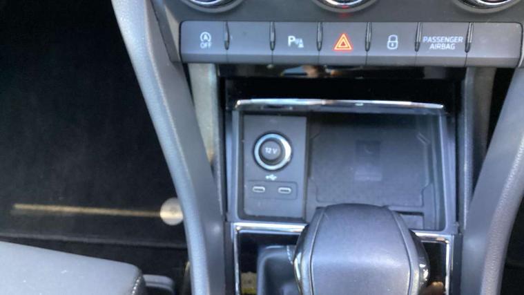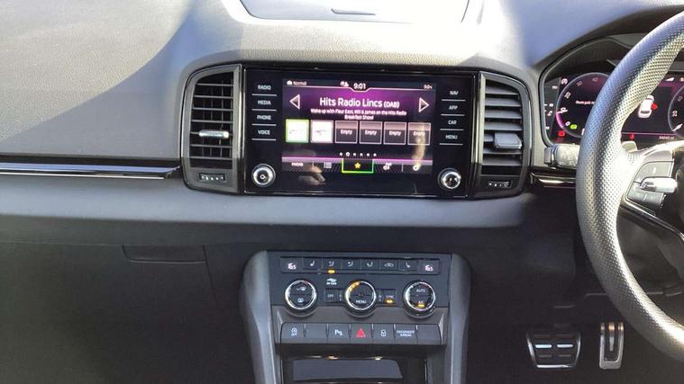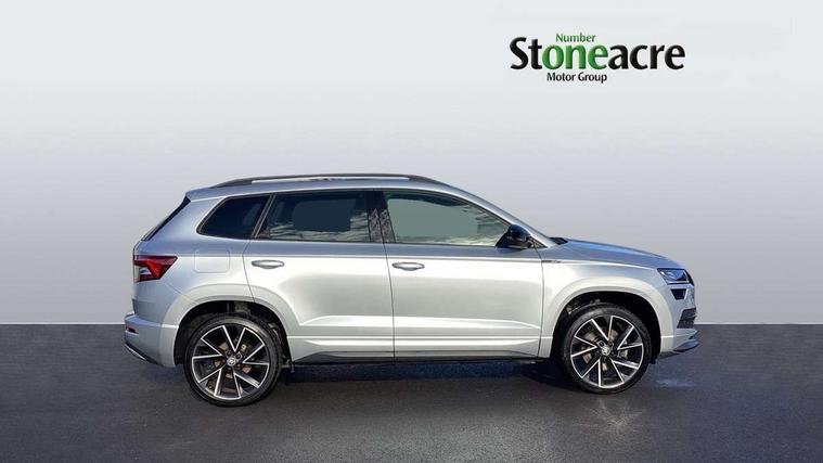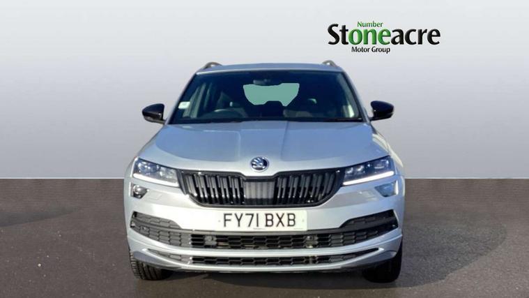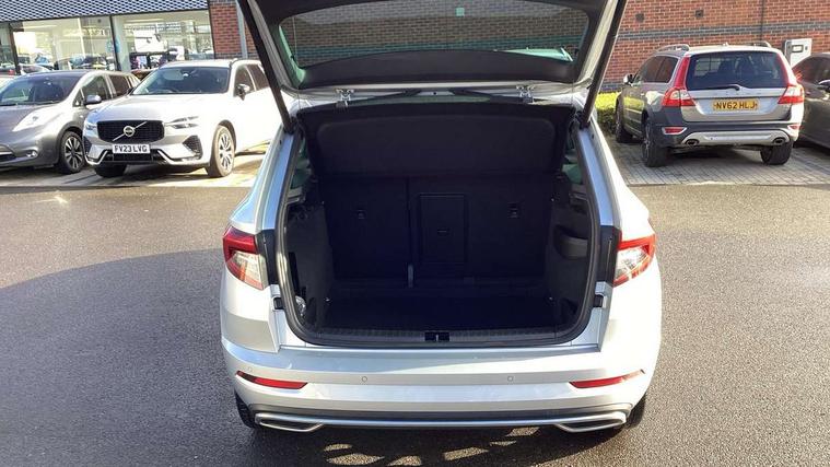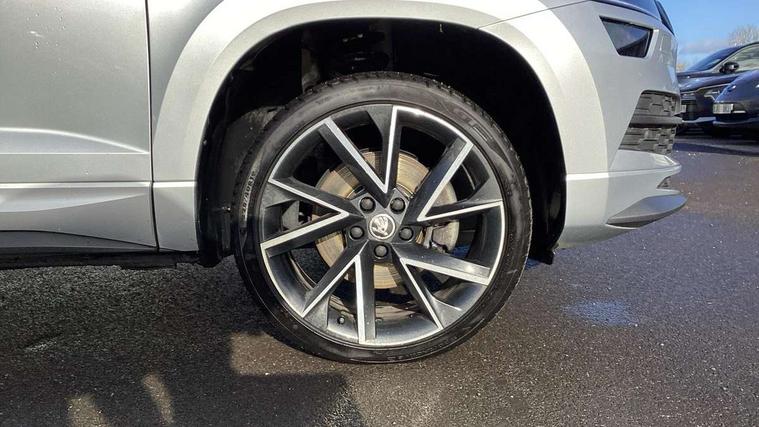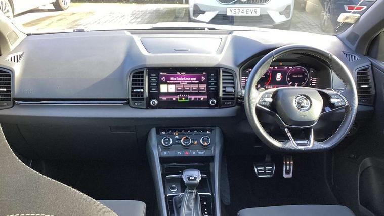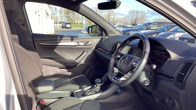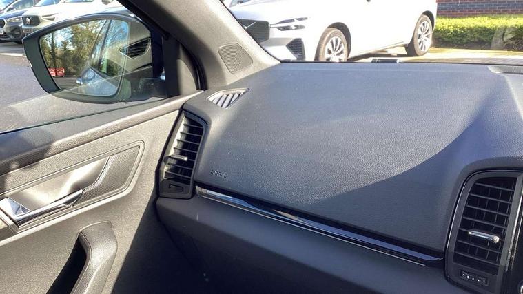 Care connect, Drive mode selector, Driver fatigue sensor, Multifunction colour trip computer, Outside temperature gauge, Service interval indicator, SmartLink wireless for Apple and wired for Android, Start/stop system with regenerative braking, USB C Port x 2 in front centre console, DAB radio with Bluetooth, USB connection, Wireless charging without wireless aerial connection, Acoustic glass, Aero front windscreen wipers with intermittent function, Automatic headlight control system, Black door mirrors, Black electric window control buttons, Black radiator grille, Black roof rails, Body colour door handles, Body coloured bumpers, Electric front and rear windows with child proof lock, Front door steps with SportLine logo, Full LED headlights + adaptive front light system + LED daytime running lights and front cornering fog lights, Headlight washers, Heated rear windscreen, LED rear lights with high functionality, Light assistant (coming/leaving home/tunnel light), Panoramic sliding sunroof, Privacy glass, Protective door side sills in body colour, Rear diffuser, Safety reflectors on front doors, Skoda lettering on tailgate in black, Sportline badge on front fender, Sportline decorative inserts with badging, Sports front and rear bumpers, Third brake light, 1.5 litre bottle holders in driver and front passenger door panels, 12V socket in boot, 12v socket in front centre armrest with storage compartment and rear air vents, 2 Folding hooks and nets in boot, 2 Front readings lights for driver and passenger, 3 rear height adjustable headrests, 4 foldable roof handles with rear coat hooks, Aluminium pedals, Black roof headlining, Cargo elements in boot, Chrome inner door handles, Door sill scuff plates, Driver and passenger seats height adjust, Front head restraints, Height adjustable front three point seats belts with tensioners, Height/reach adjust steering wheel, Ice scraper, Illuminated and cooled glovebox, Illuminated luggage compartment, Isofix child seat preparation outer rear, Manual lumbar support for front seats, Net programme in boot, Pen holder, Pollen filter, Rear reading lights, Rear seats fixed folding and divided 60:40, Retractable parcel shelf attachable to tailgate, Safety vest holder, Solid rear boot cover, Storage box in upper central dashboard closed, Storage compartment below the passenger seat, Sunvisors with illuminated vanity mirrors, Textile floor mats, Umbrella under passenger seat, Welcome animation with sportline logo, LED Interior lighting pack with Skoda welcome logo - Karoq, Airbags - Front side, head, knee and curtain, Automatic door unlocking in case of crash, Automatic fuel cut off in case of crash, Driver airbag, Electronic parking brake with auto hold function, Emergency rear braking signal, ESC including ABS, MSR, ASR, EDS, HBA, DSR, RBS, MKB and traction control, Front assist radar scanning of the space in front of the car with automatic braking, Hill hold control, Passenger airbag with switch-off function, Pedestrian monitor, Seatbelt reminder signalisation and pretensioner for all seats, Three point seatbelts rear, Two tone horn, Tyre pressure display, Tyre pressure monitor, Alarm with interior monitoring, back up horn and tilt sensor with safe function, Electronic engine immobiliser, Keyless entry and keyless start with safe system, Remote central locking with 2 remote folding keys, Black air vent surround, 19" Vega anthracite alloy wheels, Anti-theft wheel bolts protection, Storage on wheel cover,