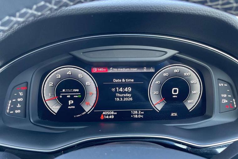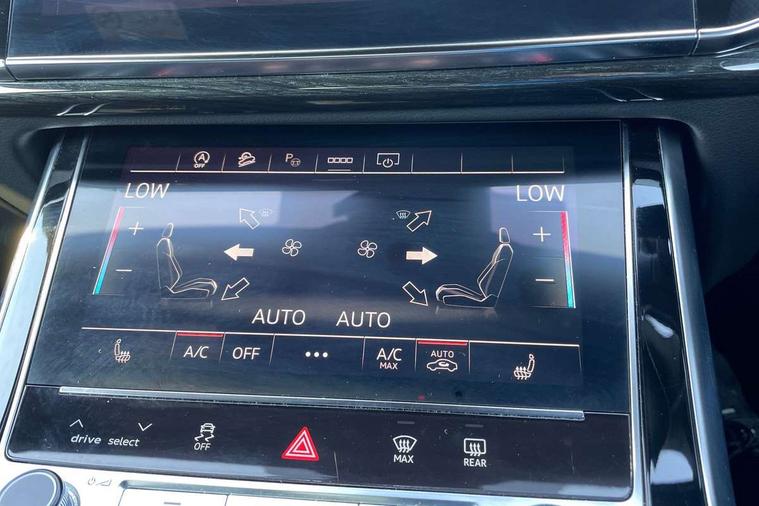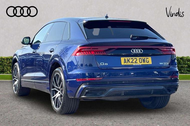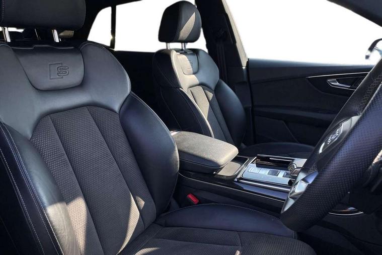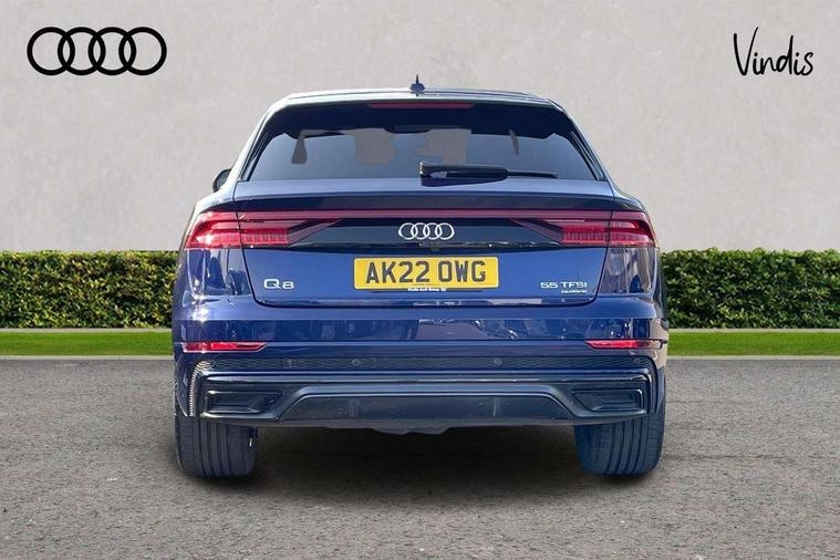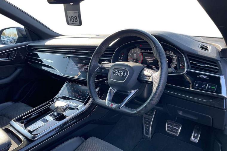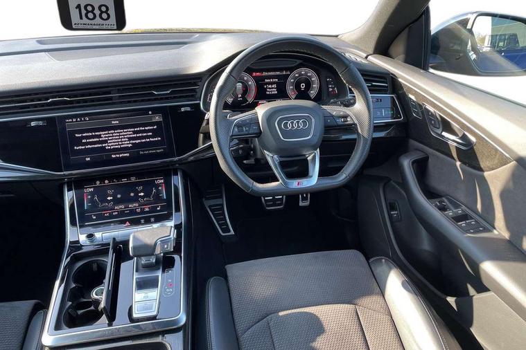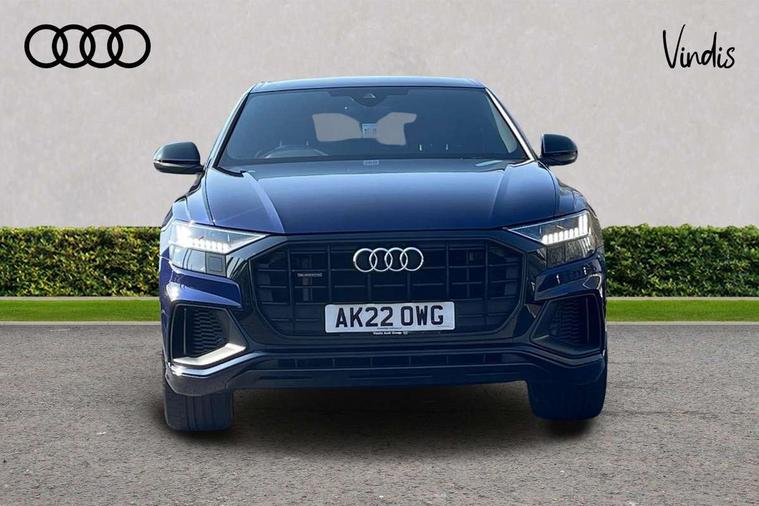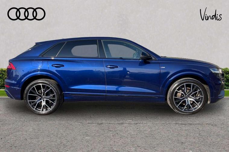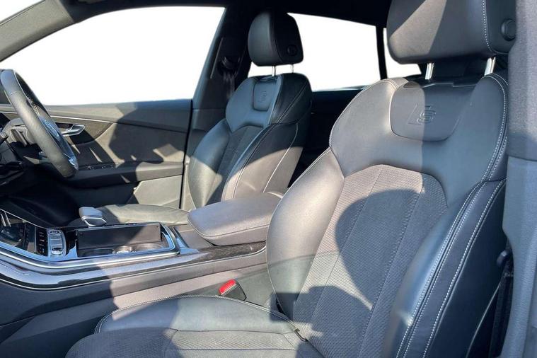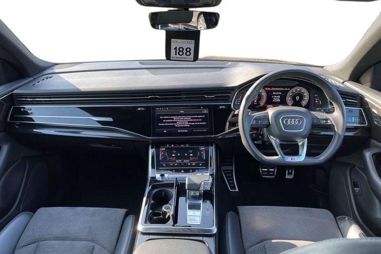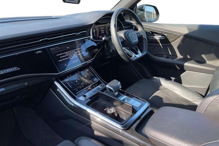 10.1" and 8.6" Dual colour touchscreens, Audi connect safety and service (e-call), Audi connect with Amazon Alexa Integration, Audi drive select, Audi parking system plus includes 360 degree display with front and rear sensors, Audi smartphone interface includes wireless Apple carplay/Android Auto, Audi virtual cockpit - 12.3" high resolution LCD display with fully customisable instrument cluster, Automatic start/stop system, Electro-mechanical PAS, Low washer fluid indicator, MMI - Multi Media Interface control system, MMI navigation plus with MMI touch, Natural voice recognition, On board computer, Operating buttons in black, glass look with haptic feedback, Power operated tailgate, Rear view camera, Service interval indicator, 48V Mild hybrid technology, 85 litre fuel tank, Adaptive sport air suspension, Quattro all wheel drive with self locking centre differential, Audi music interface with 2 USB ports with charge and data functions, Audi sound system with 6 channel amplifier, 180 watt amplifying capacity and 10 loudspeakers including subwoofer, Aux-in socket, DAB Digital radio, 3rd brake light, Acoustic windscreen, Audi HD Matrix LED headlights with dynamic front and rear indicators, Auto dimming frameless rear view mirror, Coming/leaving home lighting function, Electric front+rear windows, Electrically folding auto dimming/adjustable/heated door mirrors with memory function, LED side indicators and kerb view function for passenger side, Headlight washers, Heat insulating glass in windshield, LED signature daytime running lights, Platinum grey front spoiler lip and diffuser insert, Privacy glass - dark tinted rear and rear side windows from B-pillar backwards, Rain and light sensors, Rear side wing doors, Rear wiper, 4 zone deluxe automatic climate control, 4-way lumbar support for front seats, 40:20:40 split folding rear bench seat, Black cloth headlining, Comfort front centre armrest, Driver seat memory function, Electrically adjustable front seats, Front head restraints, Front/rear floor mats, Heated front seats, ISOFIX child seat mounting for front passenger seat and 2 outer rear seats with top tether child seat mounting for all 3 rear seats, LED interior ambient lighting, Luggage compartment sill protection in stainless steel, Rear centre armrest with 2 cupholders, Rear headrests, Rear seat bench plus, Single front passenger seat, Stainless steel pedals, Sunvisors with illuminated vanity mirrors, Tool kit, Titanium Black Styling Pack - Q8, 3 point seatbelts on all seats, Audi pre sense front, Child locks on rear doors, Driver and front passenger, front side and curtain airbags, Electromechanical parking brake, Electronic Stability Control (ESC) including ABS, ASR and EDL, Front passenger airbag deactivation, Hill descent control, Hill hold assist, Predictive pedestrian protection, Seatbelt monitoring, Traction control, Tyre pressure loss indicator, Warning triangle and first aid kit, Anti theft alarm with tow away protection, Anti-theft wheel bolts and wheel loosening detection, Immobiliser, Keyless go with remote central locking, Polished oak trim with grey finished, Tyre repair kit,