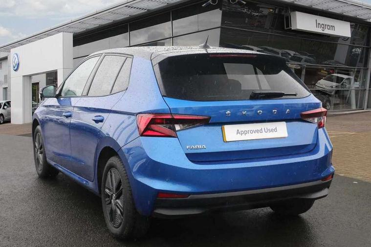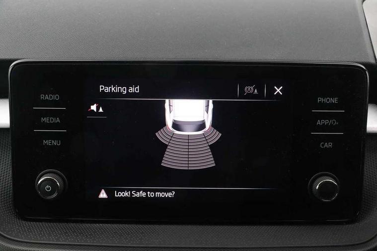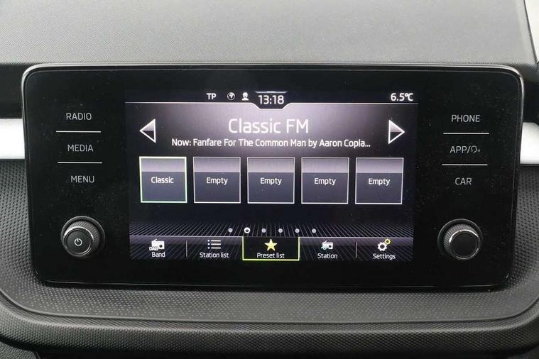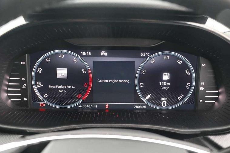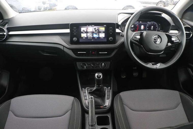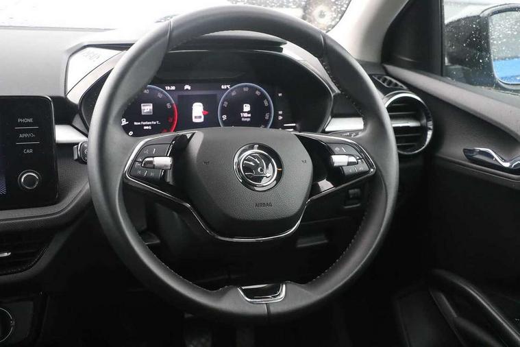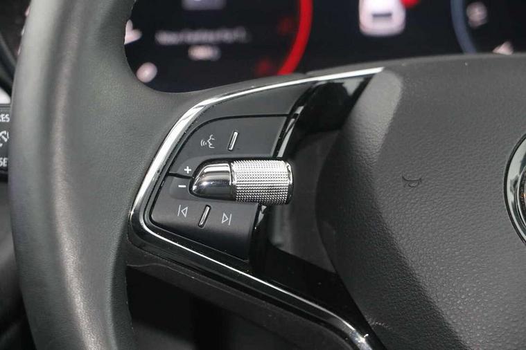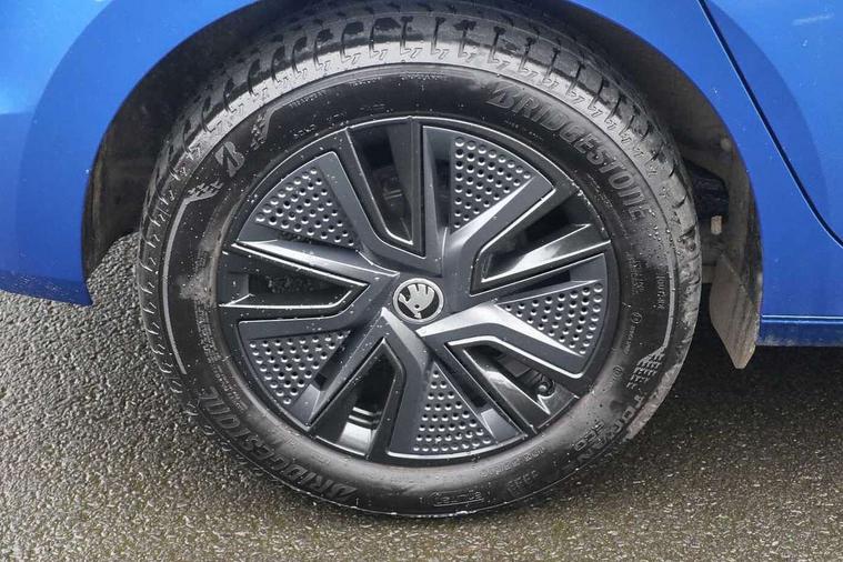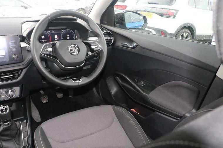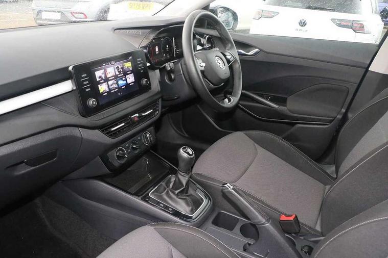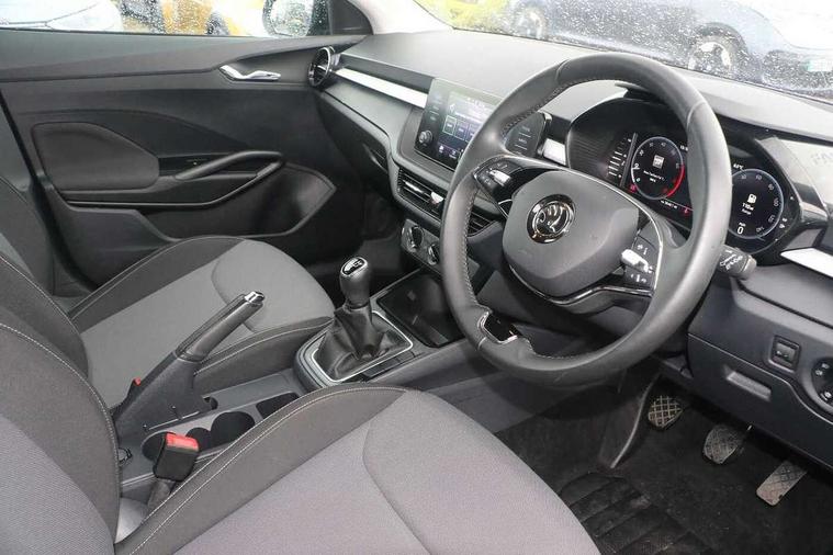 Bluetooth connection, Driver alert system - DAS, Electromechanical power steering, Exterior temperature gauge, Lane assist including road edge detection, Service interval indicator, Virtual cockpit with 10.25" colour display, 2x USB-C in the front (for data transmission and charging), 6 Speakers (4 in front and 2 in rear), Auxiliary socket for external MP3 player, Bolero radio with 8" colour display, DAB digital radio reception, Basic LED Headlights, Body coloured bumpers, Dimming rear view mirror with black frame, Door mirror integrated indicators, Electrically adjustable and heated door mirrors, Electrically adjustable front windows with function auto up/down, Front fog lights, Front window wiper intermittent control, Headlight range control - Automatic, Ice scraper in fuel cap, LED daytime running lights with coming and leaving home feature, Mechanical adjustable rear windows, Privacy glass, Rain sensor, Rear LED fog light, Rear side wing doors, Rear window wiper with washing nozzles, Roof mounted spoiler, SKODA tailgate lettering in chrome, Third brake light, 2 reading lights in front and 2 reading lights in rear, 3 rear headrests, Backrest split and folding, Central console with fixed cup holder and storage box, Chrome handbrake release button, Fabric upholstery, Gearshift knob/handle in leather, Grain satin black interior door handles, Hand brake lever handle in leather, Height adjustable drivers seat, Height adjustable front headrests, Height adjustable steering wheel, ISOFIX and TopTether anchorage points to the outer rear seats, ISOFIX and TopTether on the front passenger seat, Luggage compartment lighting, Pollen filter, Rear seat bench unsplit, Single front passenger seat, Storm grey headlining, Sun visors with mirror and airbag label on passenger side, Ticket holder, Umbrella in drivers door, 3-point height adjustable front seats belts with pretensioner and force limiter, Automatic warning lights in case of crash, Driver and passengers airbag with switch off function, e-Call+, ESC including ABS, MSR, ASR, EDS, HBA and XDS, Front and rear seat belt warning, FRONT ASSIST (AEB City and AEB Inter Urban), Front side airbags, Head airbags, One tone horn, Pedestrian protection, Three rear 3-points safety seat belts with pretensioner and force limiter including stop function for outer rear seat belts, Tyre pressure monitoring system, Anti-theft alarm system including immobiliser, interior monitoring, backup horn, and towing protection, Central locking with radio remote control, interior controls, SAFE function and 2 foldable keys, KESSY - Keyless engine start/stop, Anodized cross line upper decorative trim, Colour Edition air vents, Grain satin black central console cover, Grain satin black lower decorative trim, Satin black door and side trim panel in front, Anti-theft wheel bolts protection, Super-low rolling resistance tyres,
