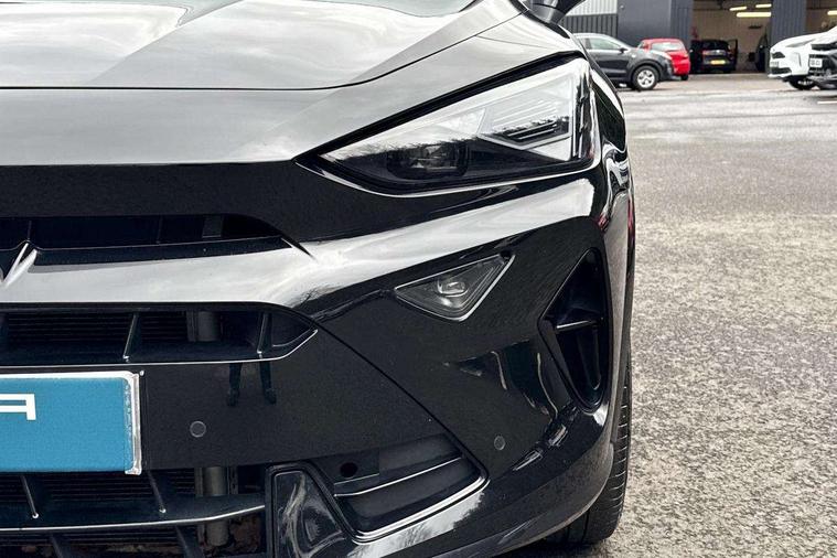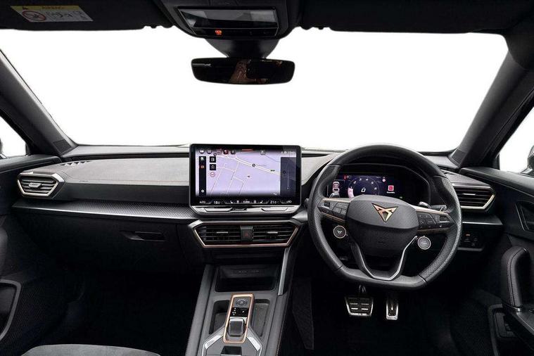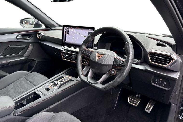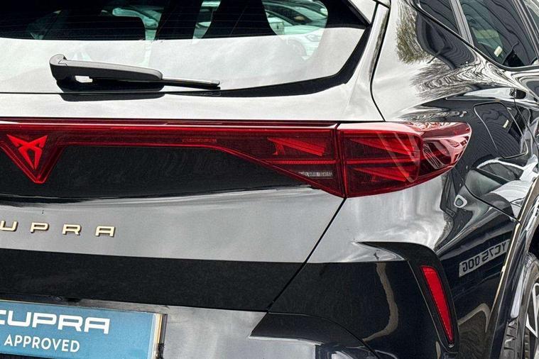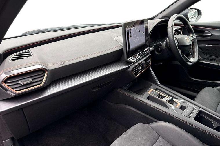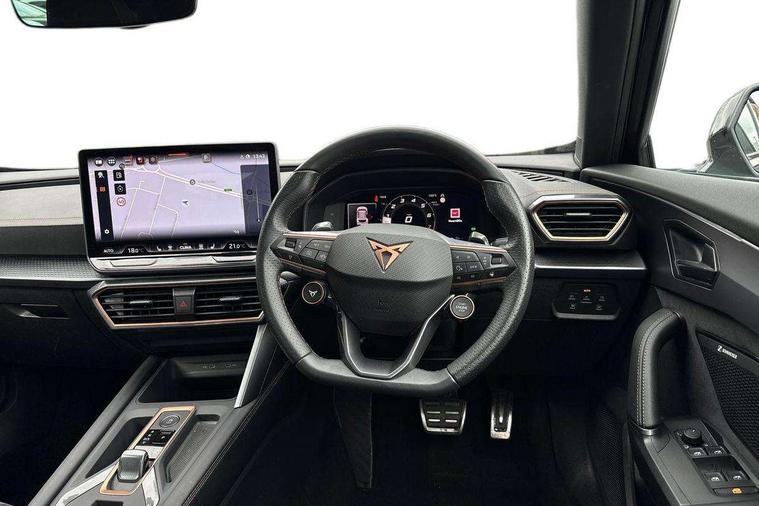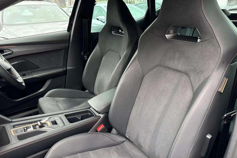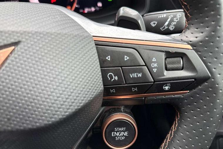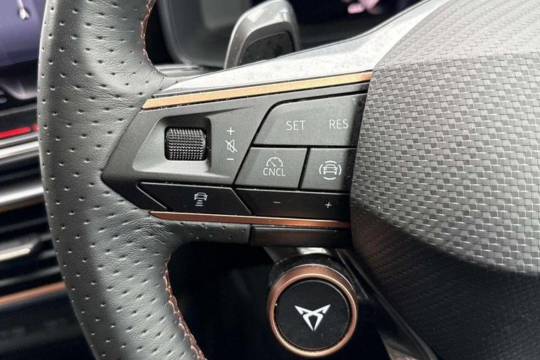 10.25" digital cockpit and configurable dashboard, Adaptive cruise control with follow-to-stop and speed limiter, Advanced driver alert system, Driving profile selection, Dynamic road sign display, Emergency steering support with turn assist, Forward collision warning with automatic braking, Front and rear parking sensors, Full link phone integration, Lane assist, Progressive steering, Rear view camera, RPM, trip computer, outside temp gauge, instrument light brightness, low fuel warning light, lights on reminder, gearshift indicator, Service interval indicator, Start/stop system with regenerative braking, Virtual pedal and electric tailgate, Voice control system, Wired Android Auto, Wireless apple carplay, Wireless phone charger, CUPRA sport suspension, Electronic locking differential and dynamic traction support, 2 front and 2 rear USB type C sockets, Media system with navigation, 12.9" touchscreen display, voice control, DAB, steering wheel mounted controls, Auto dimming rear view mirror, Body colour door handles, Body coloured bumpers, Dark grey wing mirror, Daytime running light with automatic headlight control and coming home feature, Door panel ambient lighting, Dynamic headlight range control, Electric front/rear windows, Electrically adjustable heated and folding door mirrors with memory function, Gloss black roof rails and window surrounds, High beam assist, LED 3rd brake light, LED front fog lamps with cornering function, LED Headlights, LED Taillights with dynamic indicator, Rain sensing wipers, Rear diffuser with black simulated exhaust pipes, Rear fog lights, Rear side wing doors, Rear wash/wipe, Tinted rear windows, Welcome lights (within exterior mirror housing), 12V socket, 2 front and 2 rear reading lights, 3 seat bench in 2nd row, 60/40 split rear bench seat with armrest and mechanical seat release, Black headlining, Black interior roof lining, Cupra sports pedals, Dust/pollen filter, Electrically adjustable driver's seat with memory and lumbar support, Front and rear head restraints, Front centre armrest, Heated front seats, Heated supersports multifunction leather steering wheel with satellite buttons and gear shift paddles, Height/reach adjust steering wheel, Illuminated aluminium doorsteps, Illuminated interior front door sills, Illuminated sunvisor with mirror, Isofix, Leather dashboard, door insert and side trim panel, LED smart wraparound lighting, PVC/Dinamica microfiber upholstery + bucket seats, Satellite steering wheel, Single front passenger seat, Storage pockets on rear of front seats, Three zone climate control with control panel in rear, Variable luggage/load compartment floor, 3 point seatbelts on all rear seats, ABS, Brake control system - ESC and brake booster, Child proof door locks, Driver and front passenger airbags with front passenger airbag de-activation, Electronic parking brake, Front and rear disc brakes, Front side curtain airbags, Hill hold control, Public e-call, Seat belt reminder for front and rear seats, Tyre pressure monitoring system, Anti theft alarm system, KESSY Advanced - Keyless start, keyless entry with SAFELOCK, Locking wheel bolts, Copper and aluminium interior detailing, 19" Sandstorm machined sport black and silver alloy wheels,